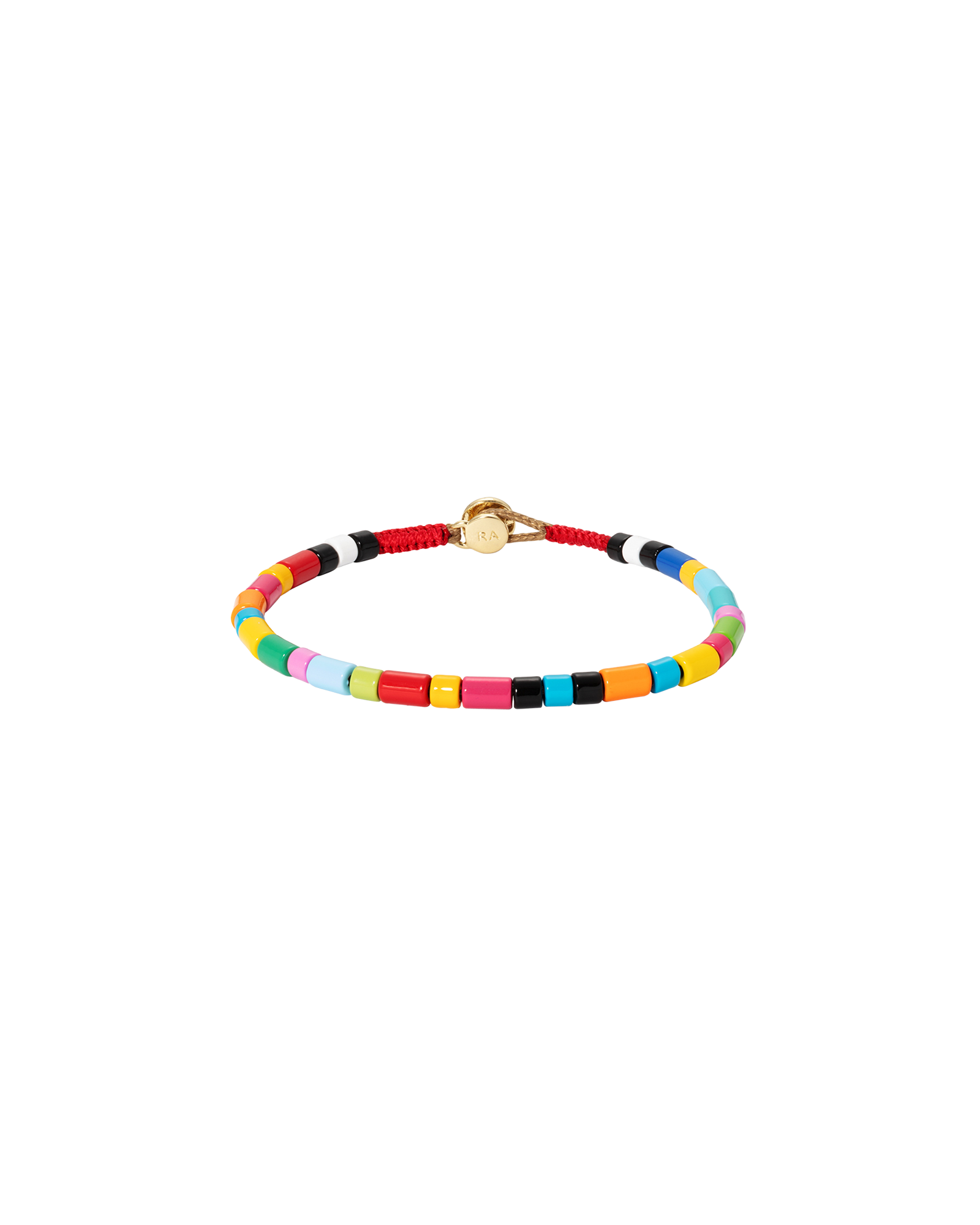 The Starburst U-Tube bracelet is strung with an array of multi-coloured beads and features a button fastening.