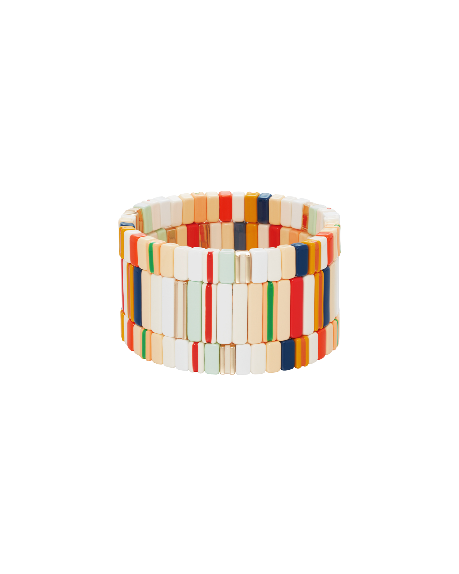 A set of three bracelets strung with an array of hand painted enamel and gold-tone beads. Easy to slip on and off and mix and match.