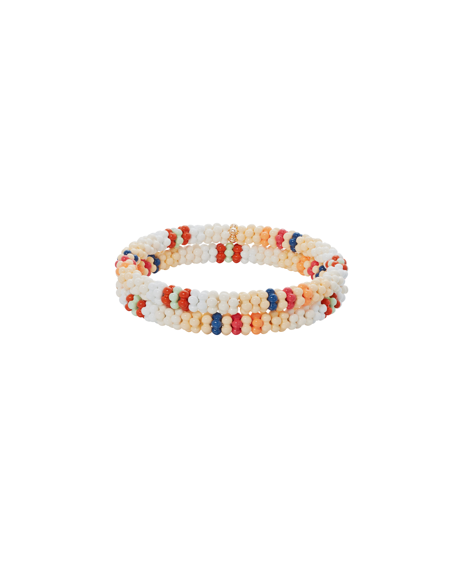 This set of bracelets is strung with an array of enamel, gold, and silver-tone beads. They have an elastic cord that makes them easy to slip on and off and can be mixed and matched.
