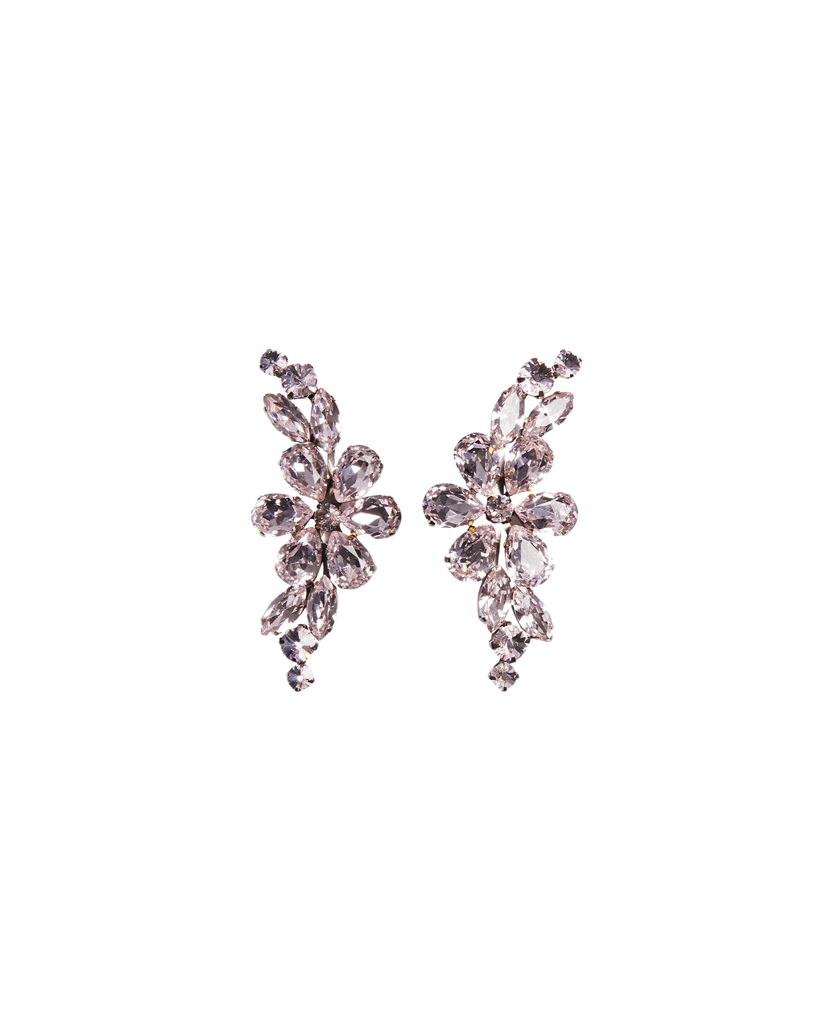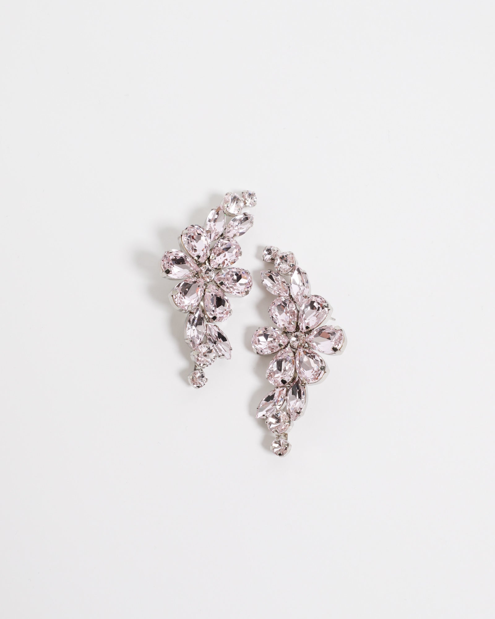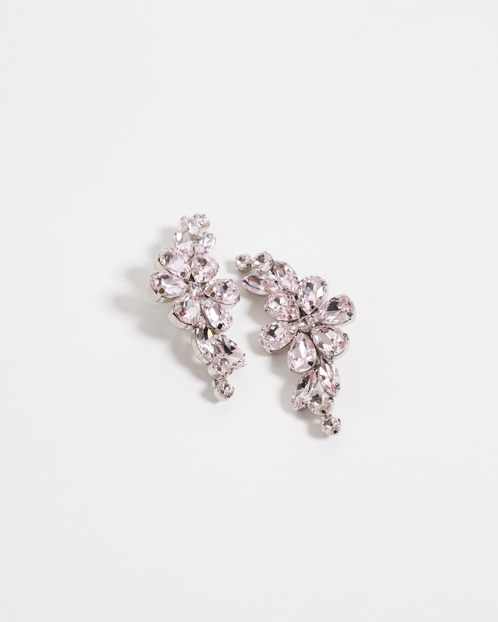 A pair of drop earrings in silver-tone brass, made with prong-set glass crystals and a post-stud fastening.