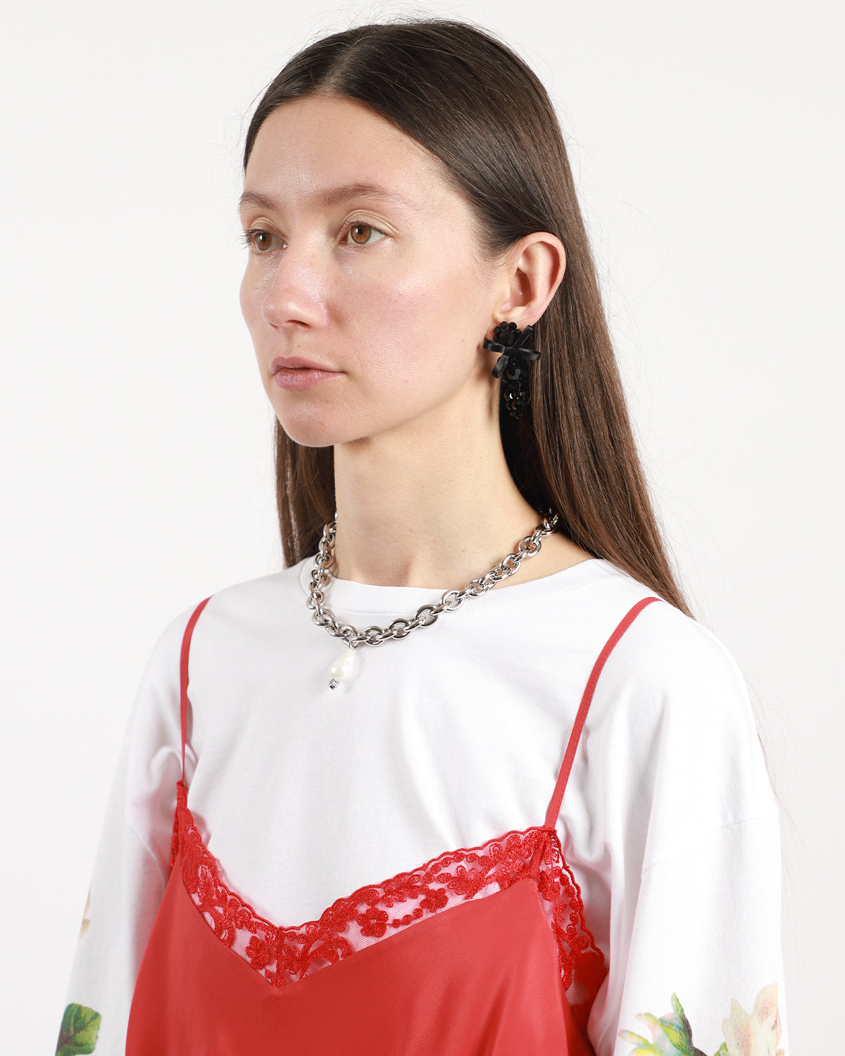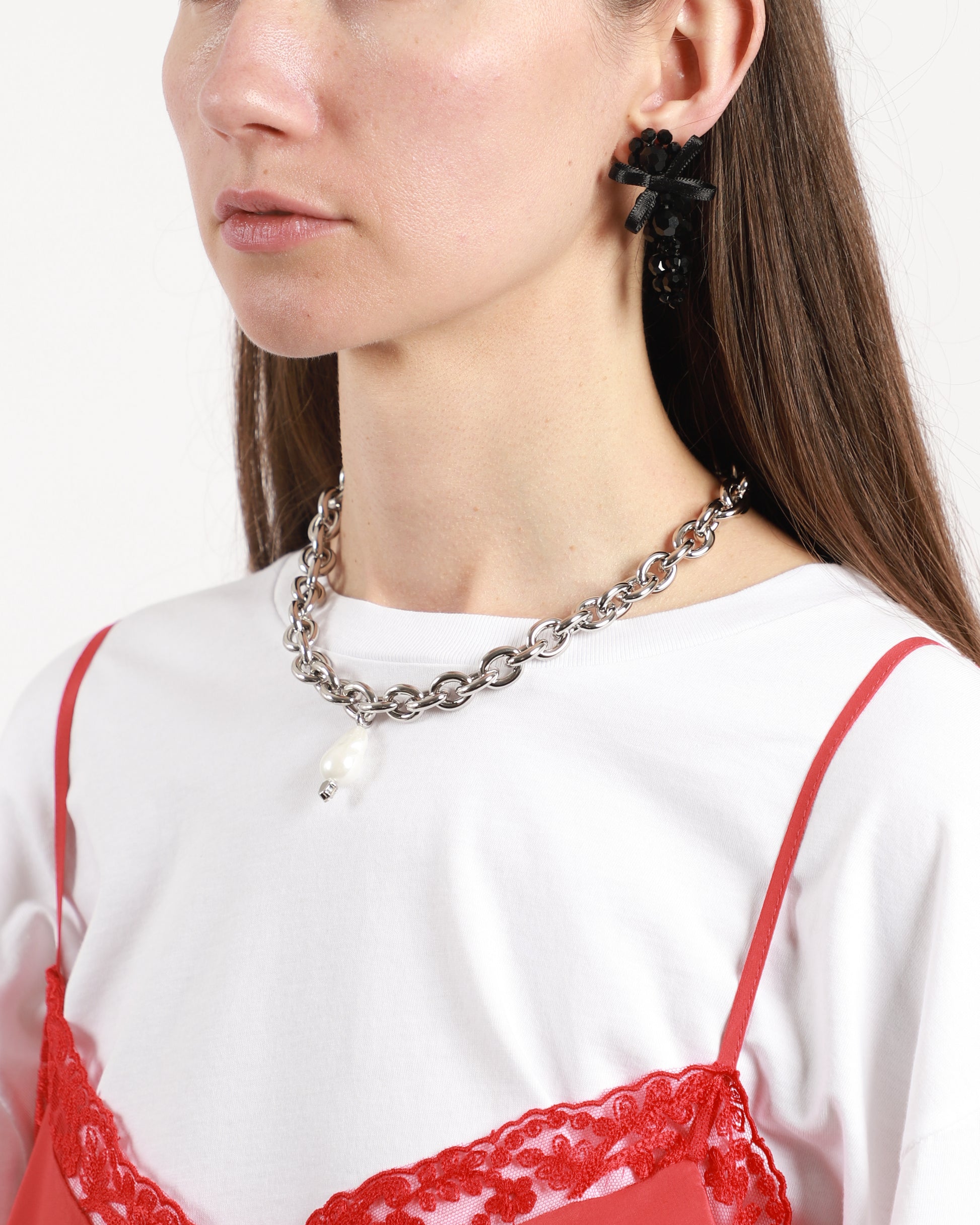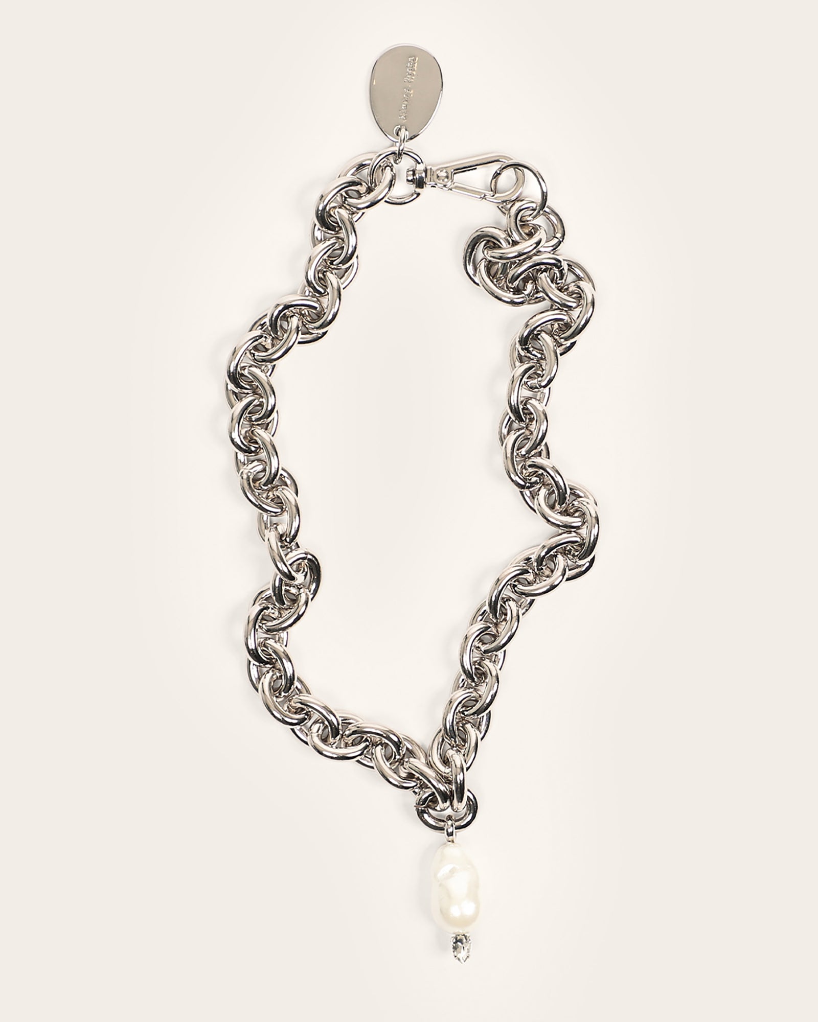 This chain necklace features a pearl pendant accented with a tiny crystal, a signature detail of the brand. The lobster clasp is finished with a branded egg-shaped tag for an extra touch of character. Made in Italy.