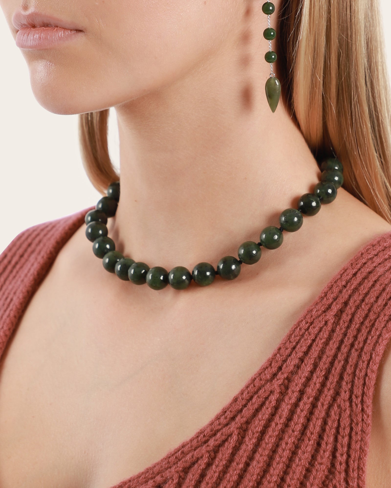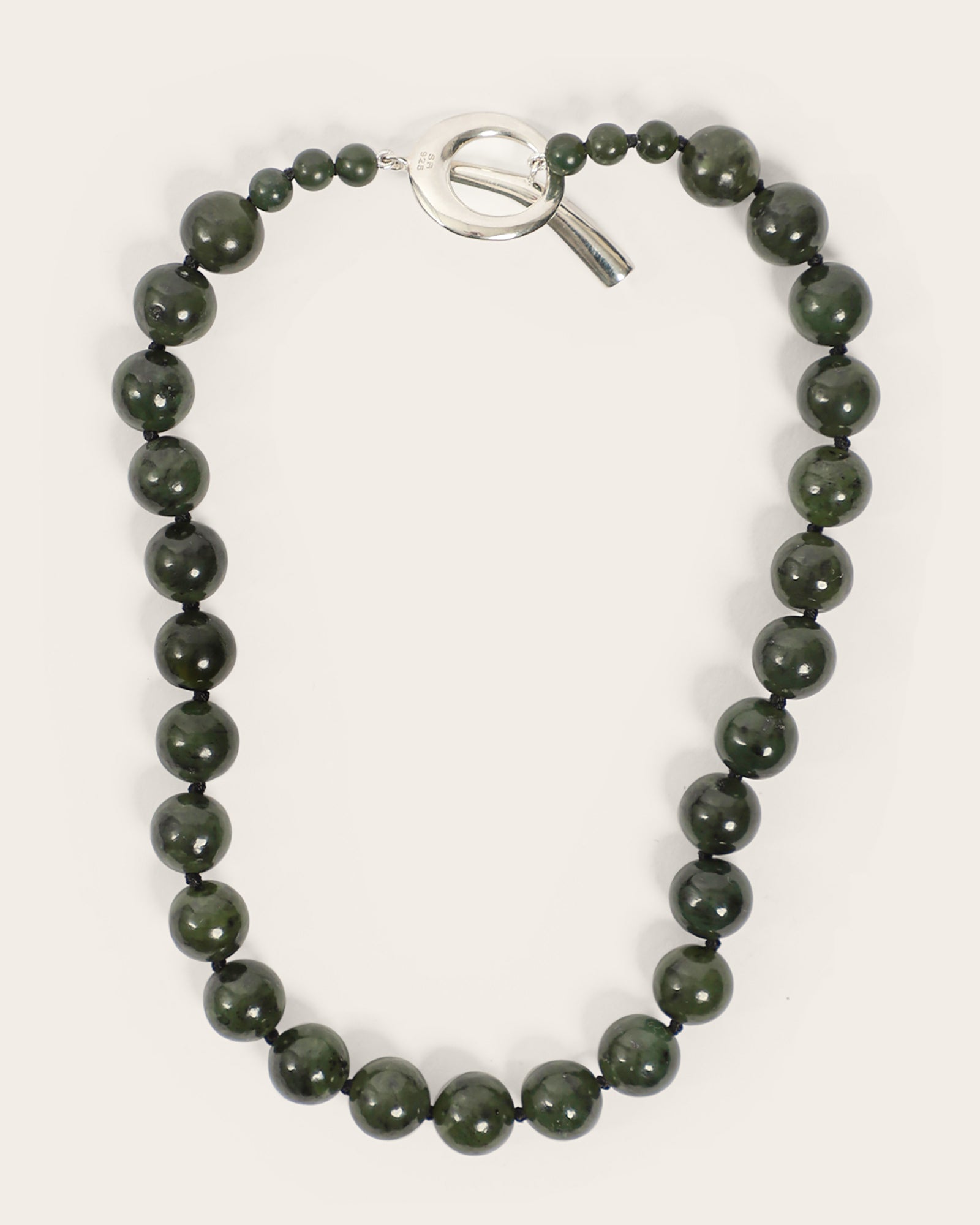 A fitted sculptural sterling silver collar featuring jade beads and a toggle closure.