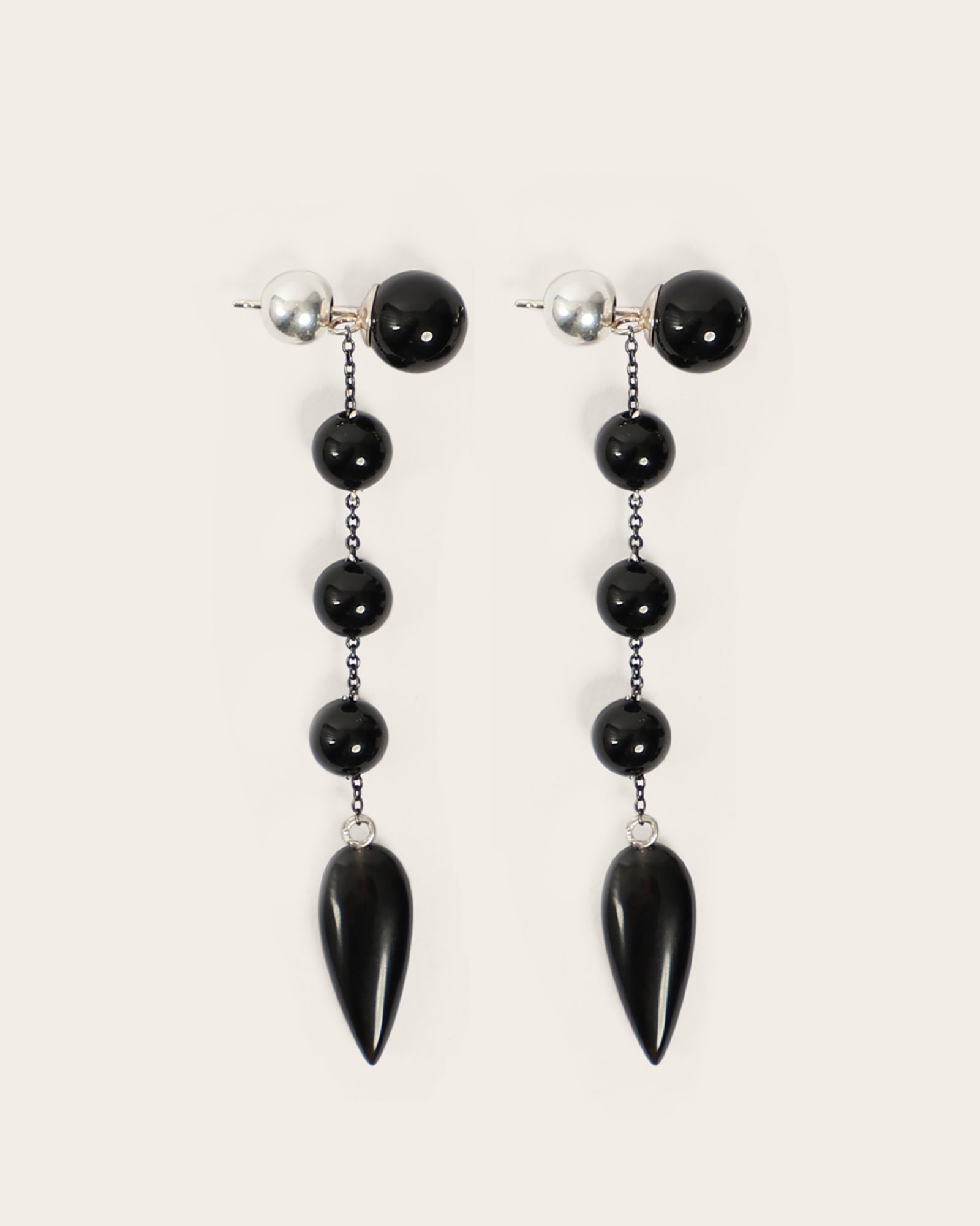An elegant jade drop earrings, featuring a sterling silver and onyx beads, with a comfortable weight.