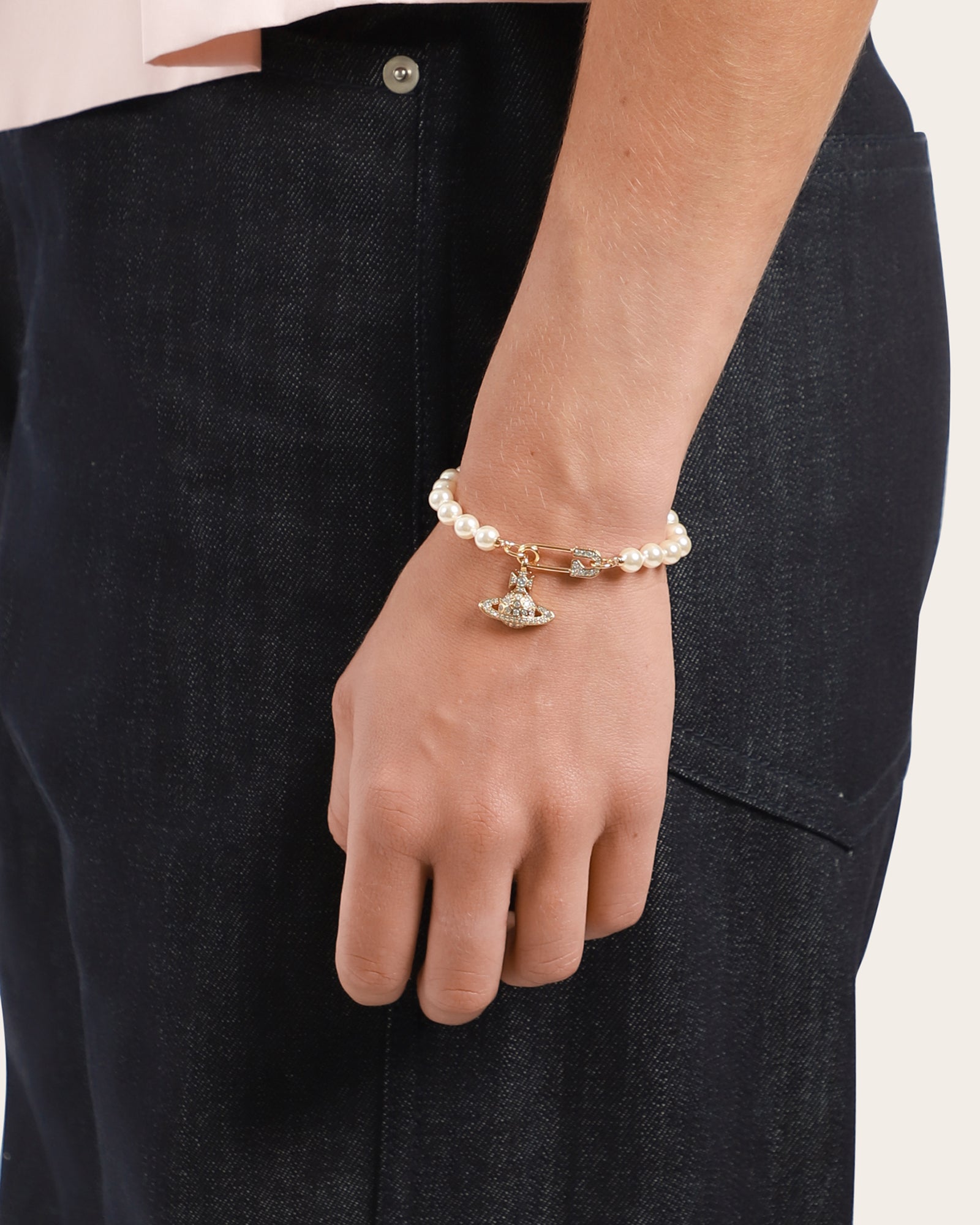 The Lucrece Pearl bracelet features glass pearls and a crystal-encrusted orb, hanging from a safety pin charm, symbolising non-conformity and Vivienne's punk-inspired style.