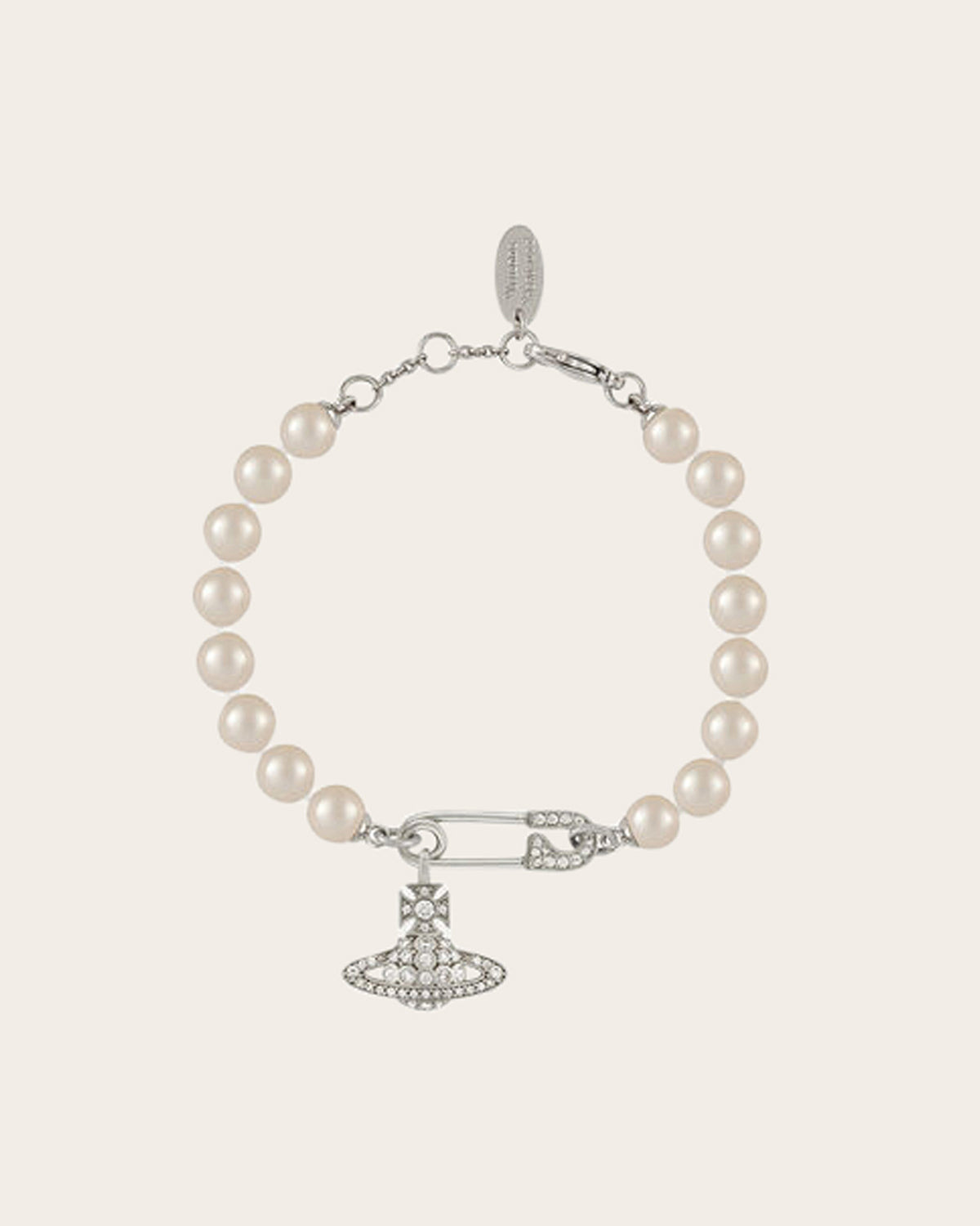 The Lucrece Pearl bracelet features glass pearls and a crystal-encrusted orb, hanging from a safety pin charm, symbolising non-conformity and Vivienne's punk-inspired style.