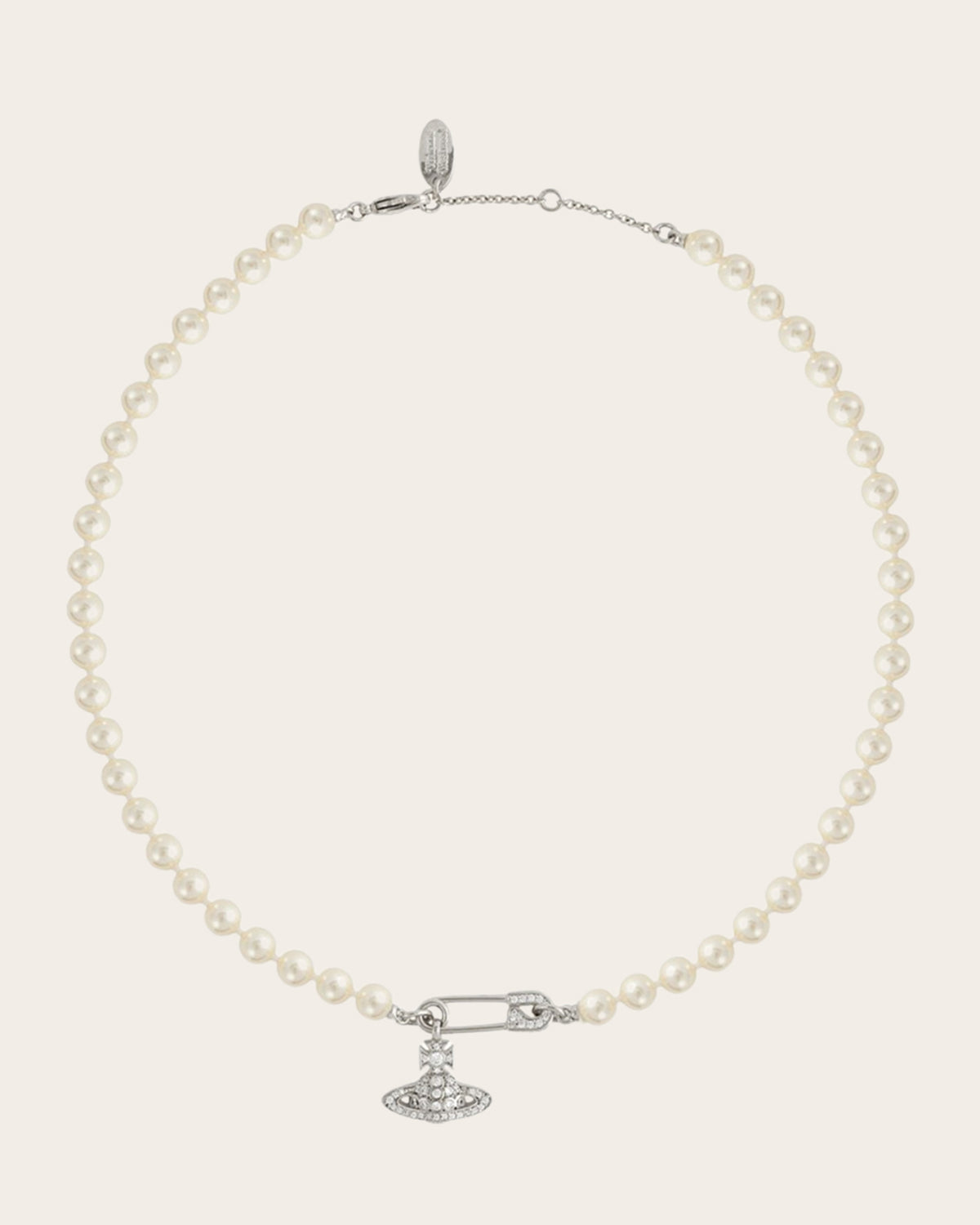 The Lucrece Pearl Necklace is a beaded faux-pearl necklace featuring a safety pin and logo pendant with pavé-set crystals at the drop.