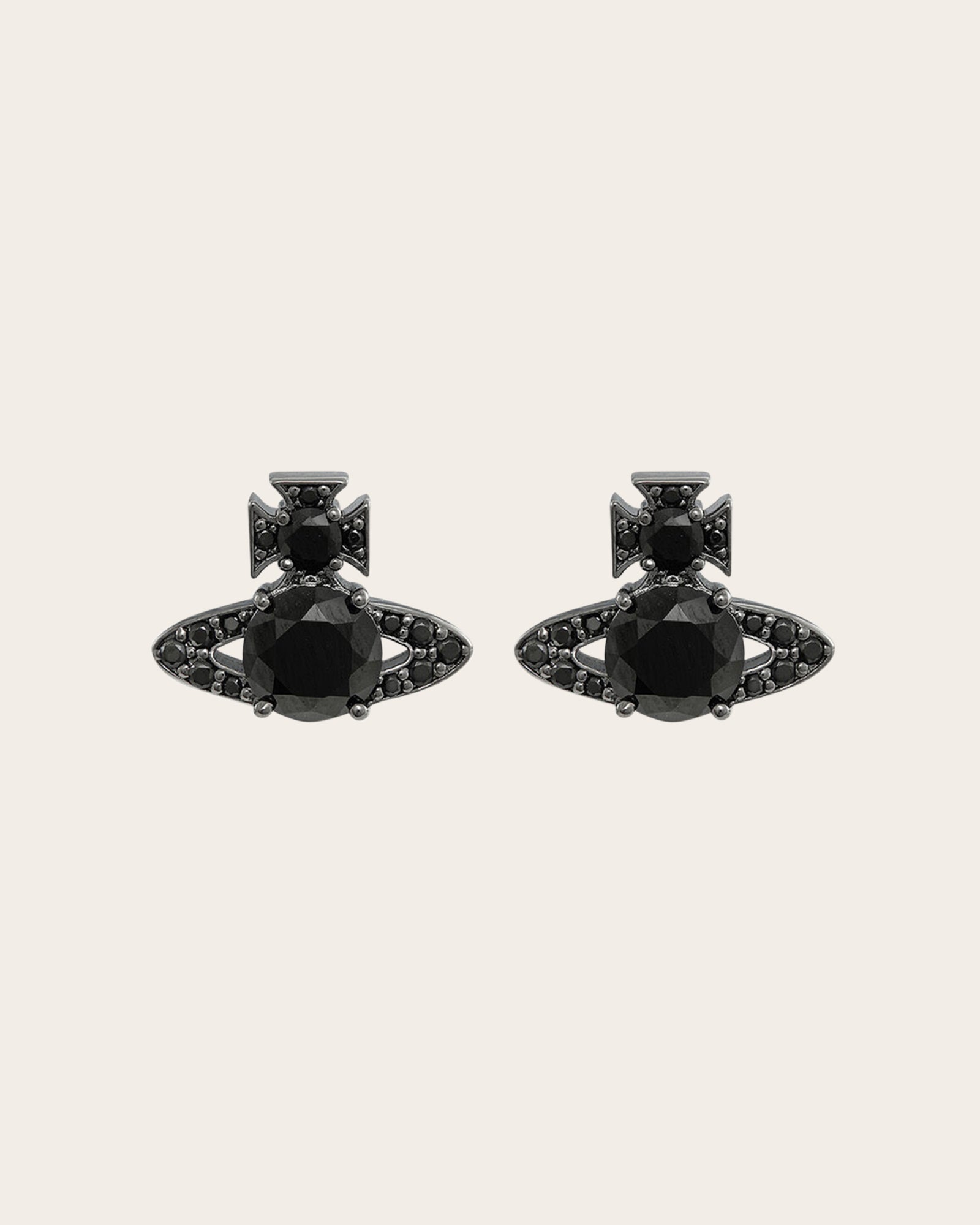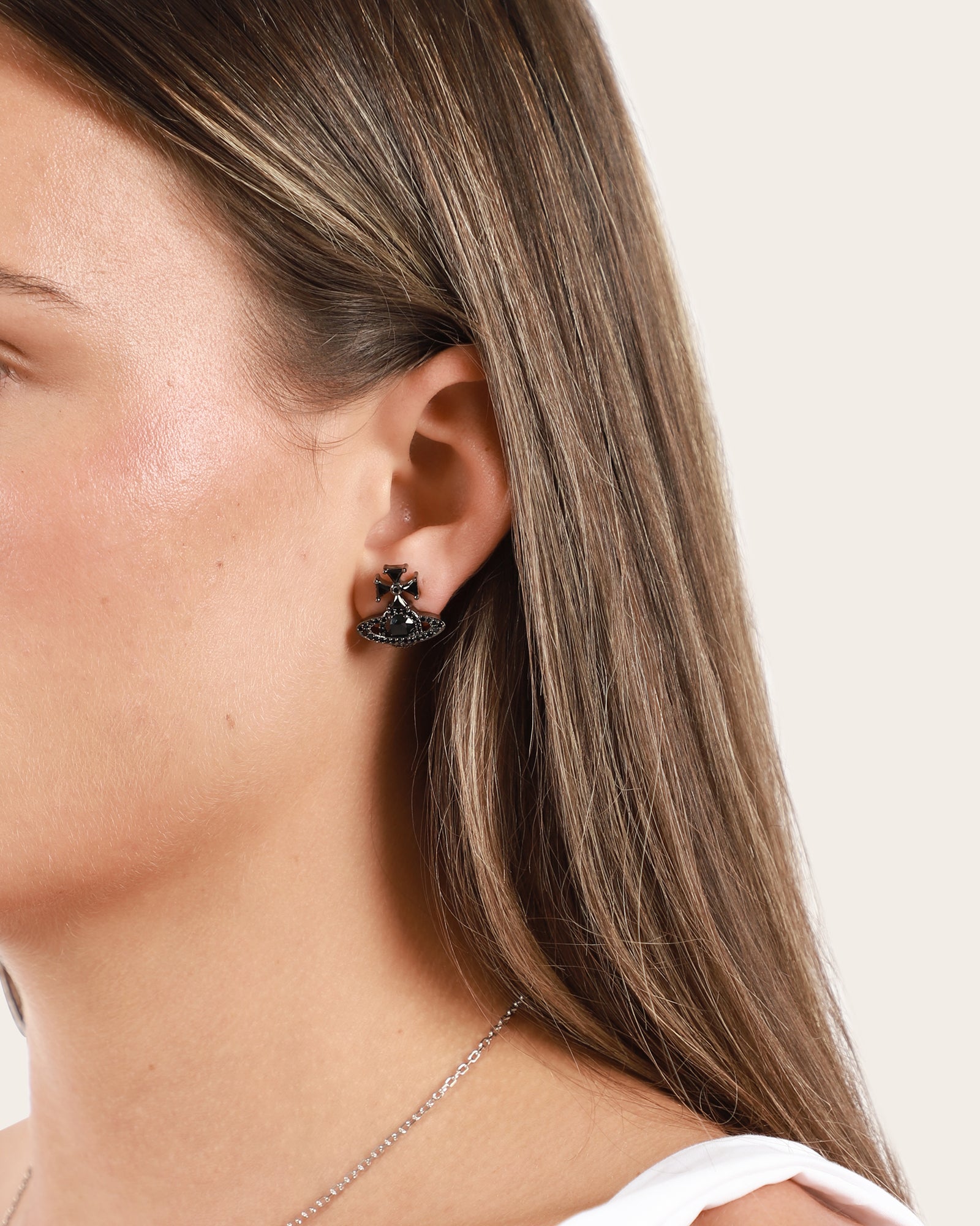 The Mila earring is hand-finished, a Vivienne Westwood metal stud earring, with the signature Orb design, crystal embellishments and designer engraved. It has a butterfly fastening.
