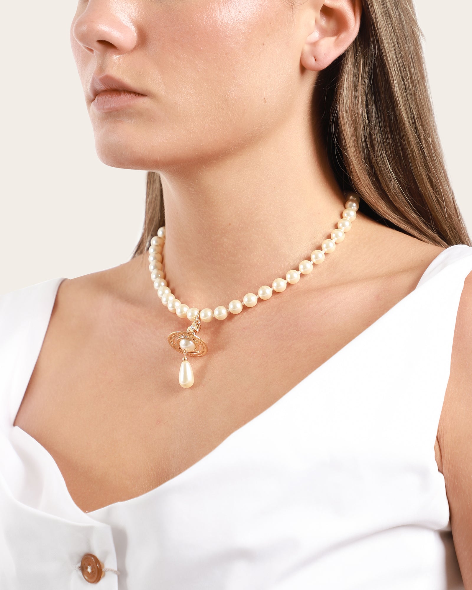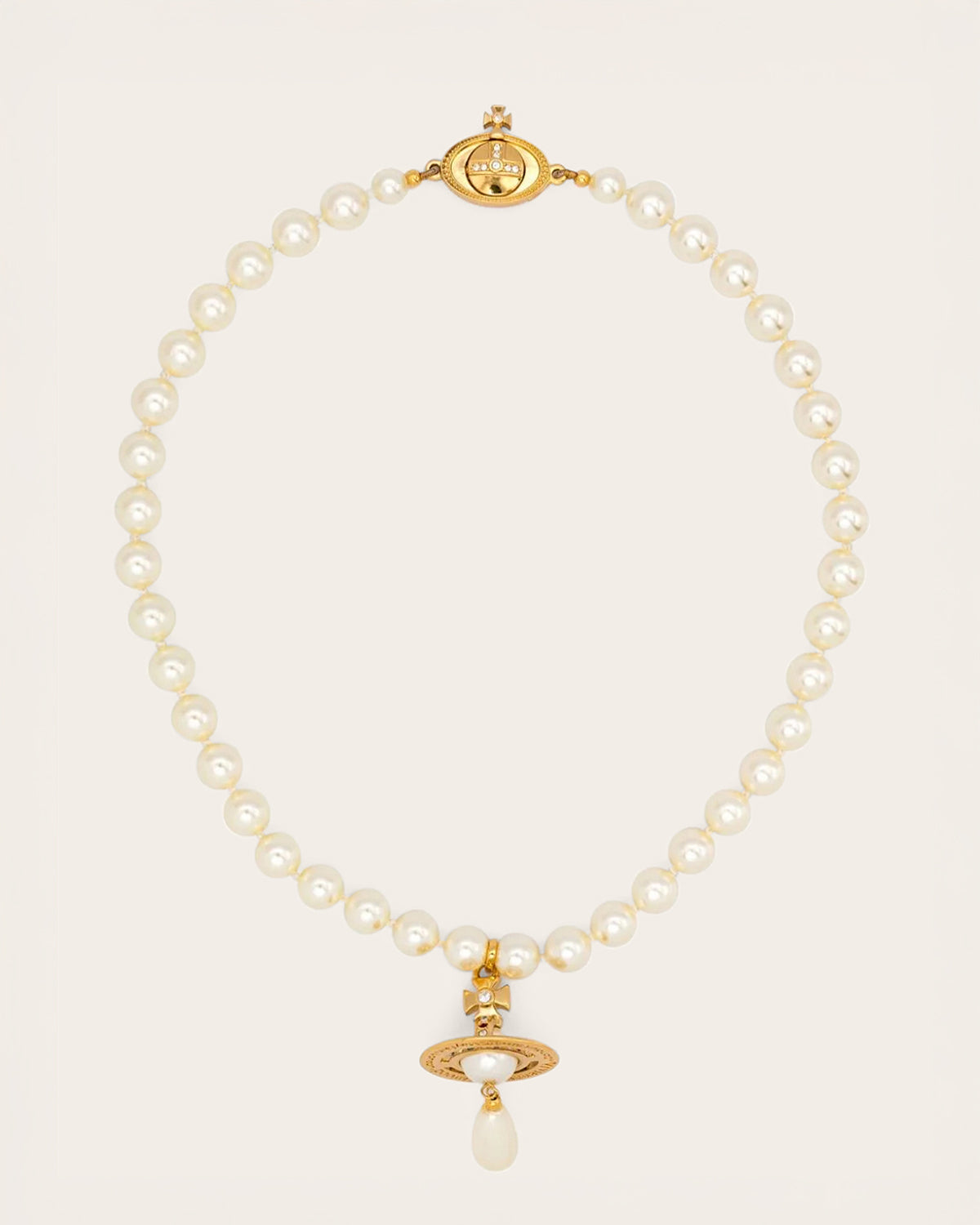 The One Row Pearl Drop Choker reimagines Vivienne Westwood’s 1980s pearl debut, featuring a crystal-encrusted 3D Orb and a teardrop pearl pendant.