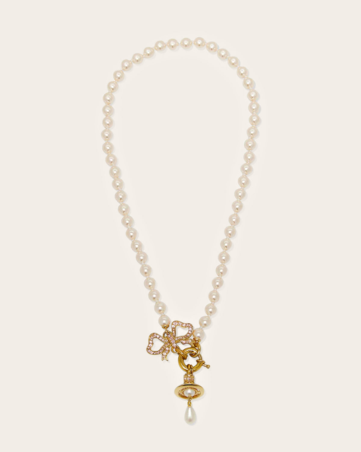 The Rigoberta necklace, features a gold-tone plating and polished finish, pearl drop, rose coloured crystal details, spring lock closure.