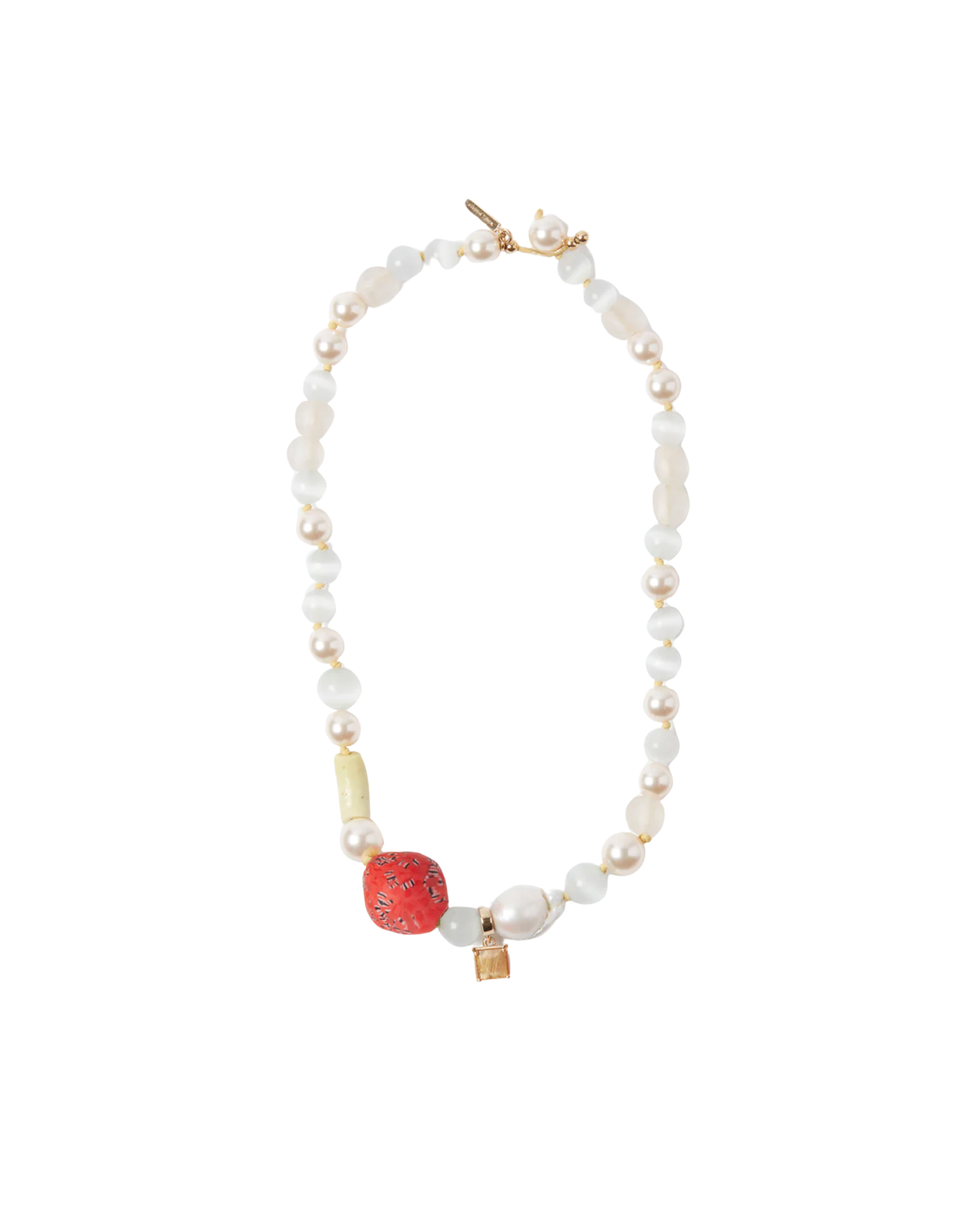 A beautiful hand painted bead made by artisans in Ghana, on a pearl necklace. Every single bead is unique, accompanied by freshwater pearls and a quartz crystal pendant. Made in Italy.