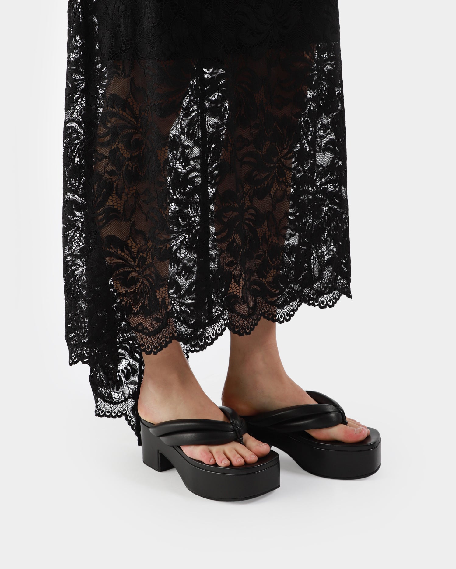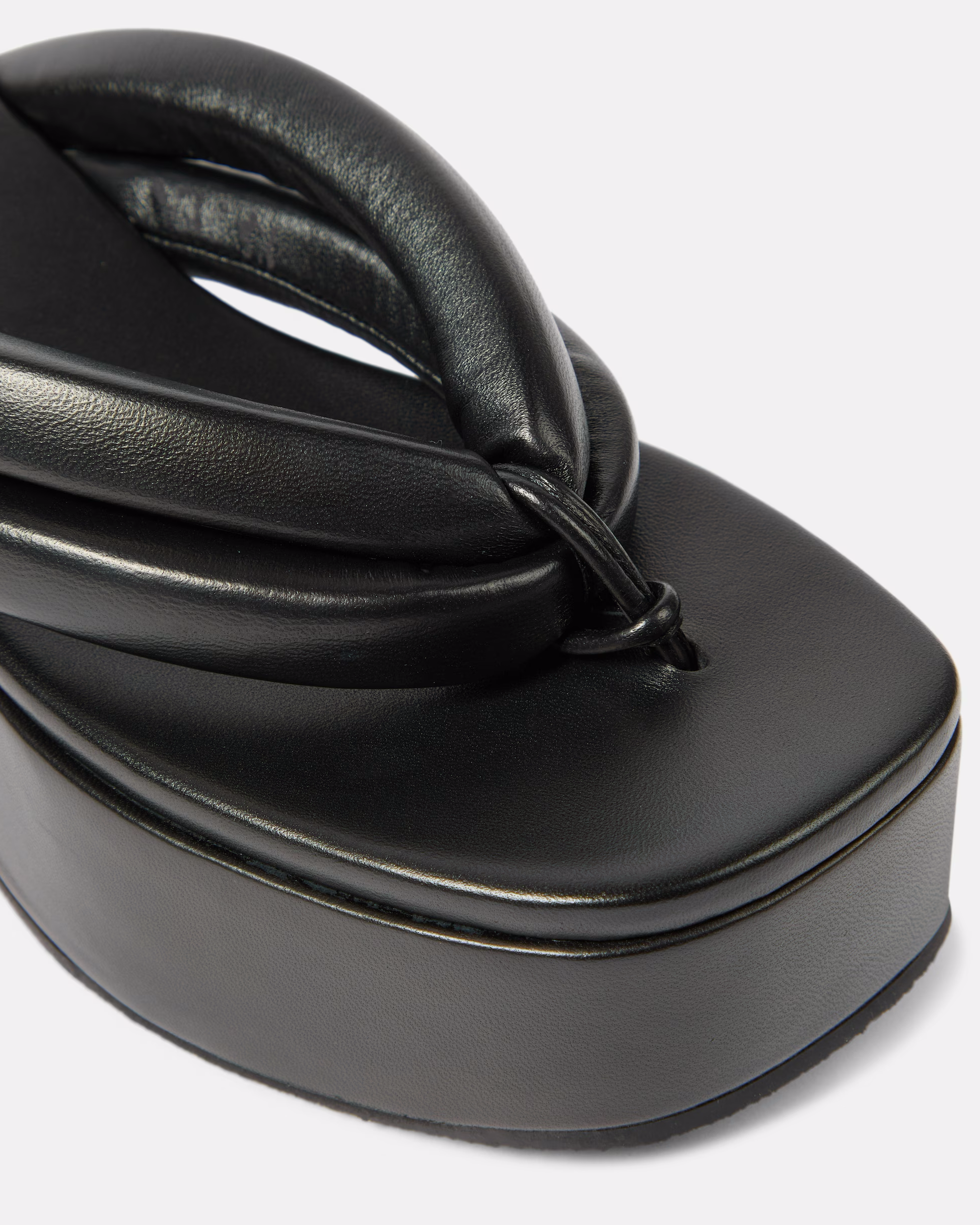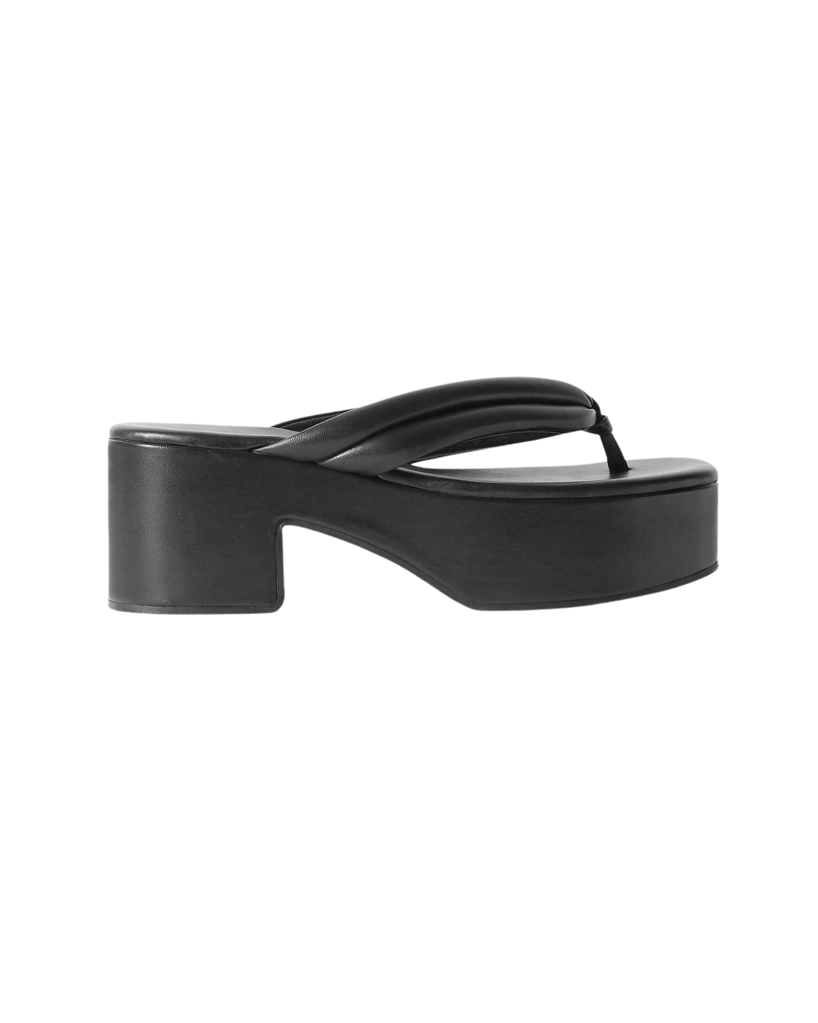 A chunky clog heel with an open square toe, a padded thong-style strap across the vamp, and a logo stamp on the footbed.