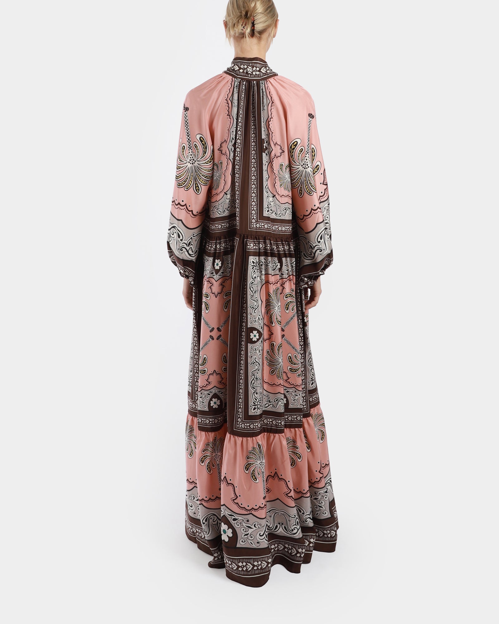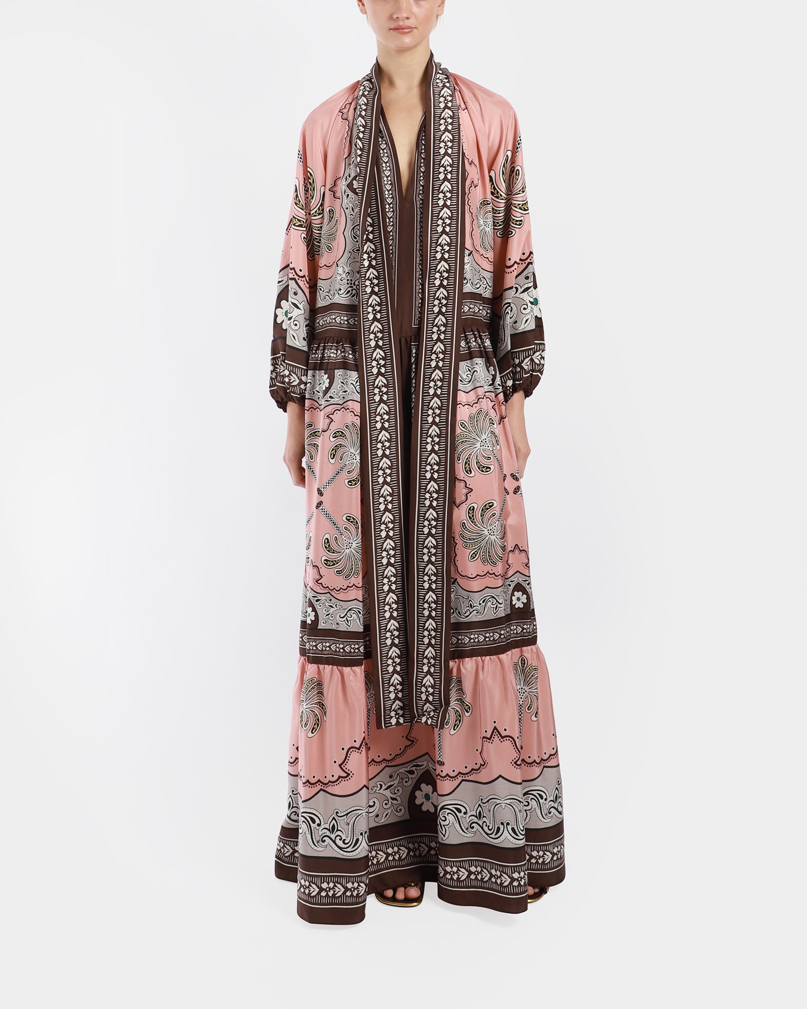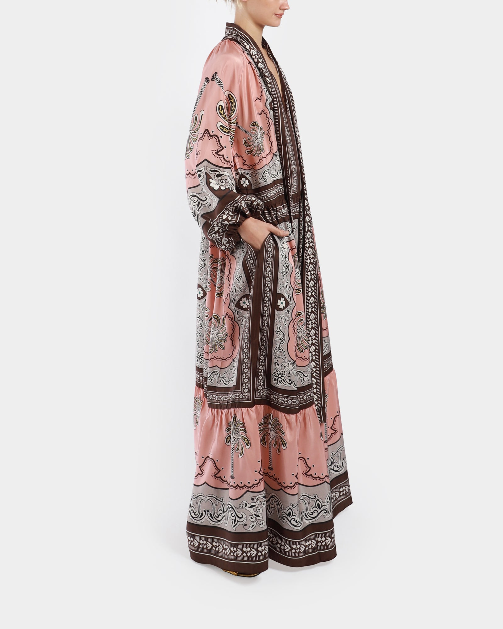 The Athena Dress made from 100% silk is a maxi dress with long wide sleeves secured with an elastic cuff. It has a v-neckline with a sash that can be wrapped around the neck. The A-line silhouette and the two tiered skirt offer the dress more volume. There are no pockets and no zip, a simple slip on dress. Made in Italy.