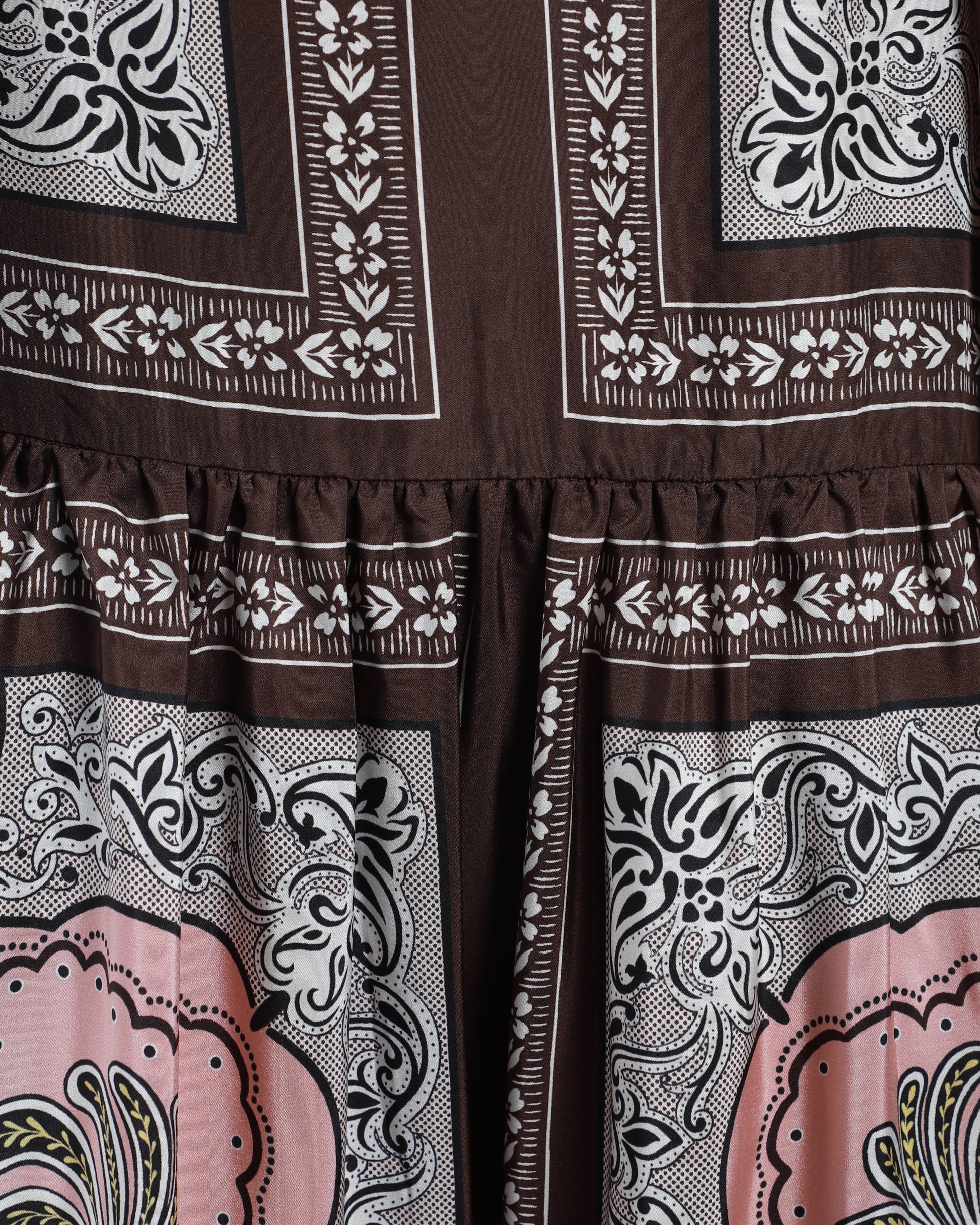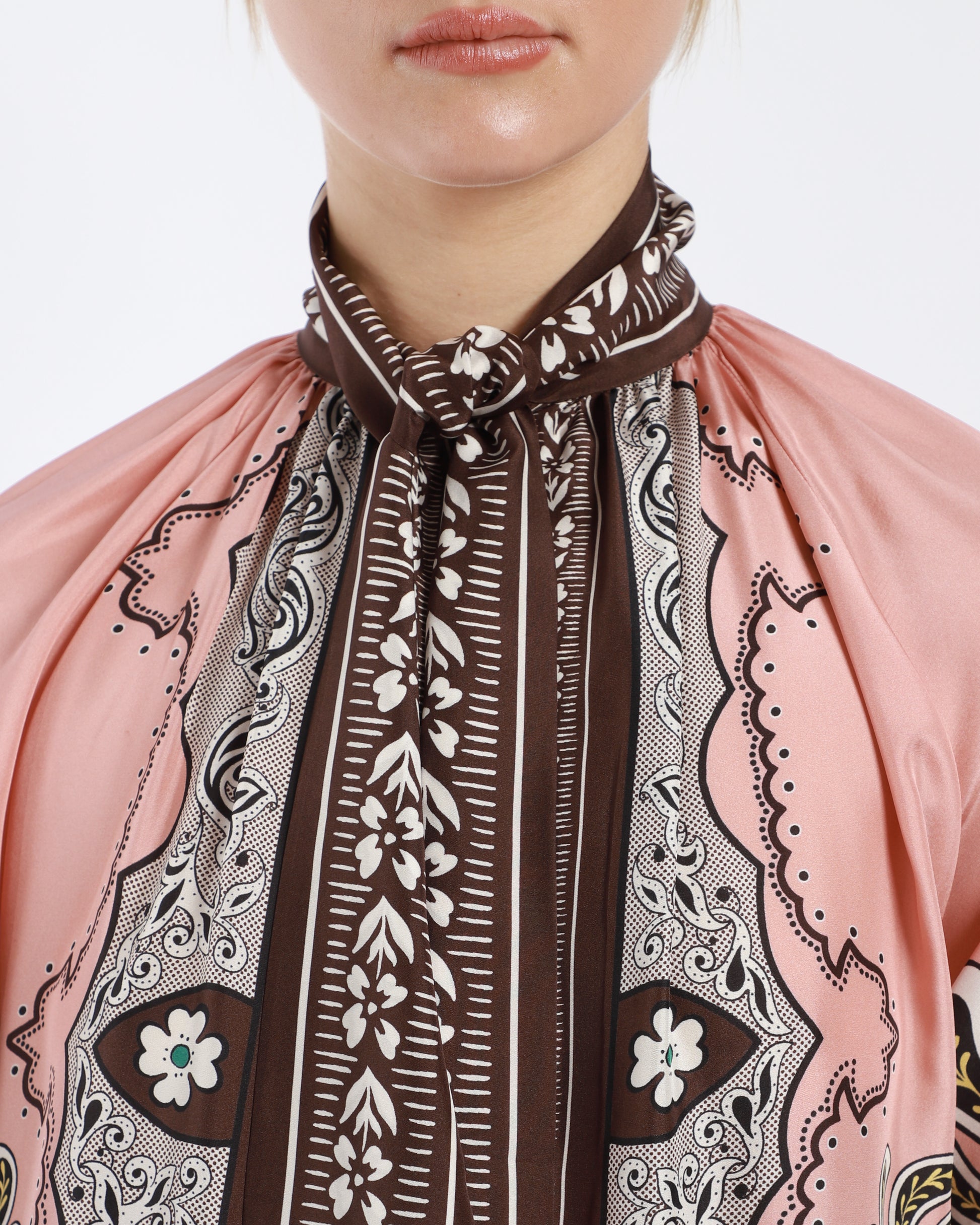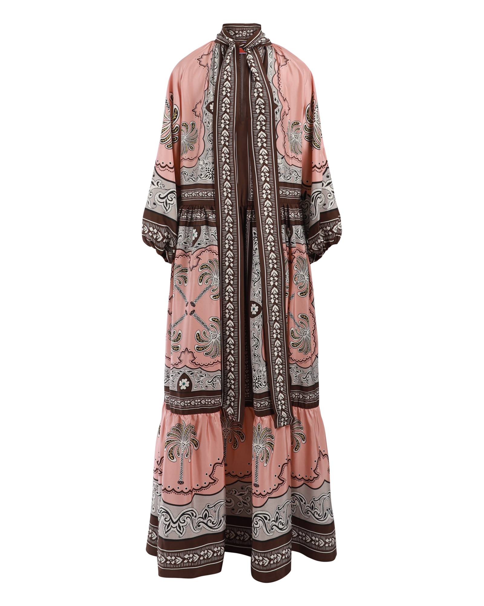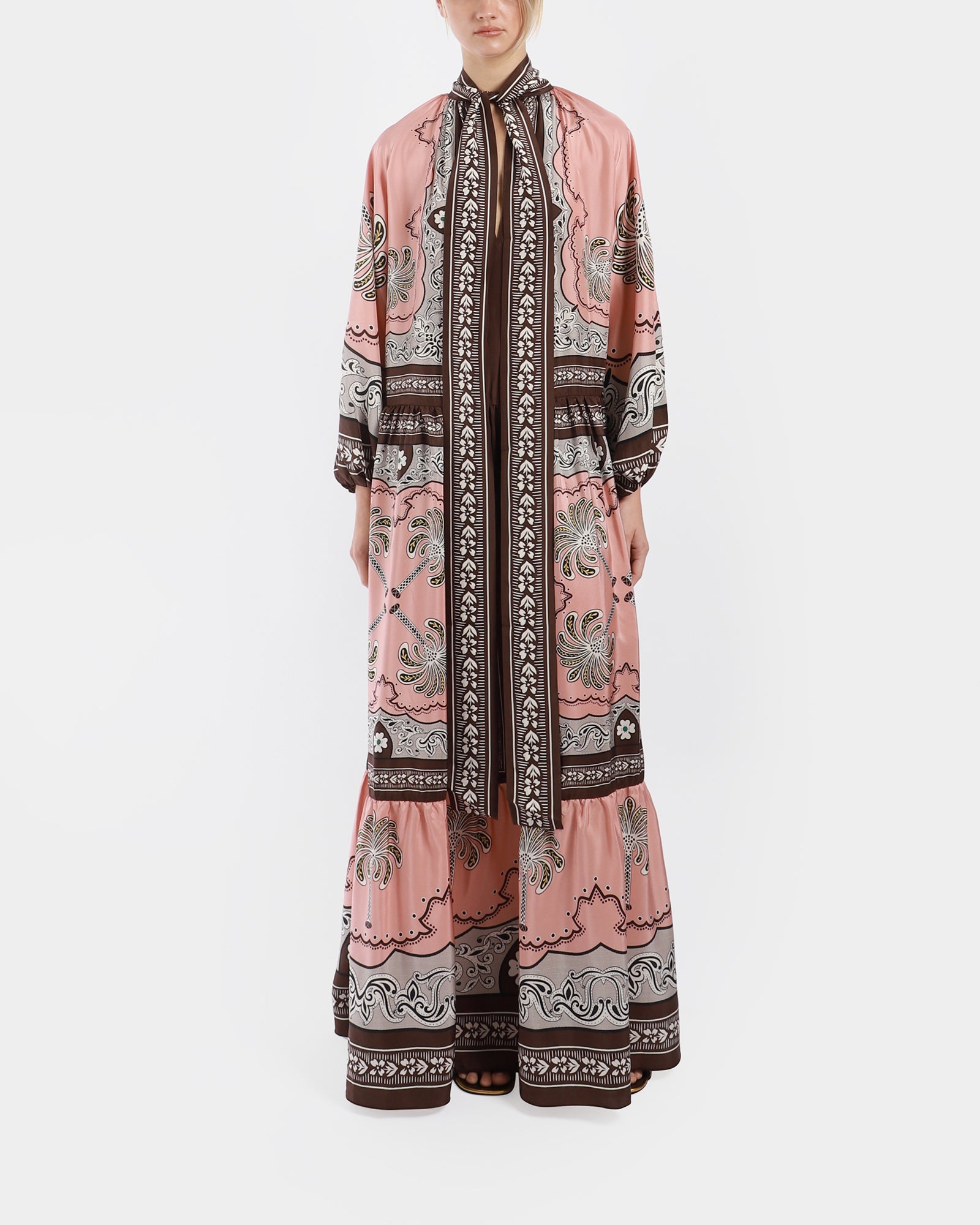 The Athena Dress made from 100% silk is a maxi dress with long wide sleeves secured with an elastic cuff. It has a v-neckline with a sash that can be wrapped around the neck. The A-line silhouette and the two tiered skirt offer the dress more volume. There are no pockets and no zip, a simple slip on dress. Made in Italy.