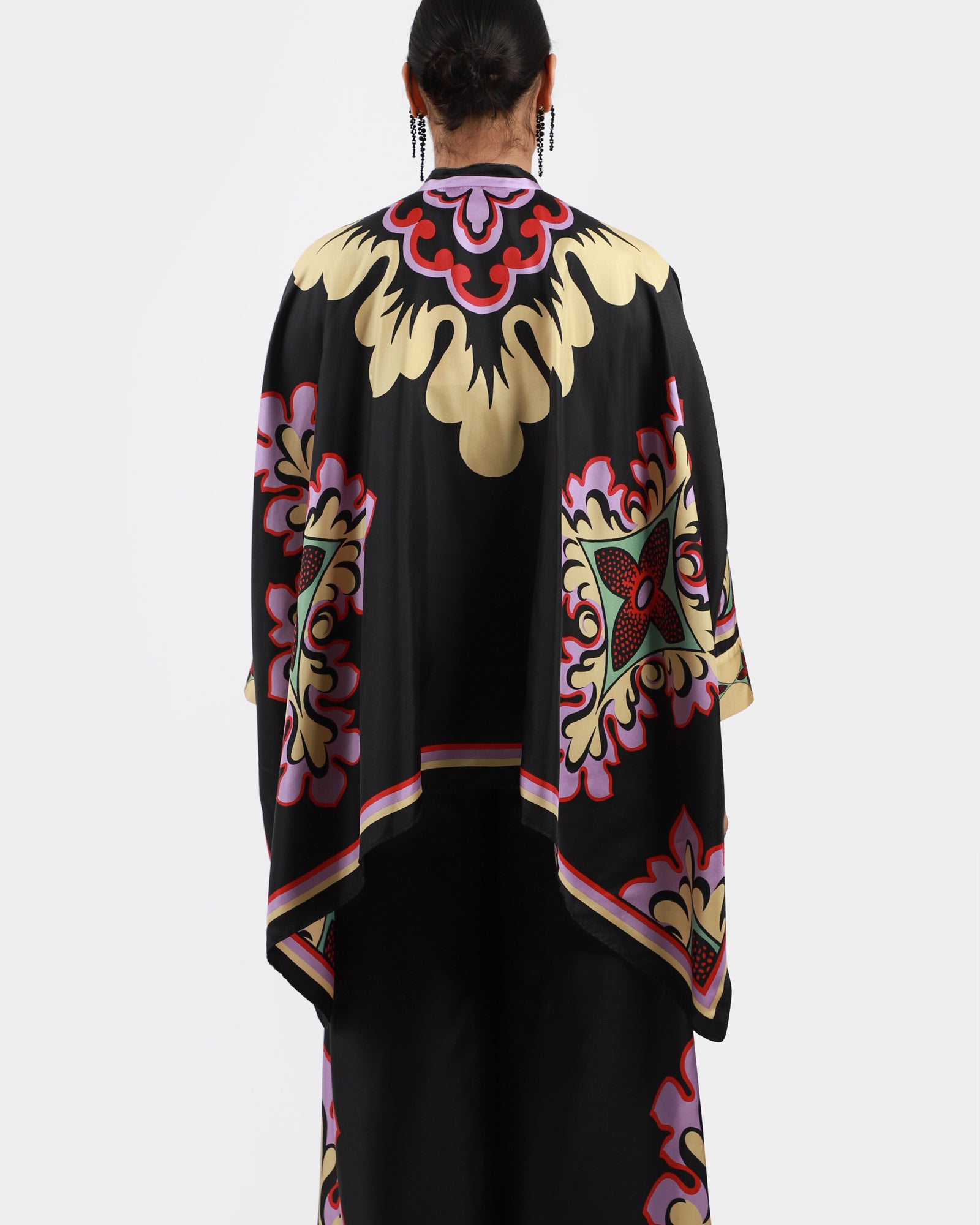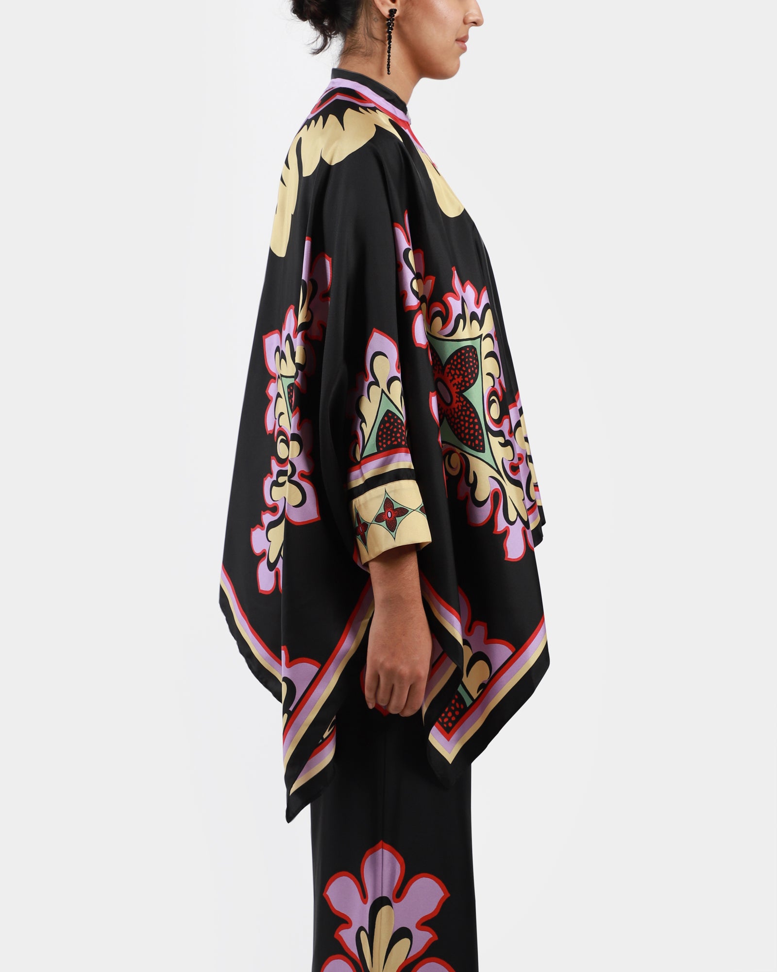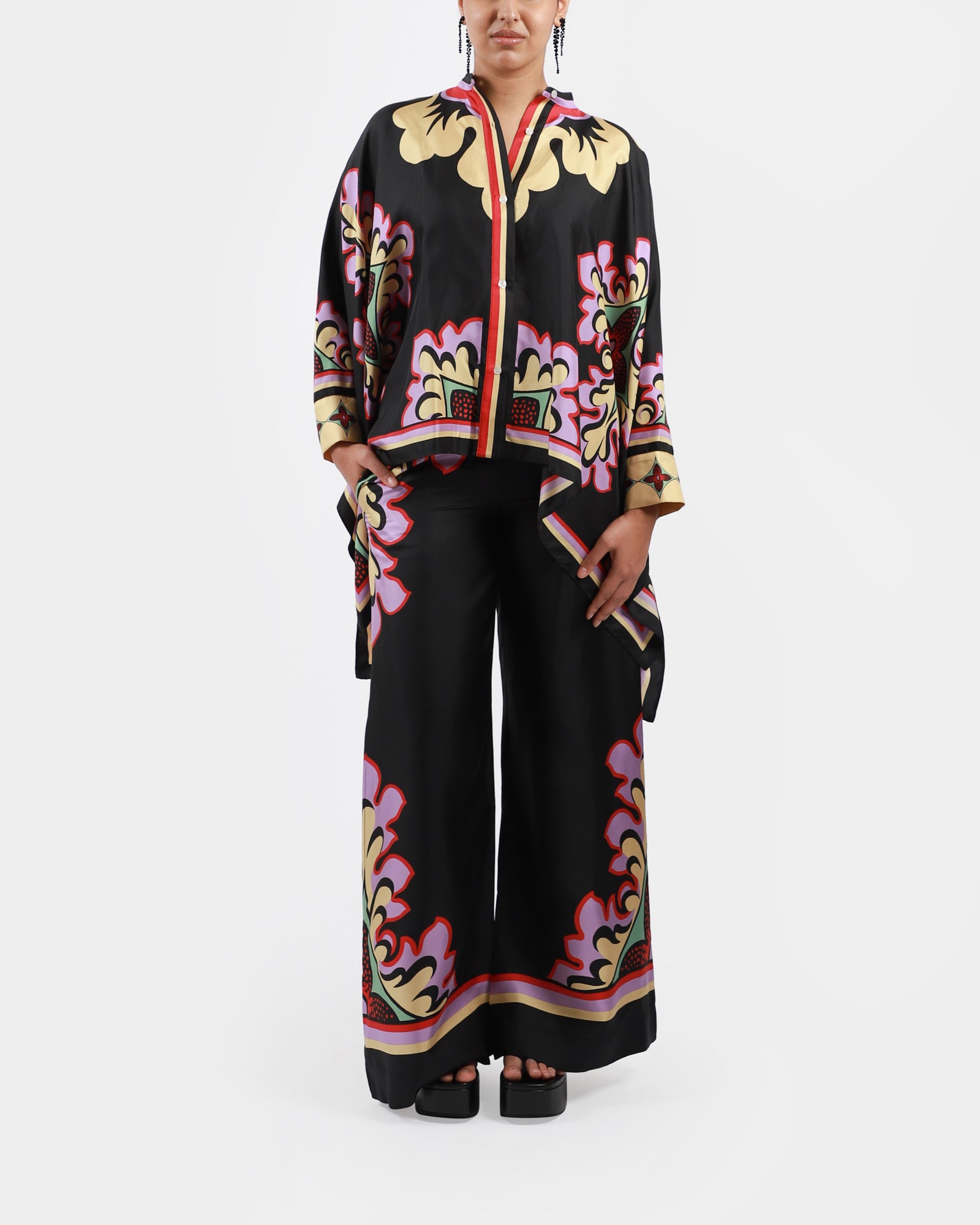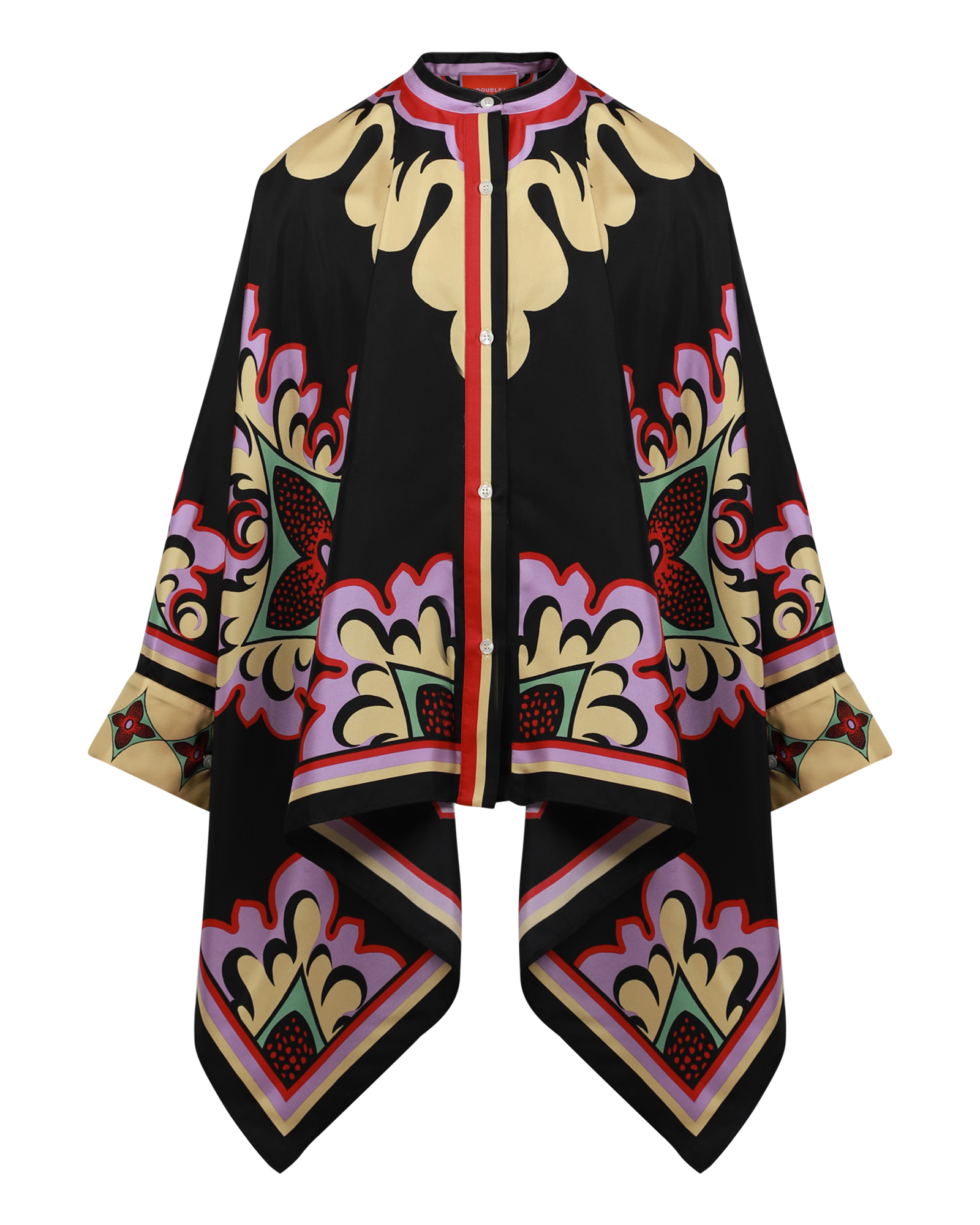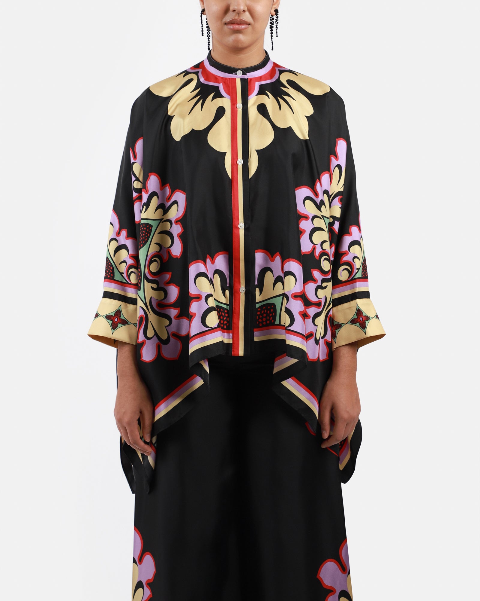 • Shirt or scarf? This beautiful piece is versatile and can be worn as a shirt or scarf, featuring a waterfall fit made from an Italian silk scarf, a Korean collar, hand-placed Palazzo print, hidden buttons at front to close. Made in Italy.