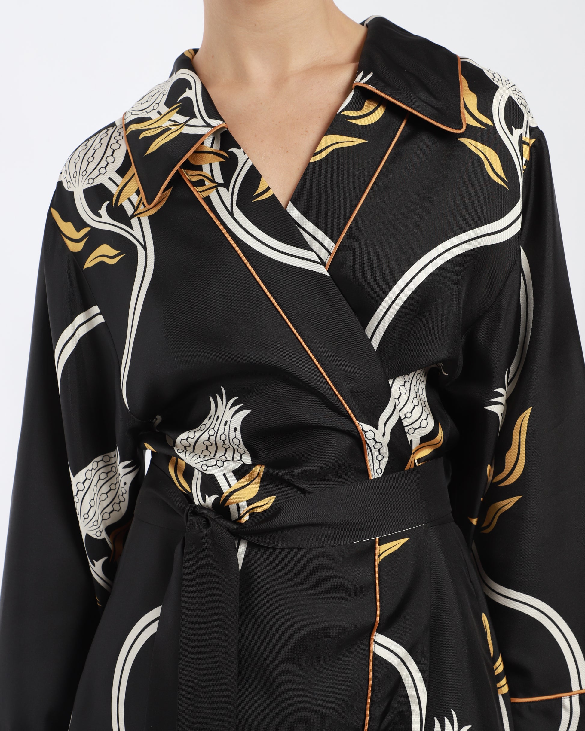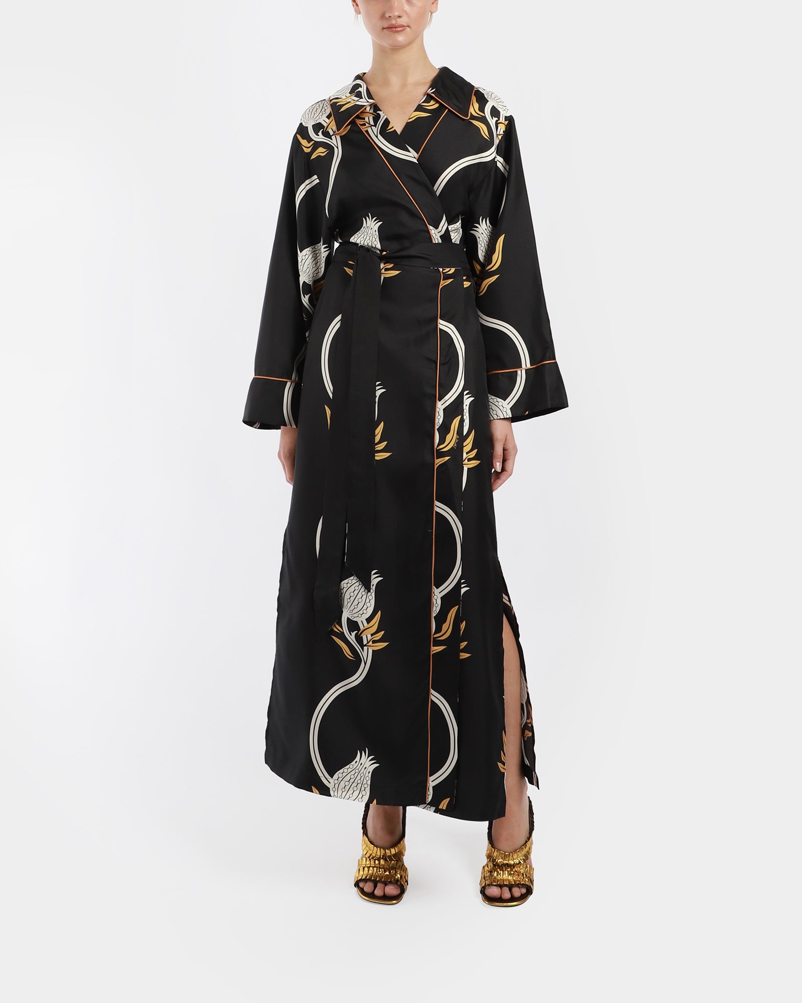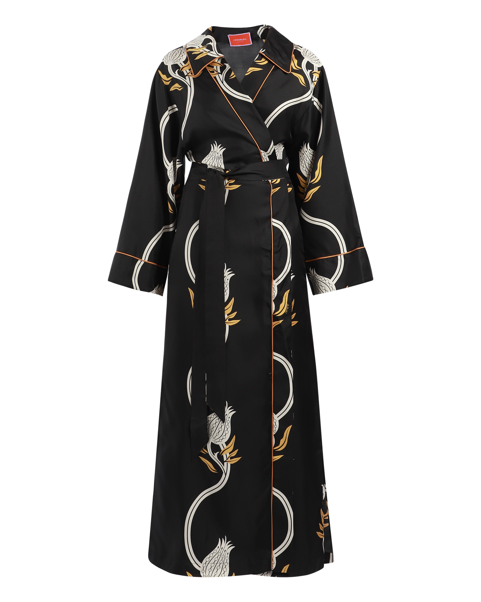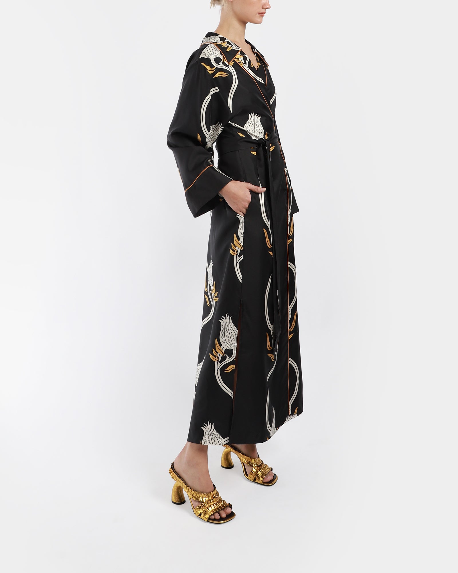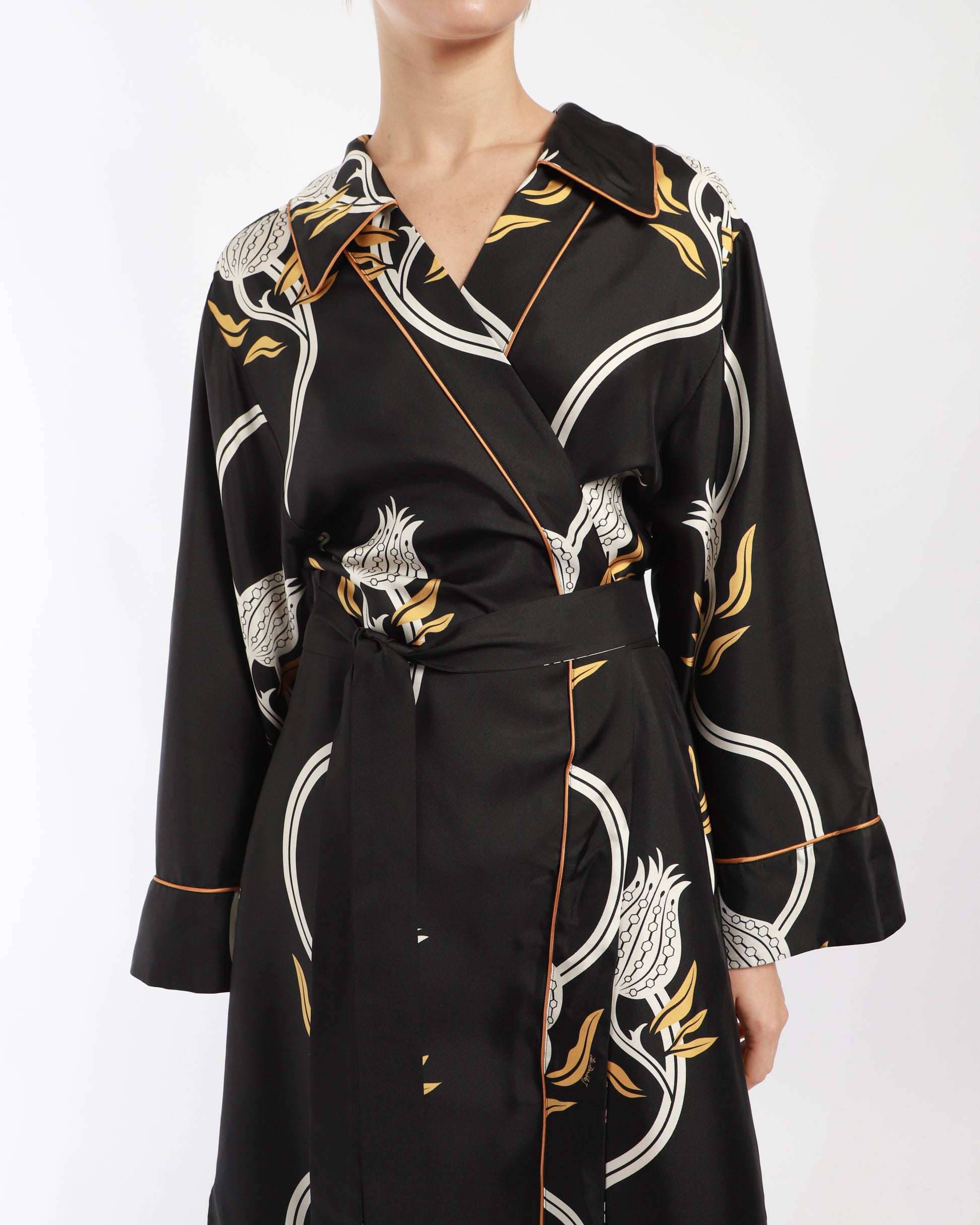 The Midnight Dress made from 100% silk, is a maxi wrap dress with adjustable and removable ties at waist. It has a collar, 3/4 length sleeves, a pocket on each side and a split on side. Made in Italy.