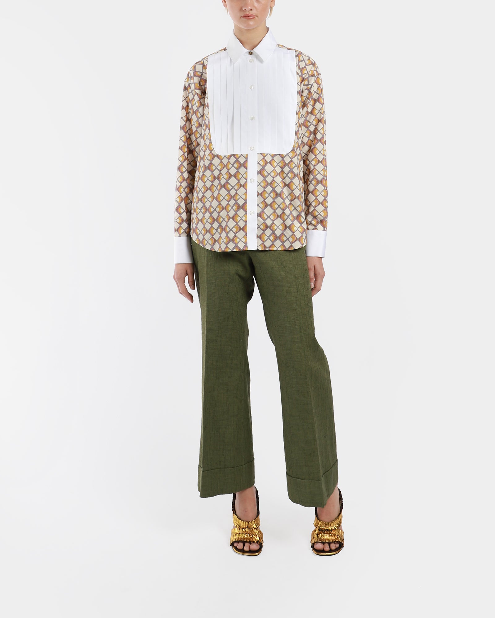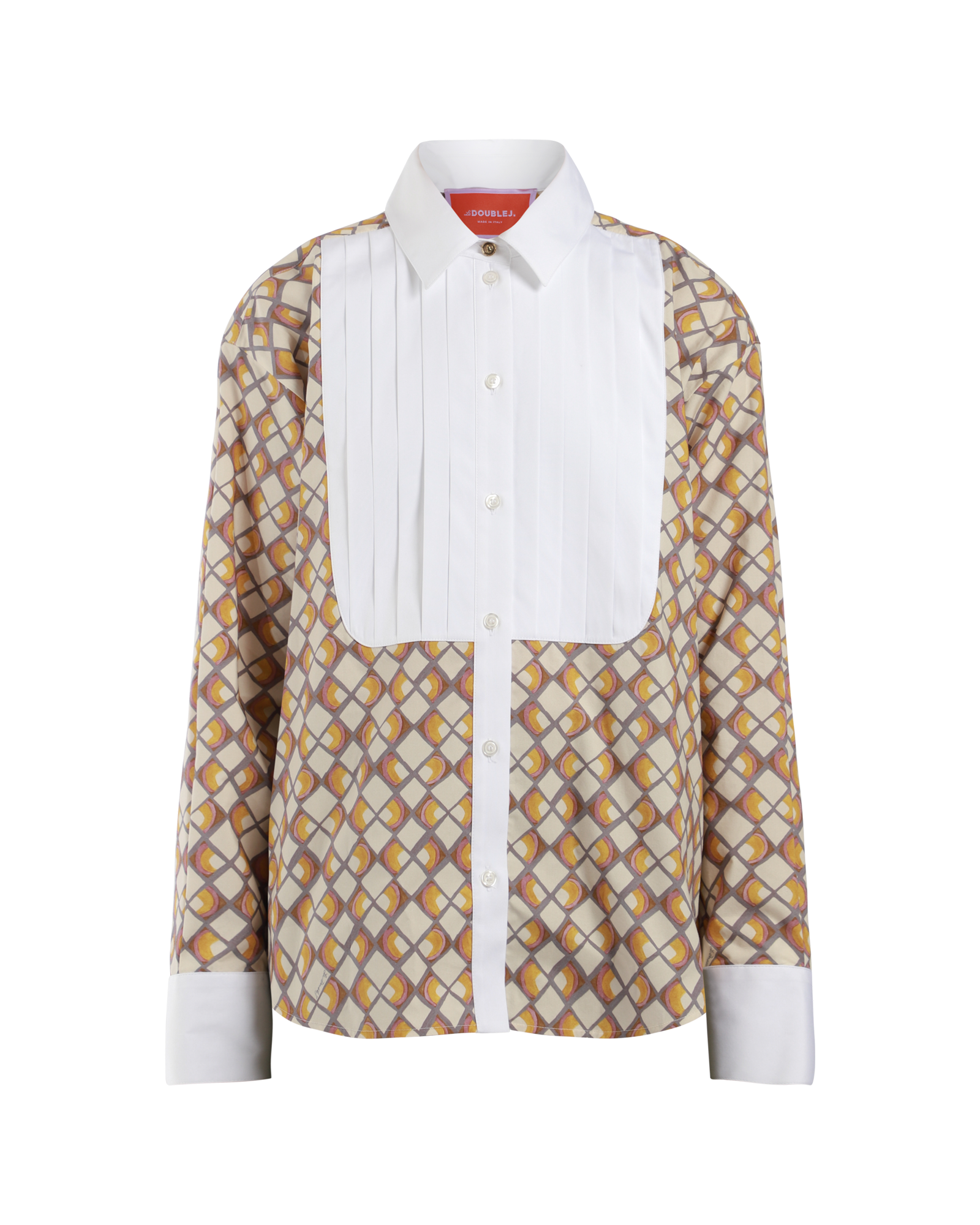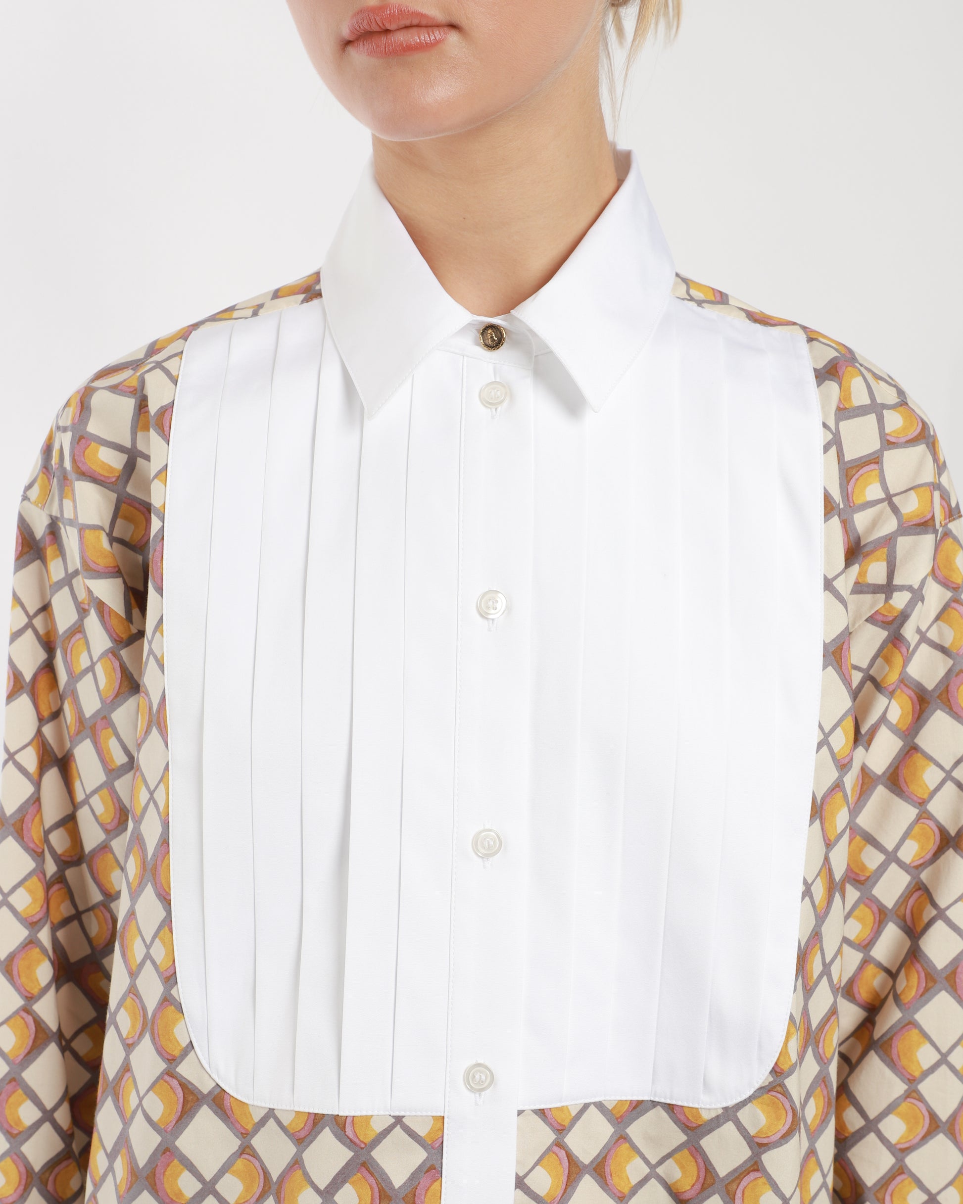 • The Peggy Shirt made from cotton, is an oversized tuxedo shirt with boxy drop shoulder and a contrast plastron with pleats. It has buttons at the front to close with a high-low hem. Made in Italy