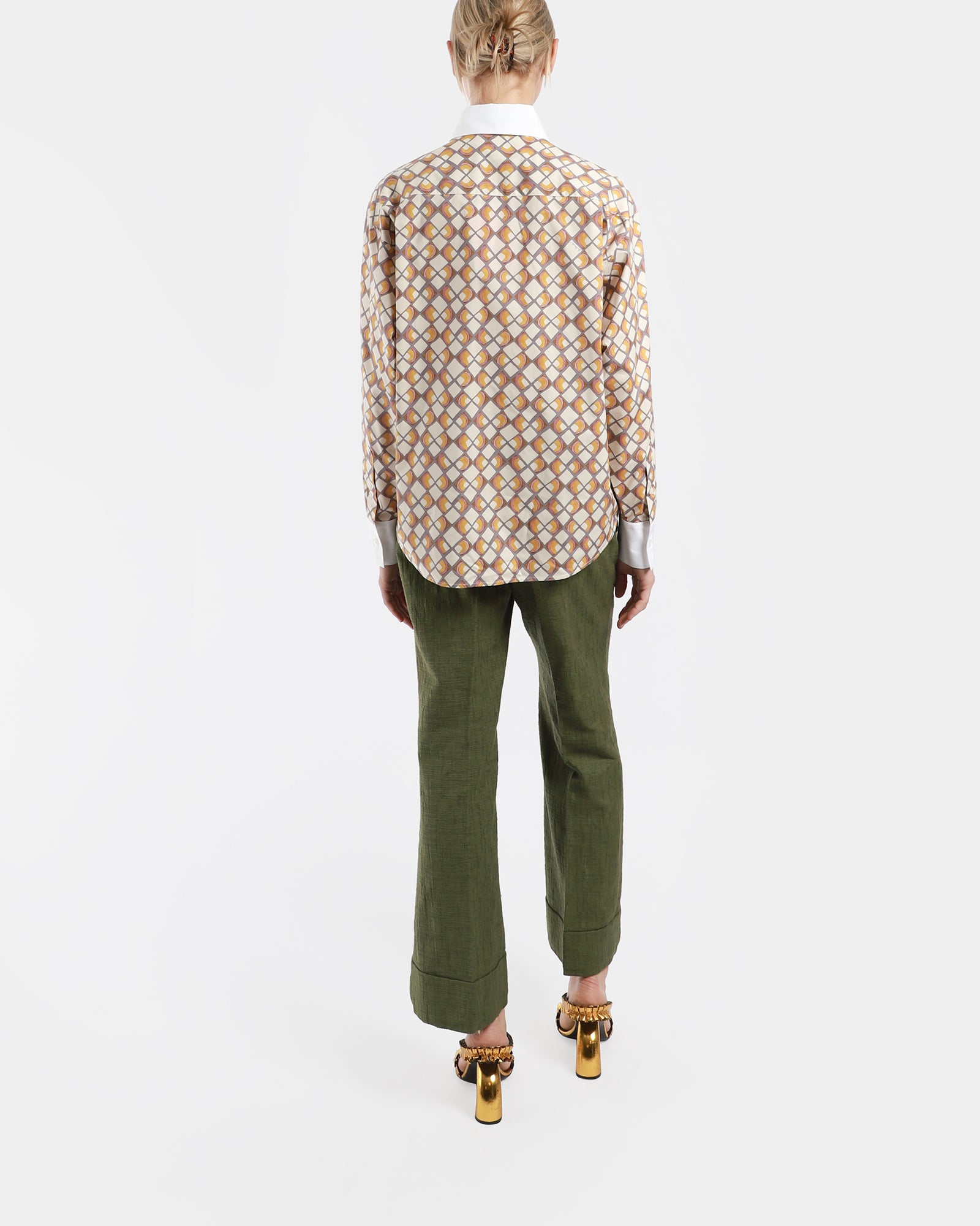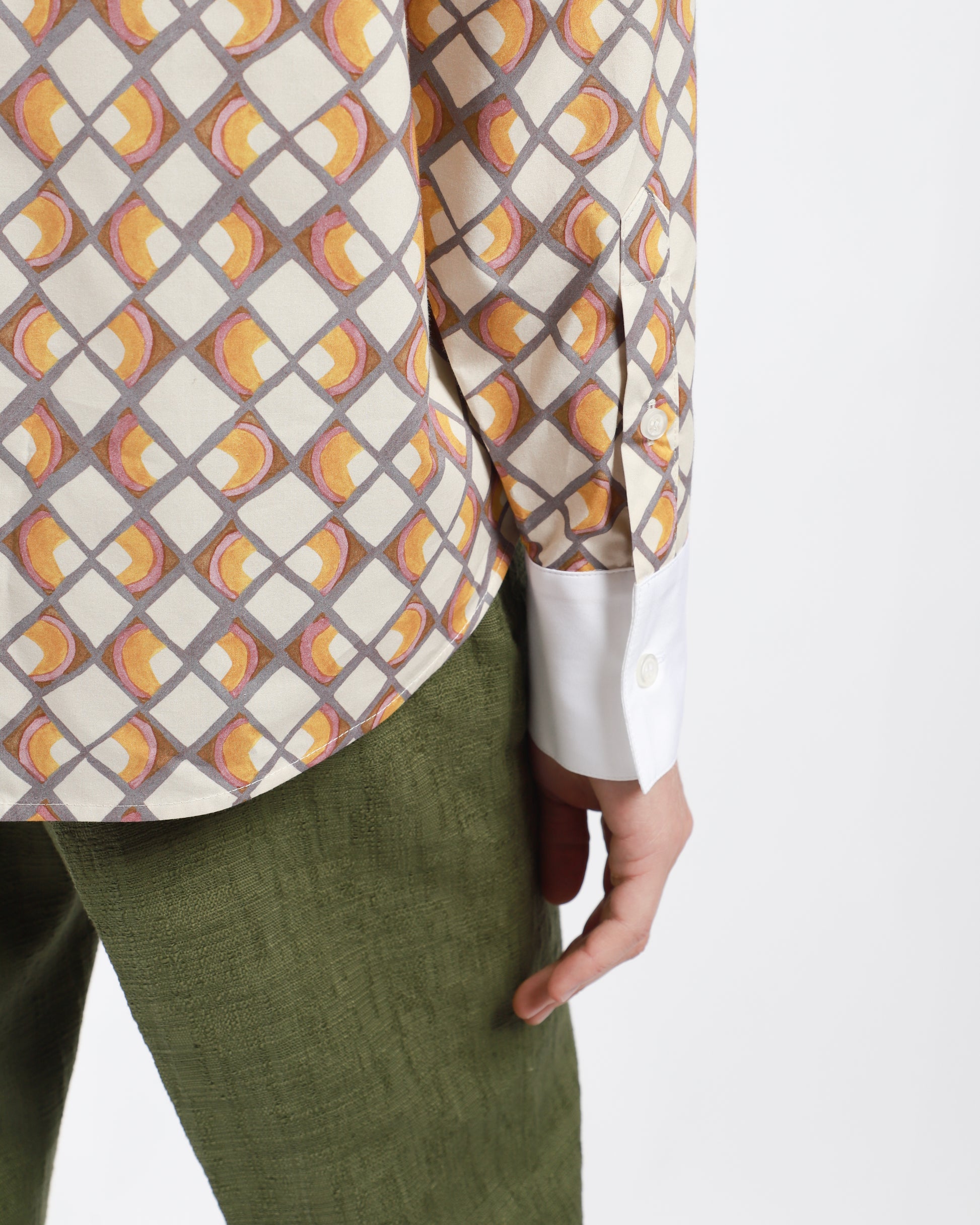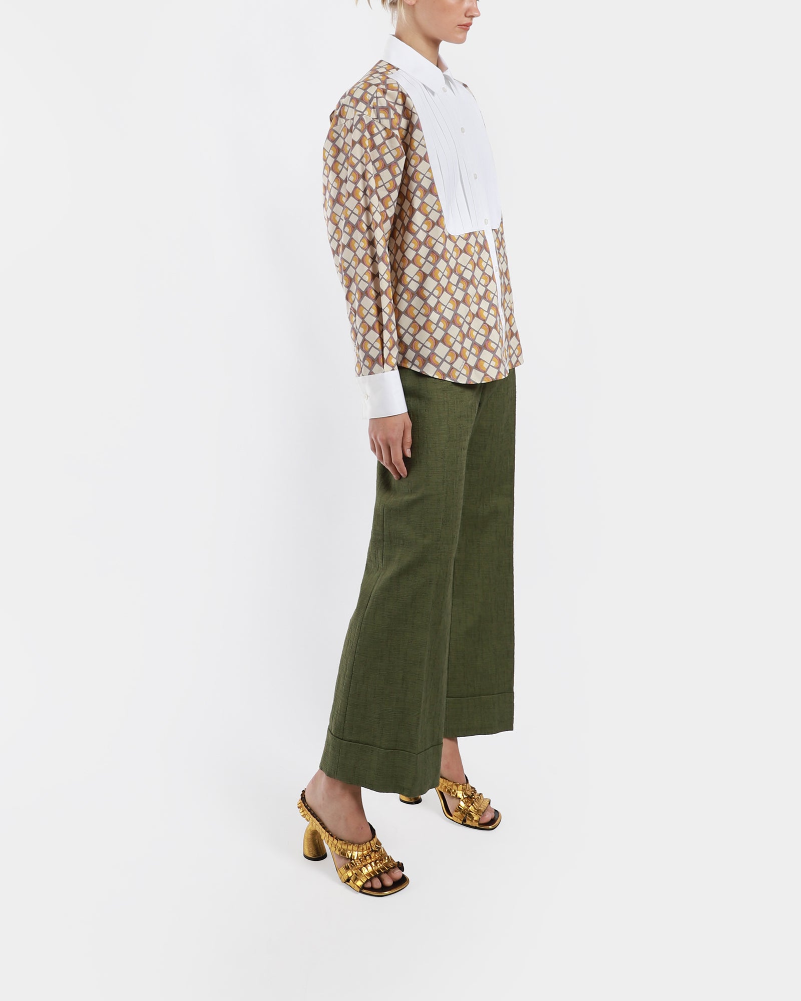 • The Peggy Shirt made from cotton, is an oversized tuxedo shirt with boxy drop shoulder and a contrast plastron with pleats. It has buttons at the front to close with a high-low hem. Made in Italy