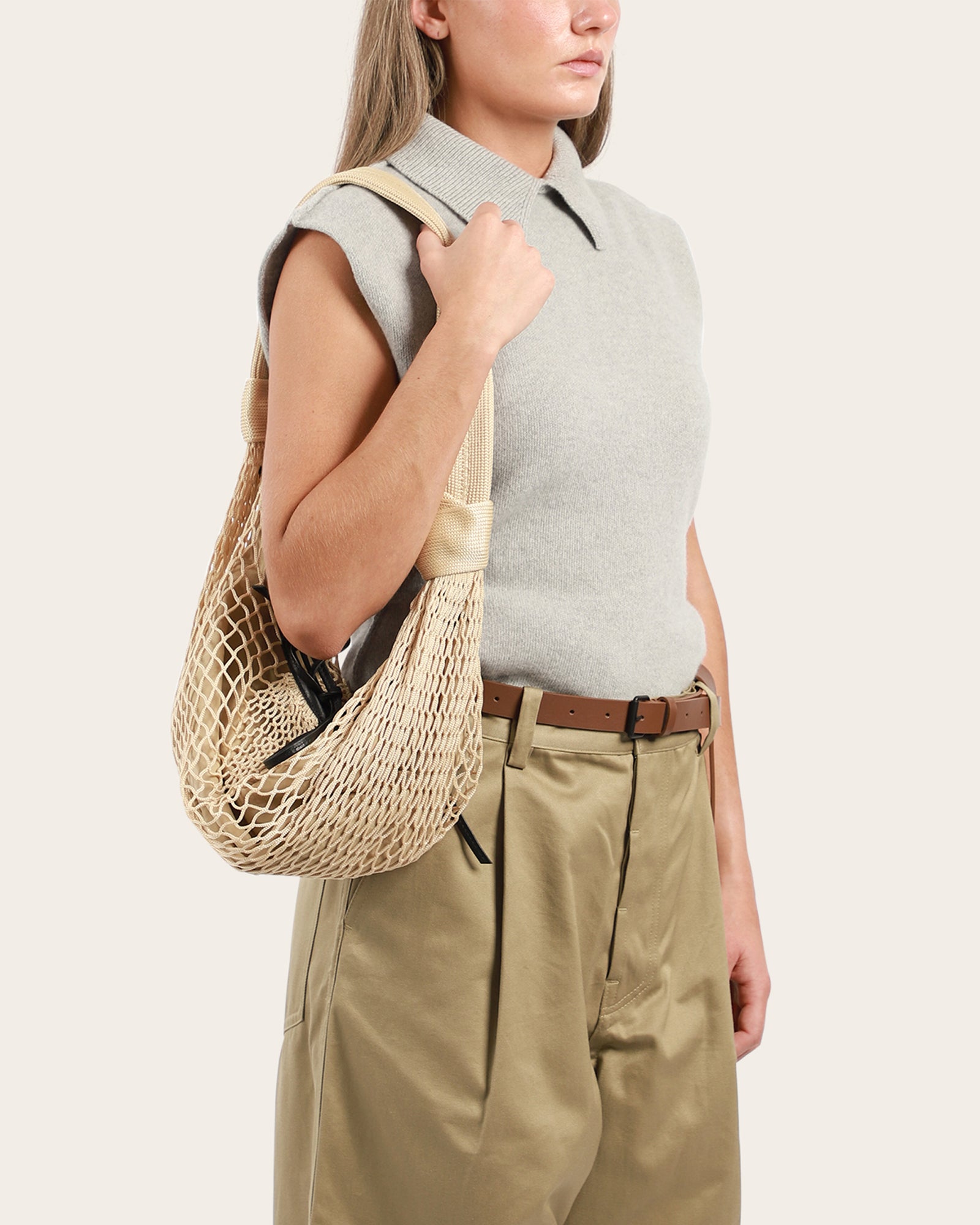 A collaboration between Lemaire and Filt, the oldest French manufacturer of net shopping bags (established in 1860). Inspired by the iconic Croissant collection, this bag is versatile and is a 2-1 piece, combining nylon net with a removable inner bag. The net part is of the bag has a leather tie closure, removable nylon interior bag with snap fasteners on each side, zip closure. Made in France.