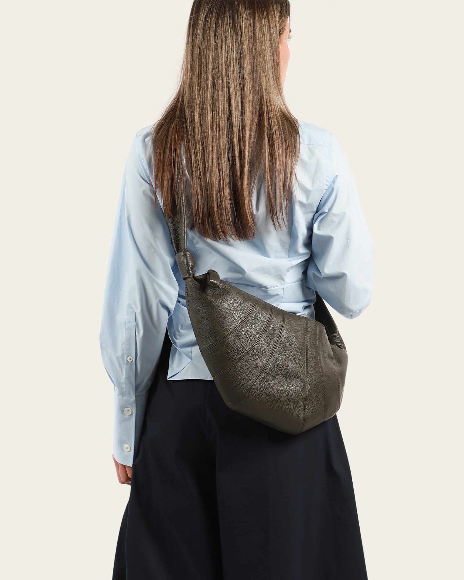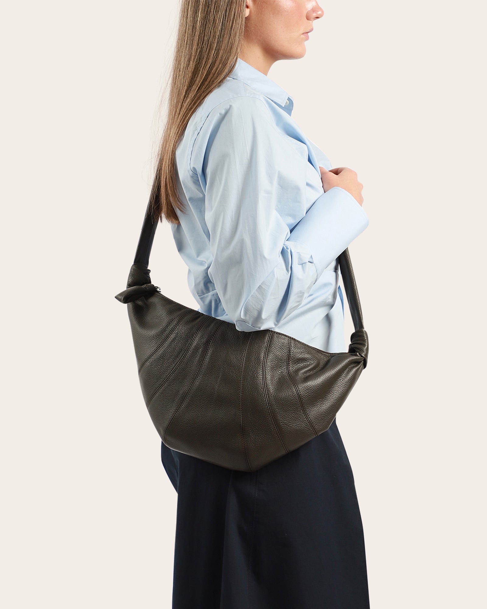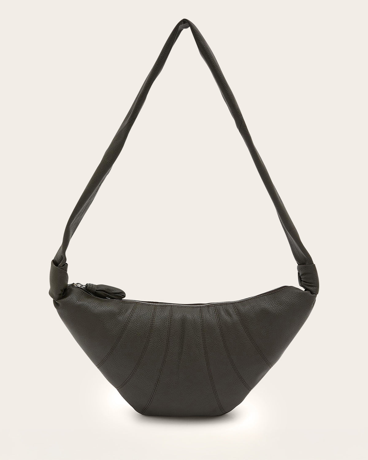 The Medium Croissant is made of soft grained leather, a supple yet resistant fabric. Its distinctive surface adds a tactile element and contributes to the durability of the bag’s curve. It has top-stitched cutouts, blending style and functionality, and features a matching looped zip puller and side knot finishings. Made in Spain.