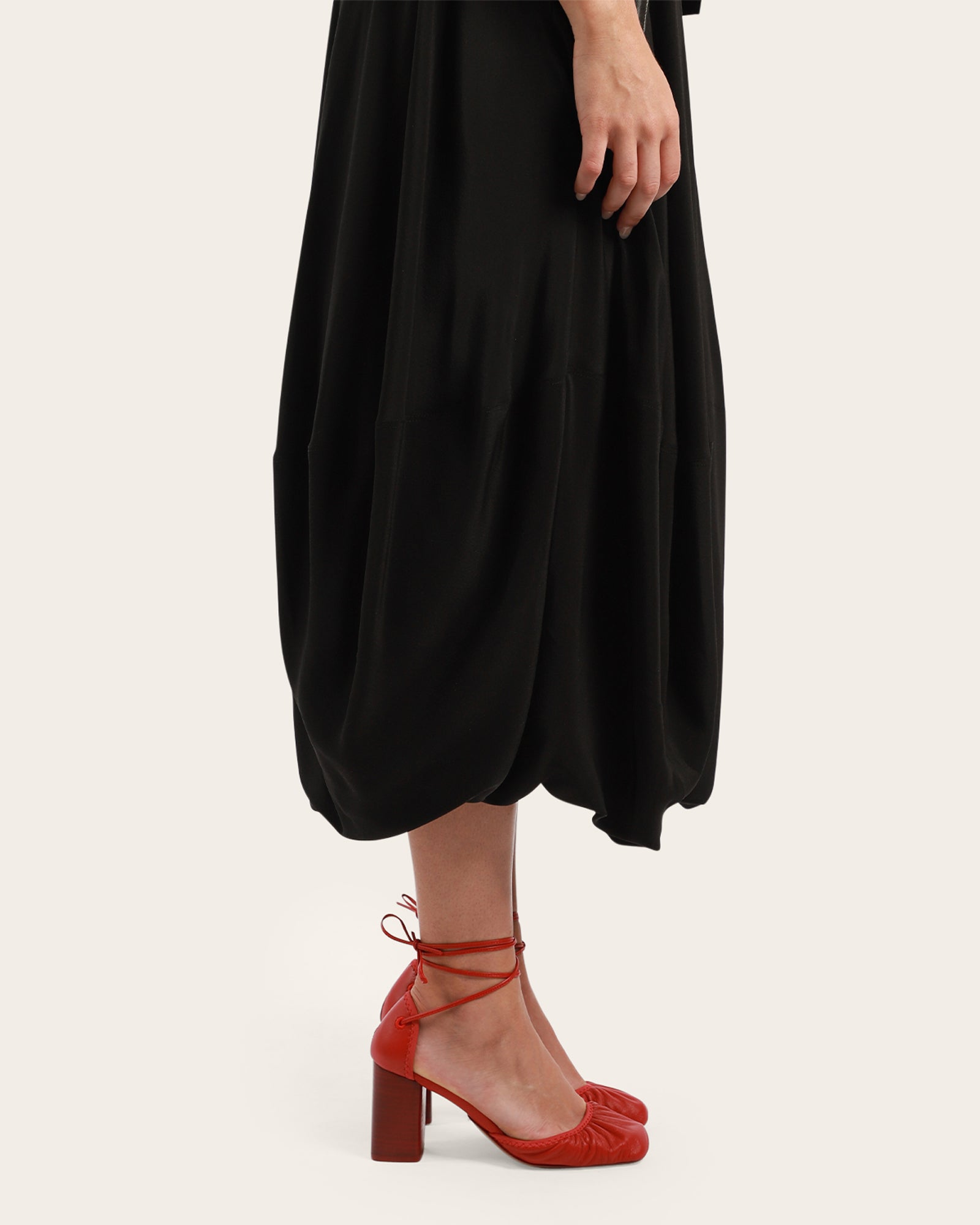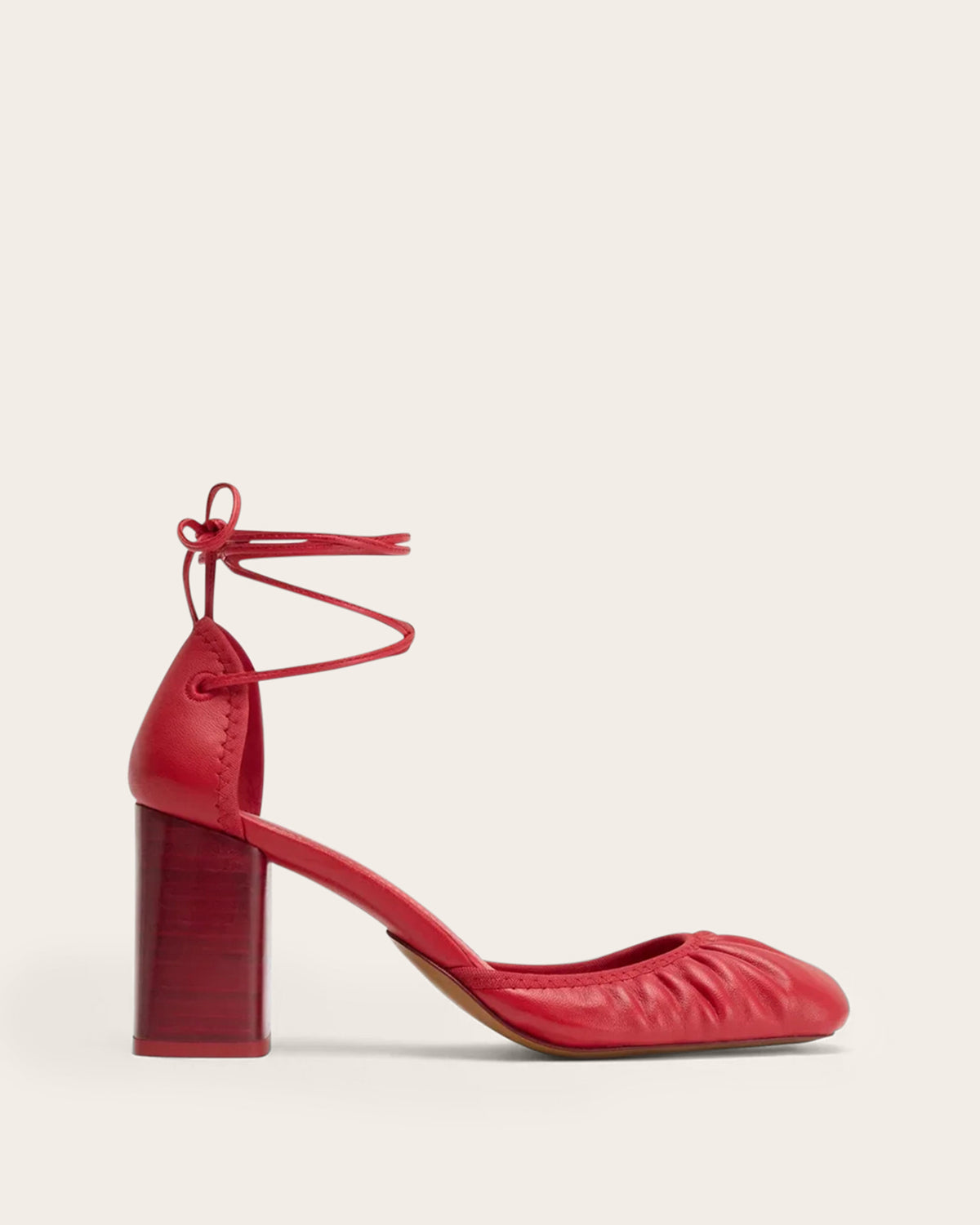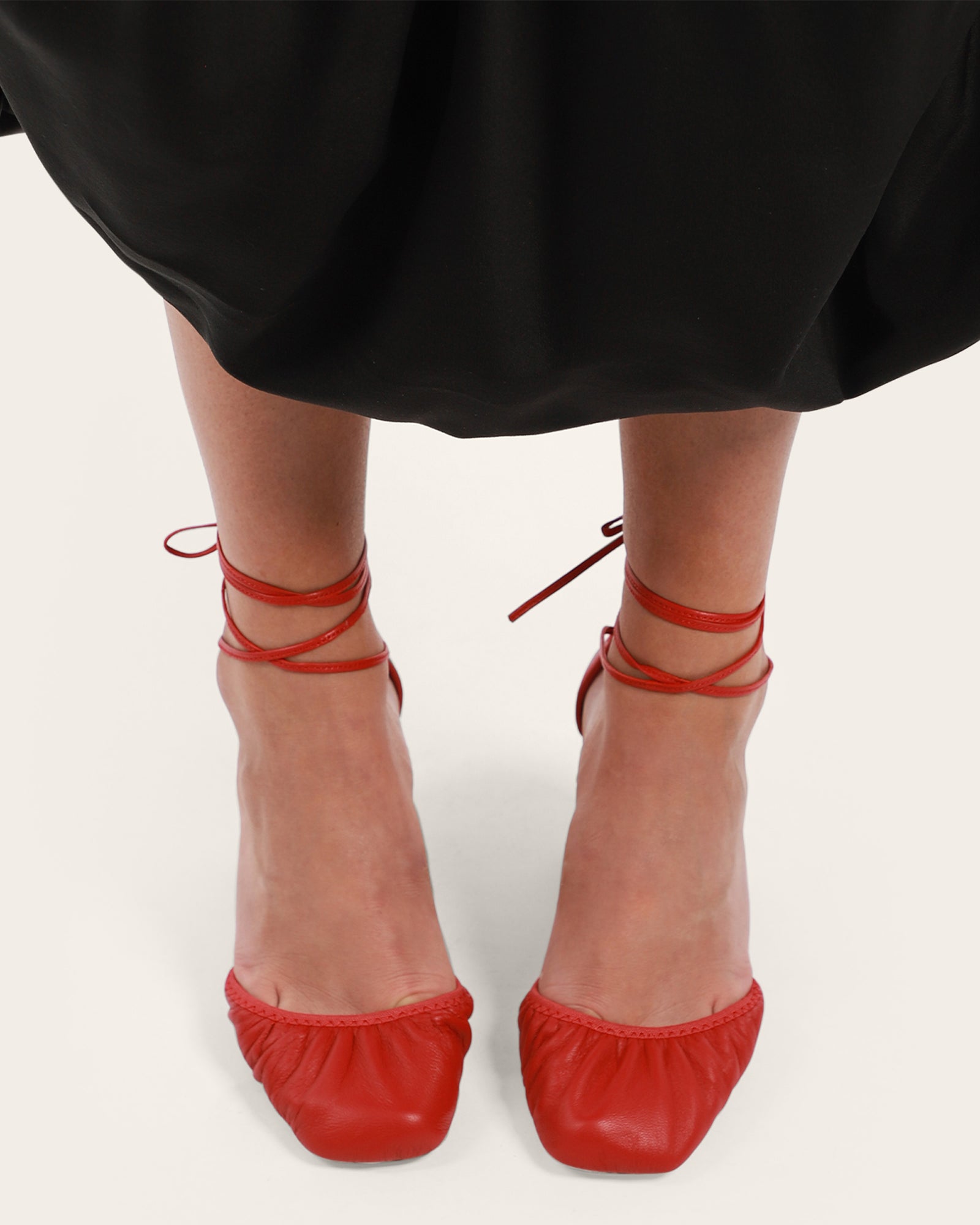 Inspired by ballet flats with a modern twist, the micro ballerina heel feature a tie strap around ankle, round gathered toe, supple leather, perfect to everyday wear or evening alternative. Made in Portugal.