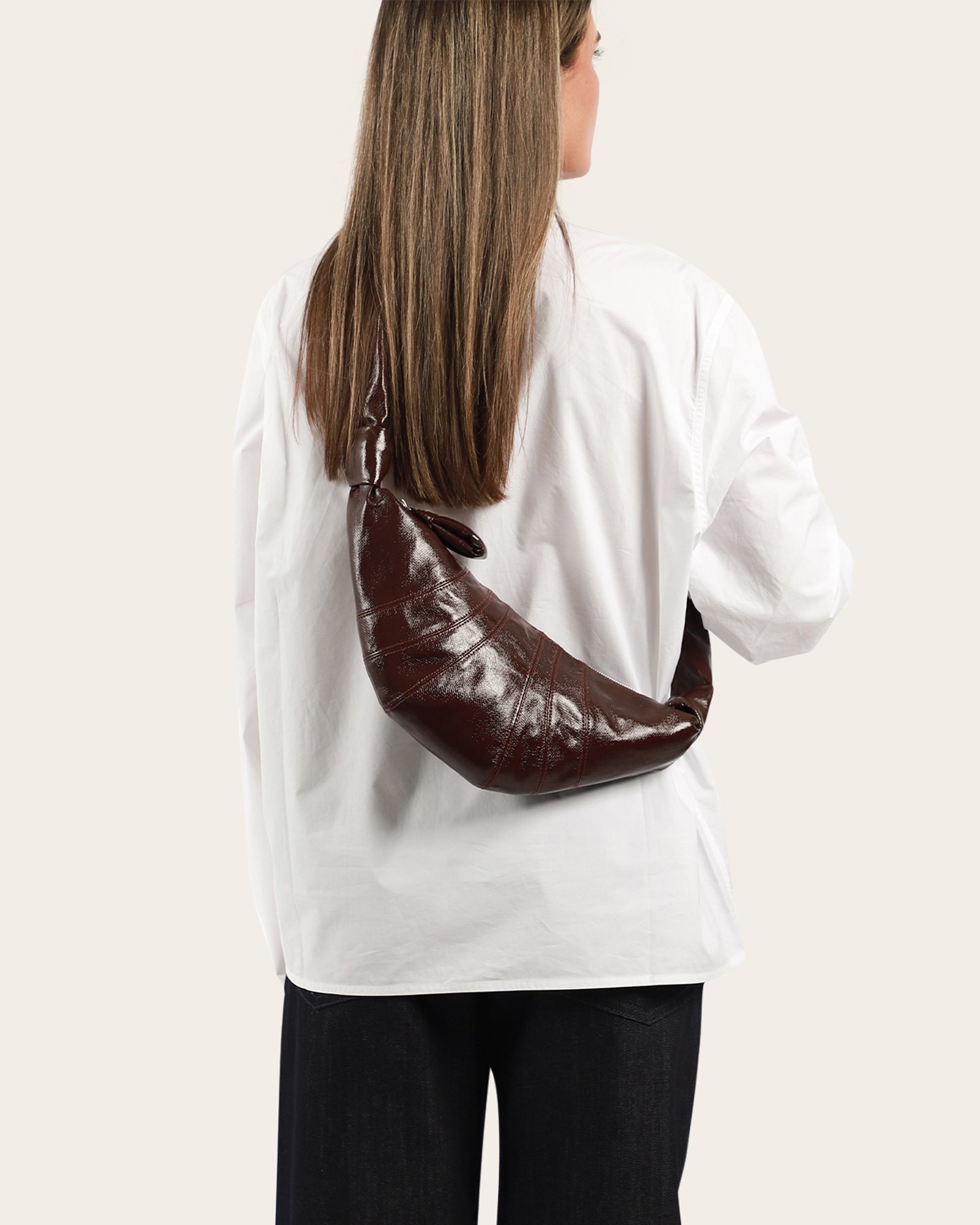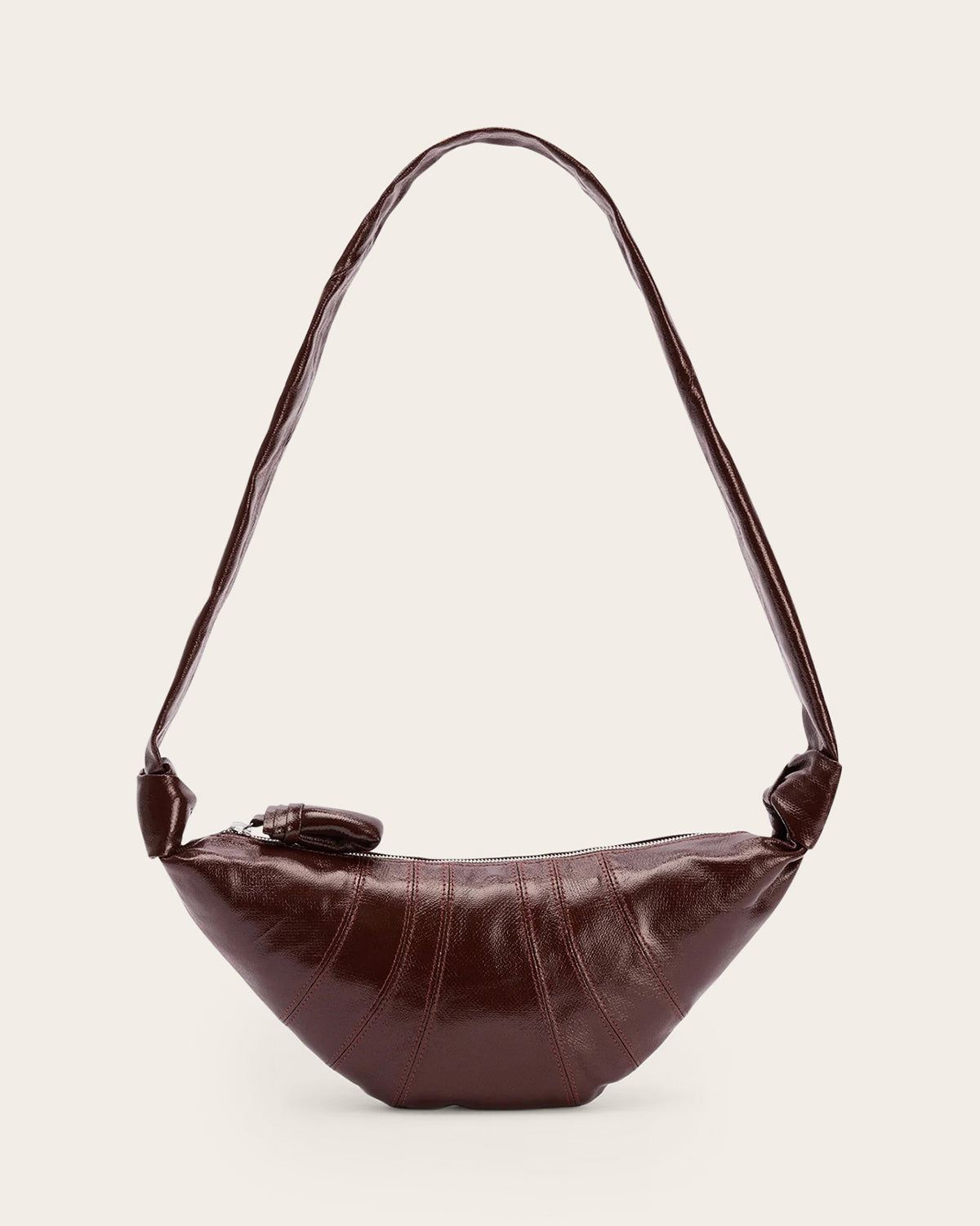 The Small Croissant is made from coated cotton with a crisp texture and a shiny finish, and has a distinctive surface that adds a tactile element and contributes to its durability. It has top-stitched cutouts, blending style and functionality, and features a matching looped zip puller and side knot finishings.