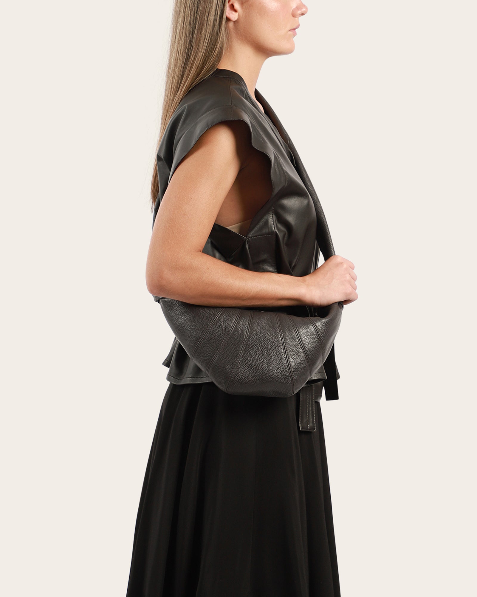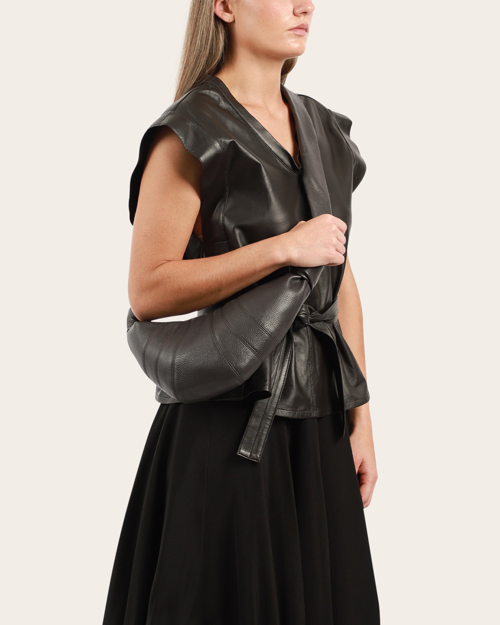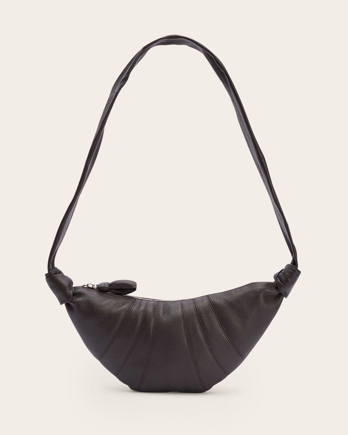 The Small Croissant is made of soft grained leather, a supple yet resistant fabric. Its distinctive surface adds a tactile element and contributes to the durability of the bag’s curve. It has top-stitched cutouts, and also features a matching looped zip puller and side knot finishings.