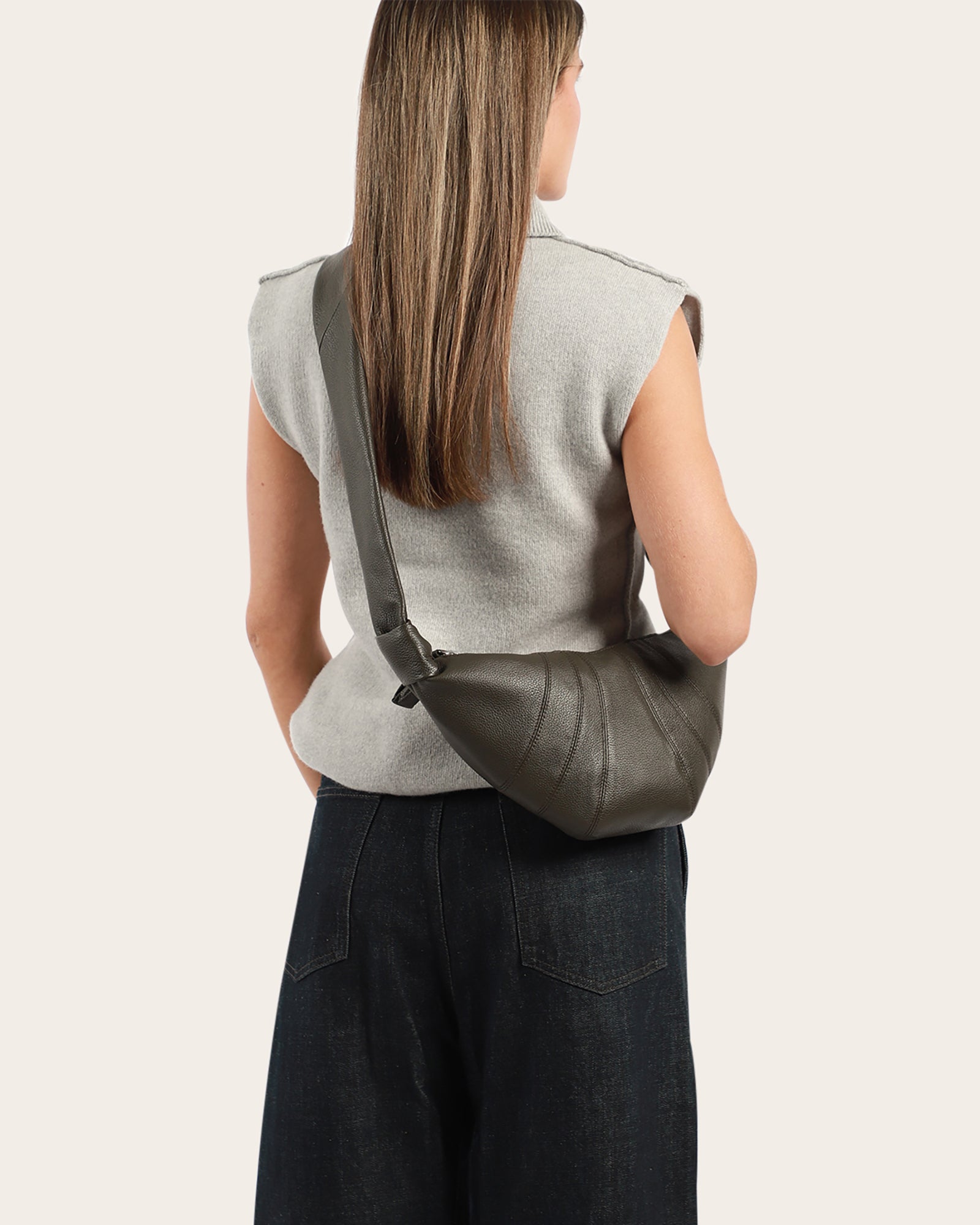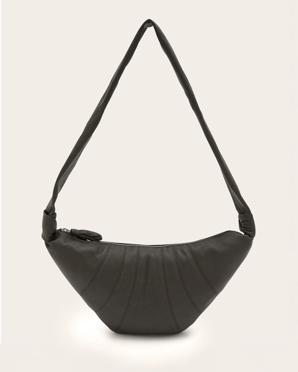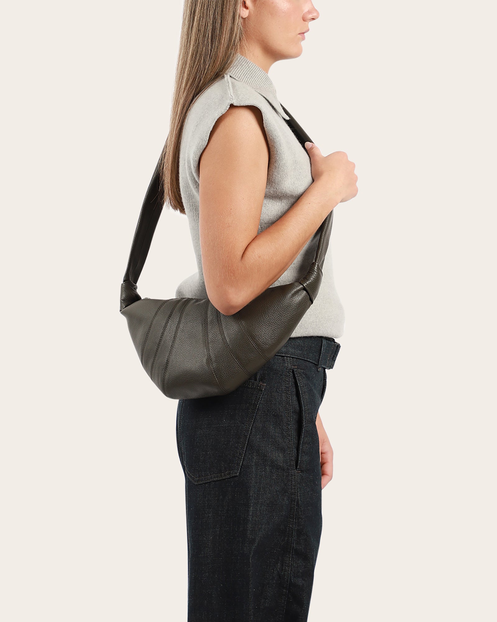 The Small Croissant is made of soft grained leather, a supple yet resistant fabric. Its distinctive surface adds a tactile element and contributes to the durability of the bag’s curve. It has top-stitched cutouts, and also features a matching looped zip puller and side knot finishings.
