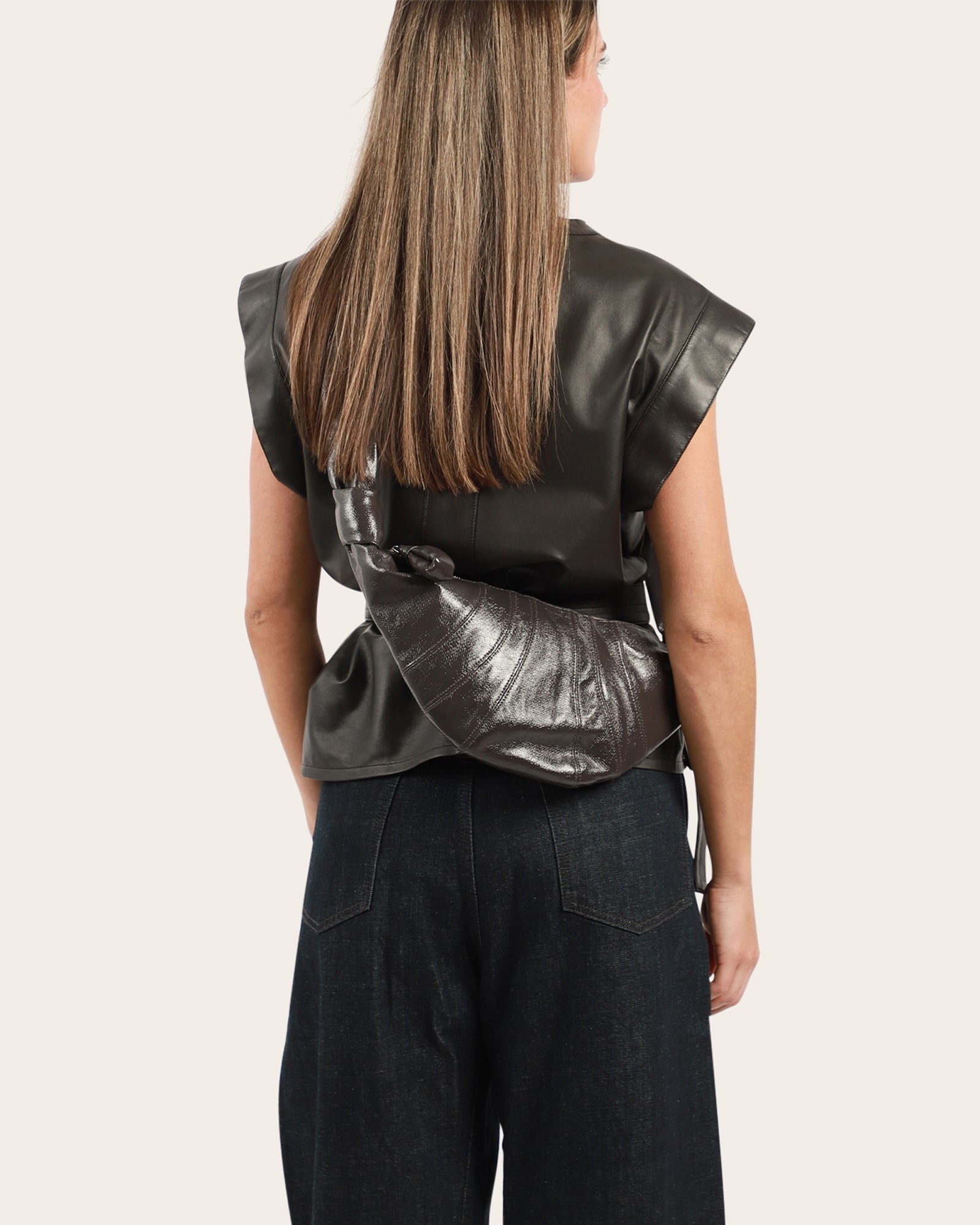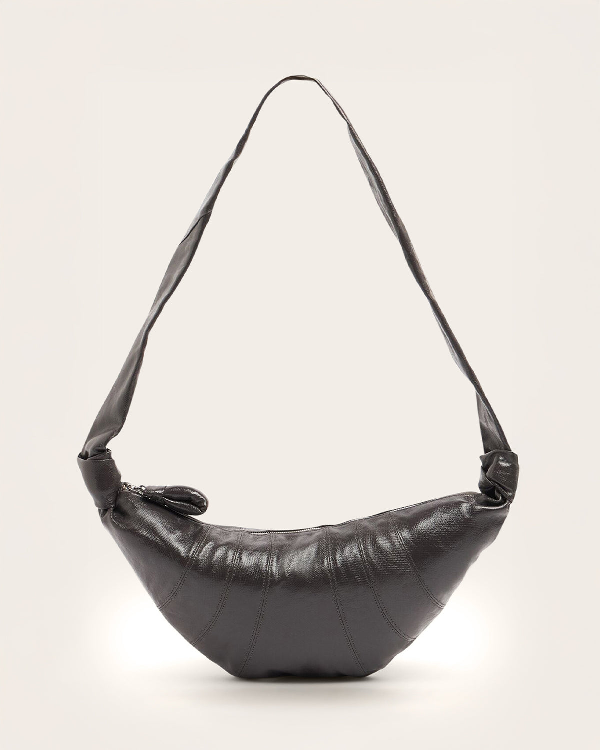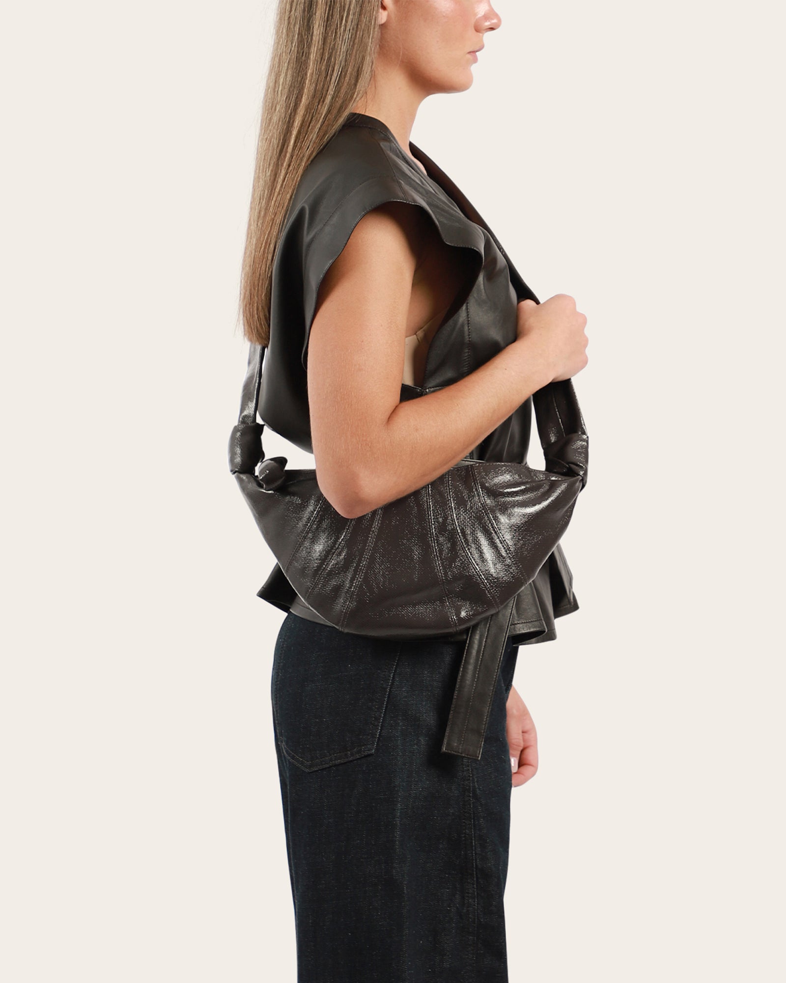 The Small Croissant is made from coated cotton with a crisp texture and a shiny finish, and has a distinctive surface that adds a tactile element and contributes to its durability. It has top-stitched cutouts, blending style and functionality, and features a matching looped zip puller and side knot finishings.