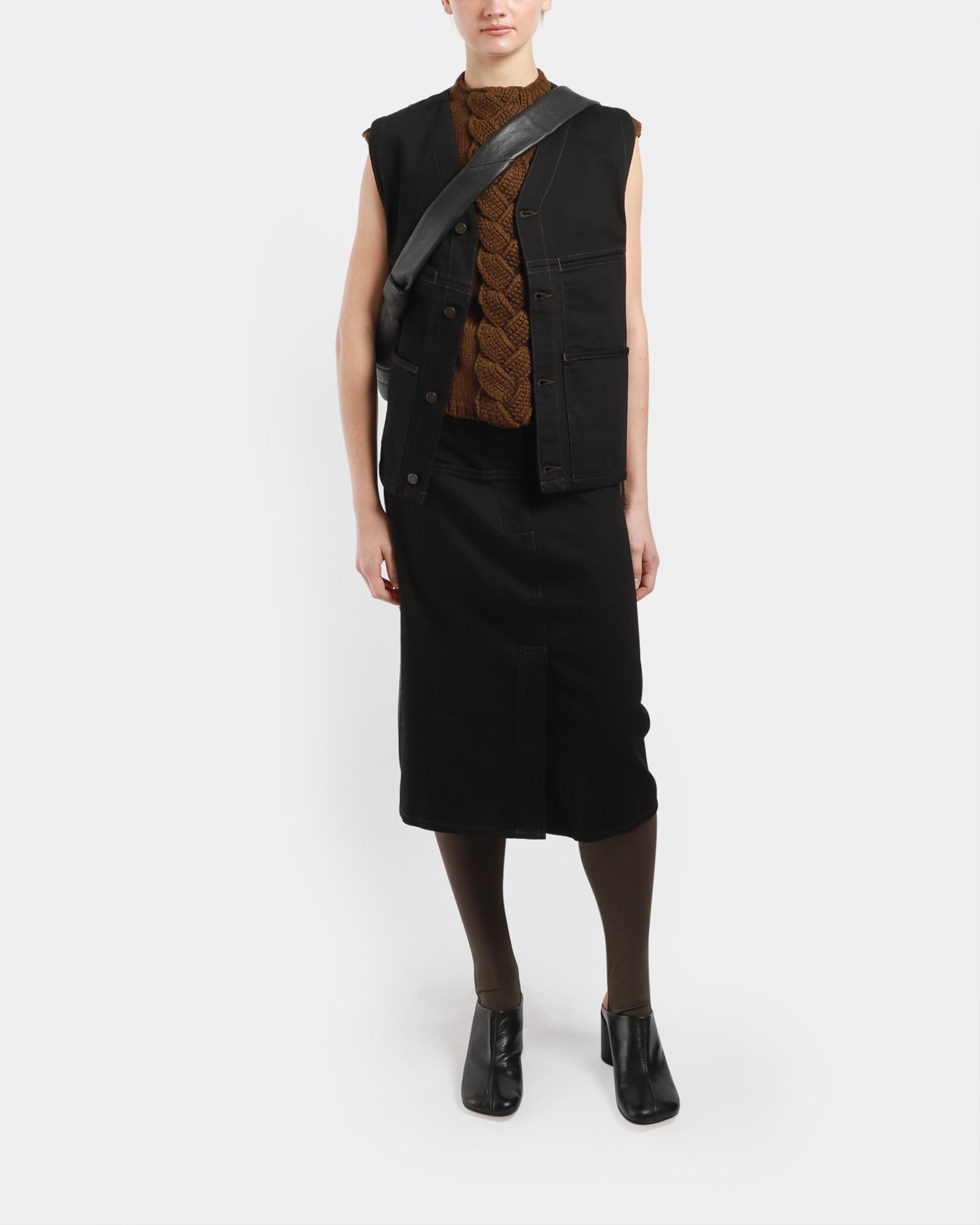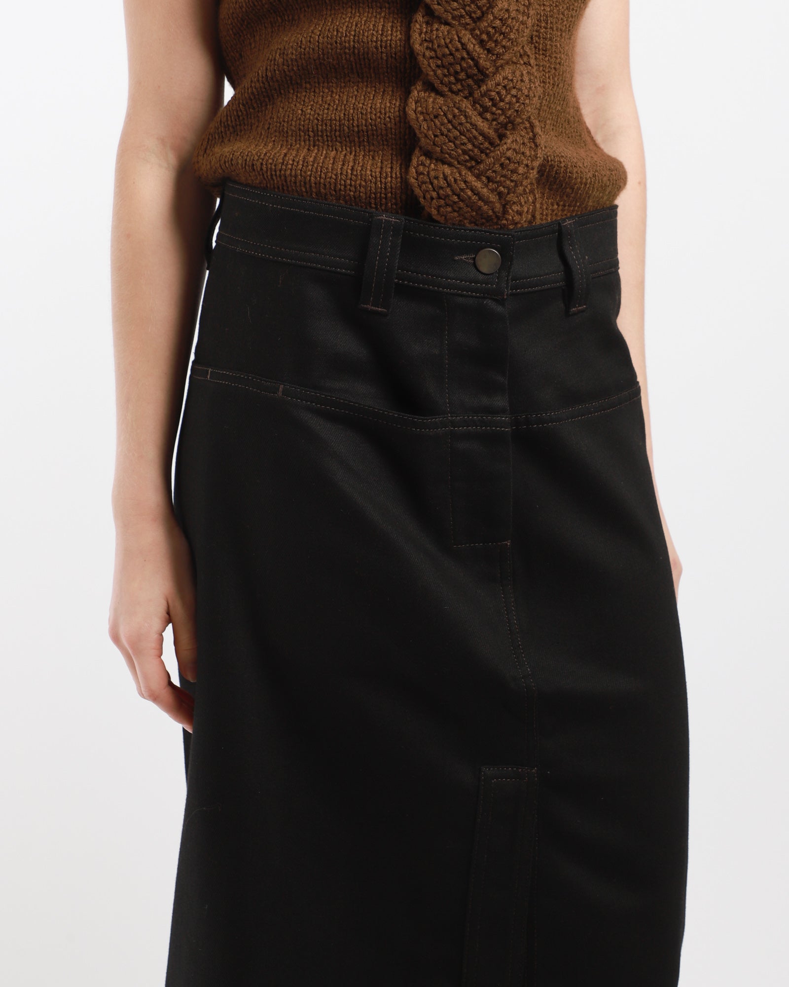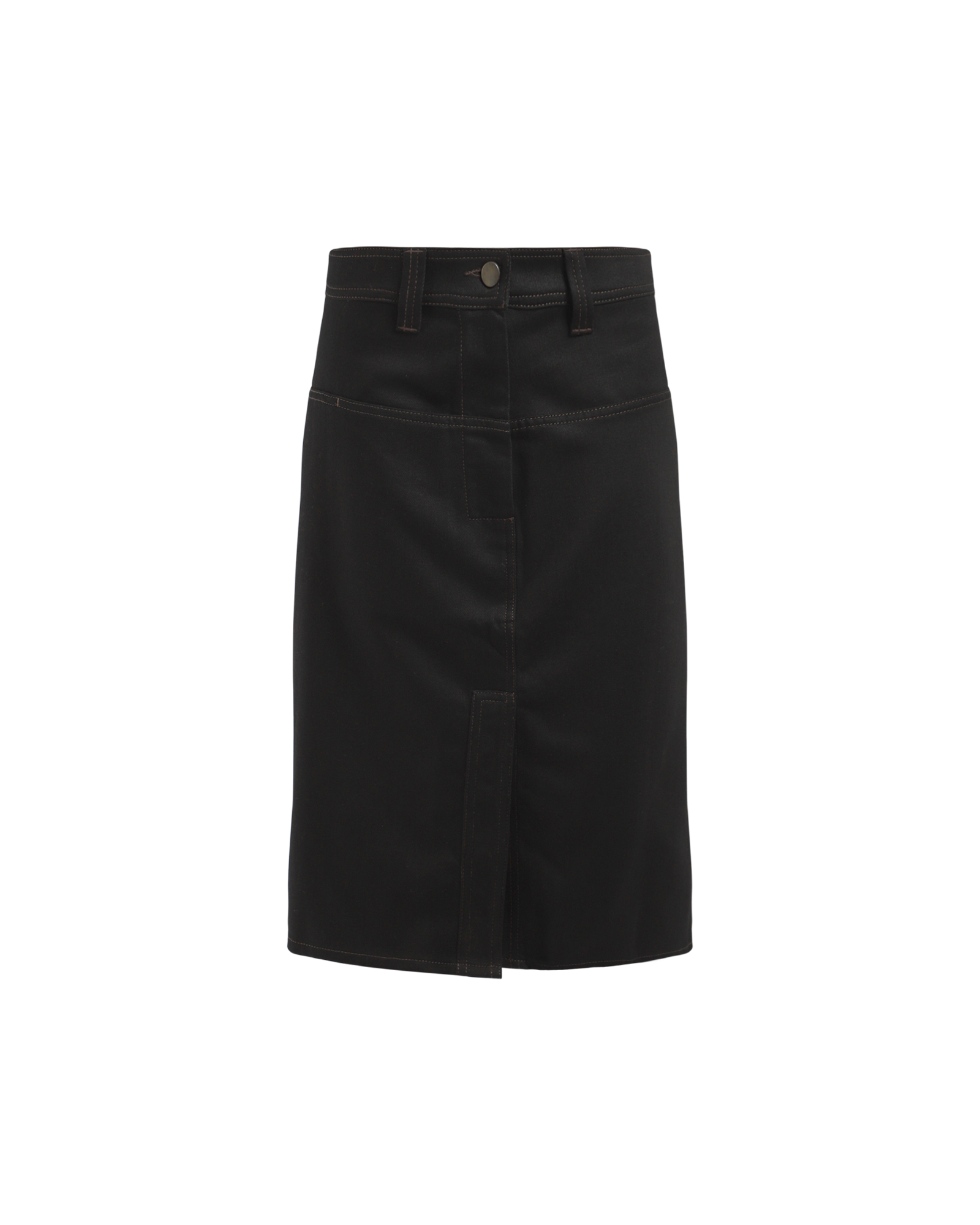 This Straight Denim Skirt is made of garment-dyed denim. It sits just below the knee with a front and back slit, belt loops, and a single pouch pocket at the front and back.