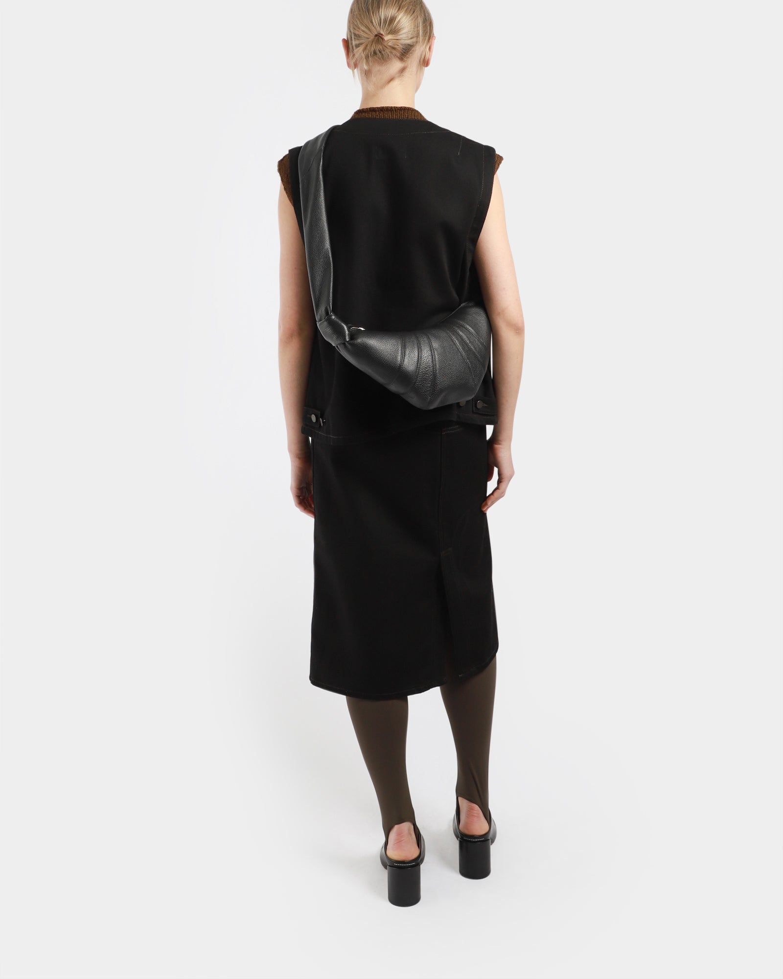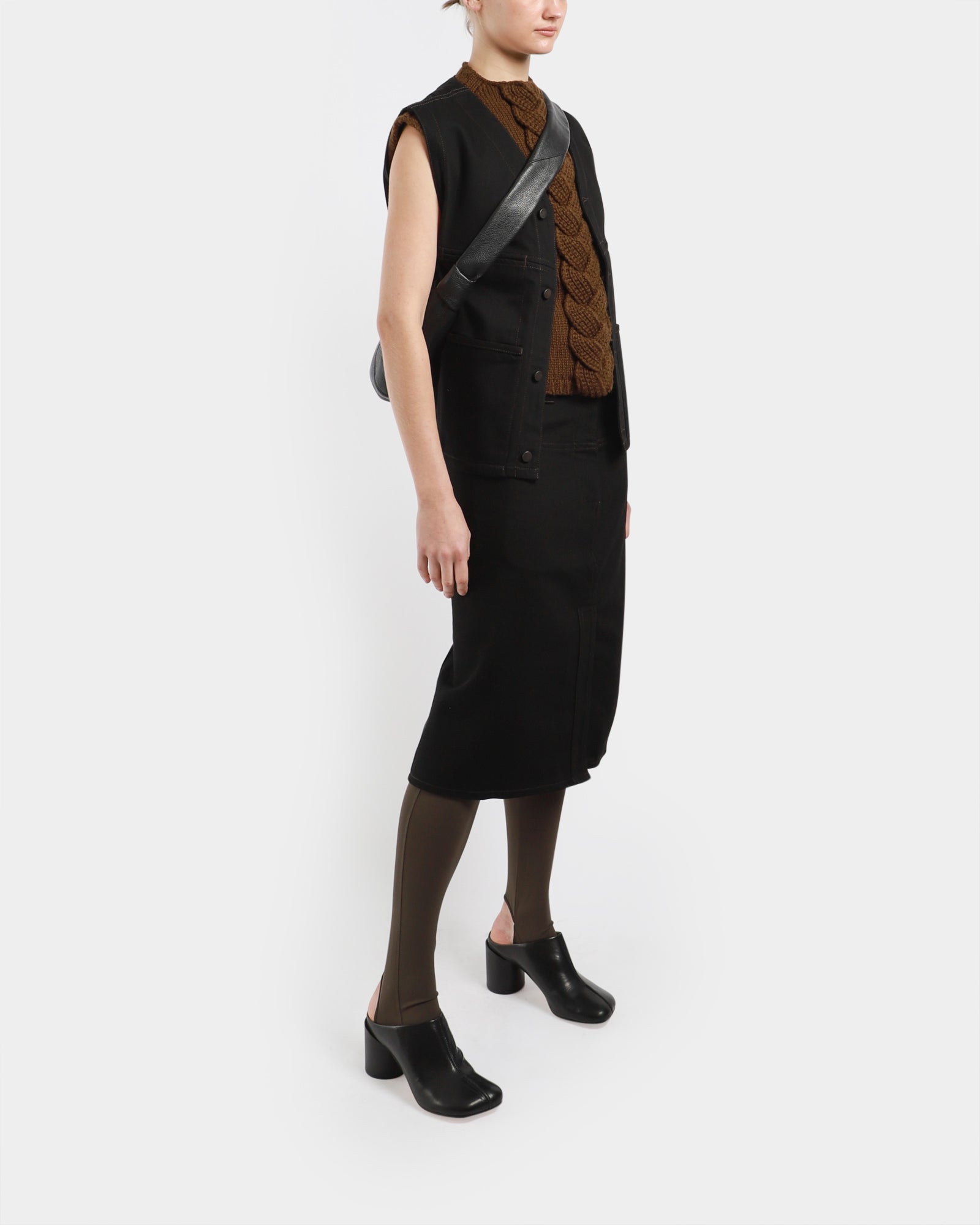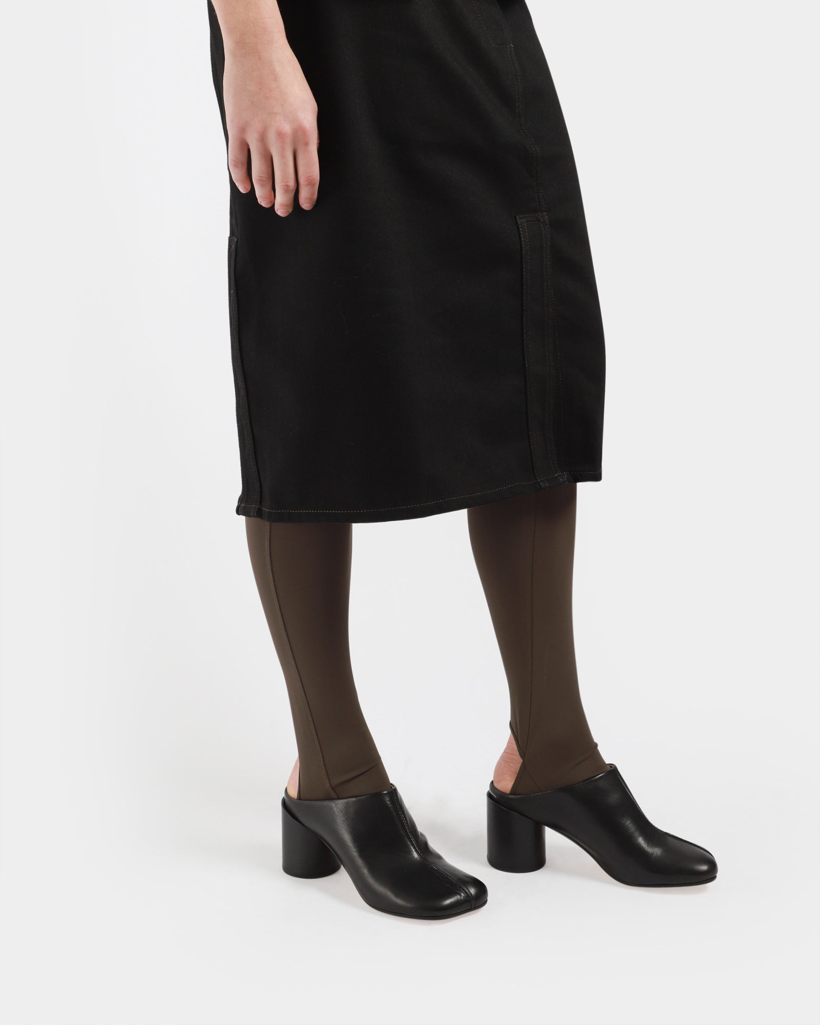 This Straight Denim Skirt is made of garment-dyed denim. It sits just below the knee with a front and back slit, belt loops, and a single pouch pocket at the front and back.