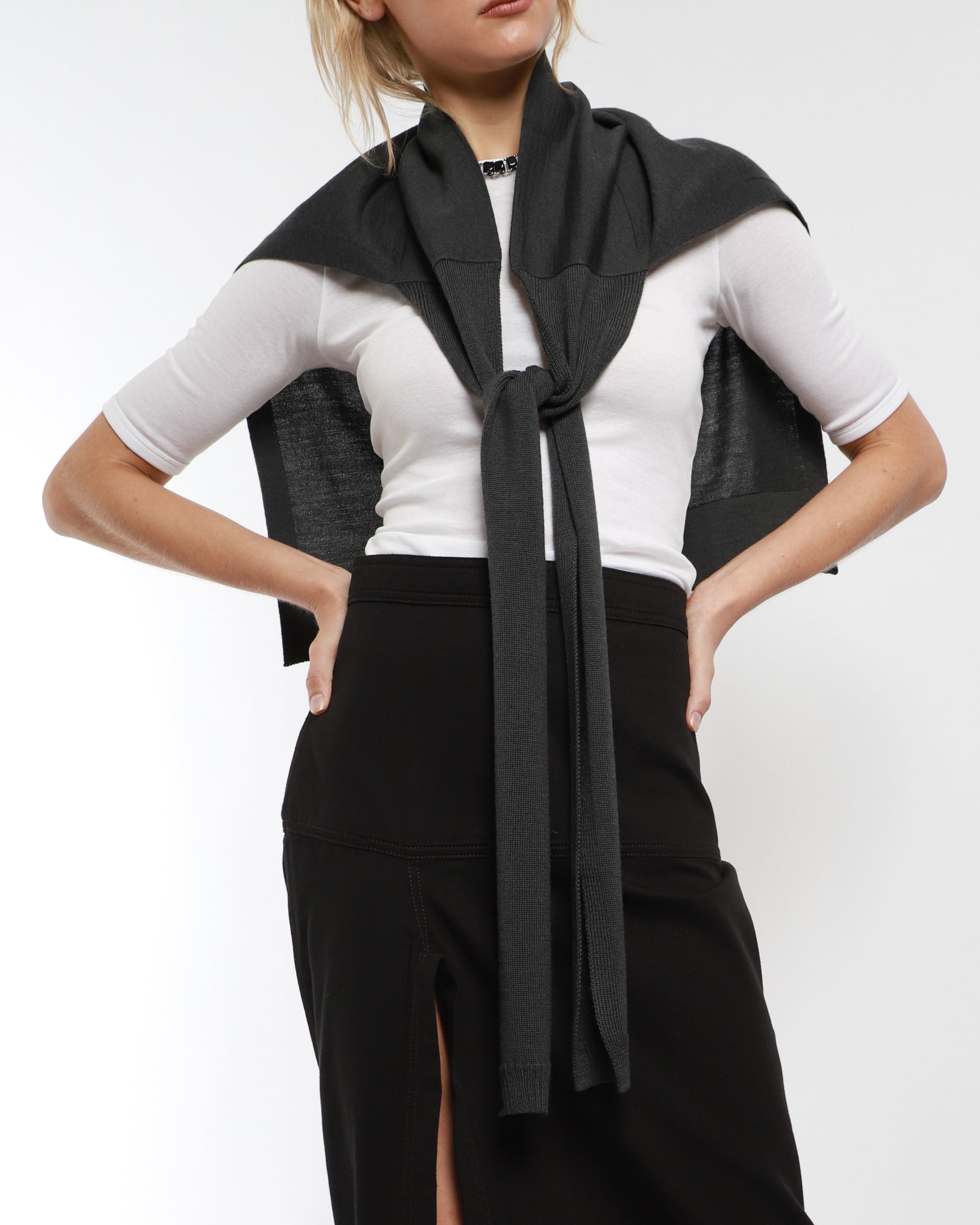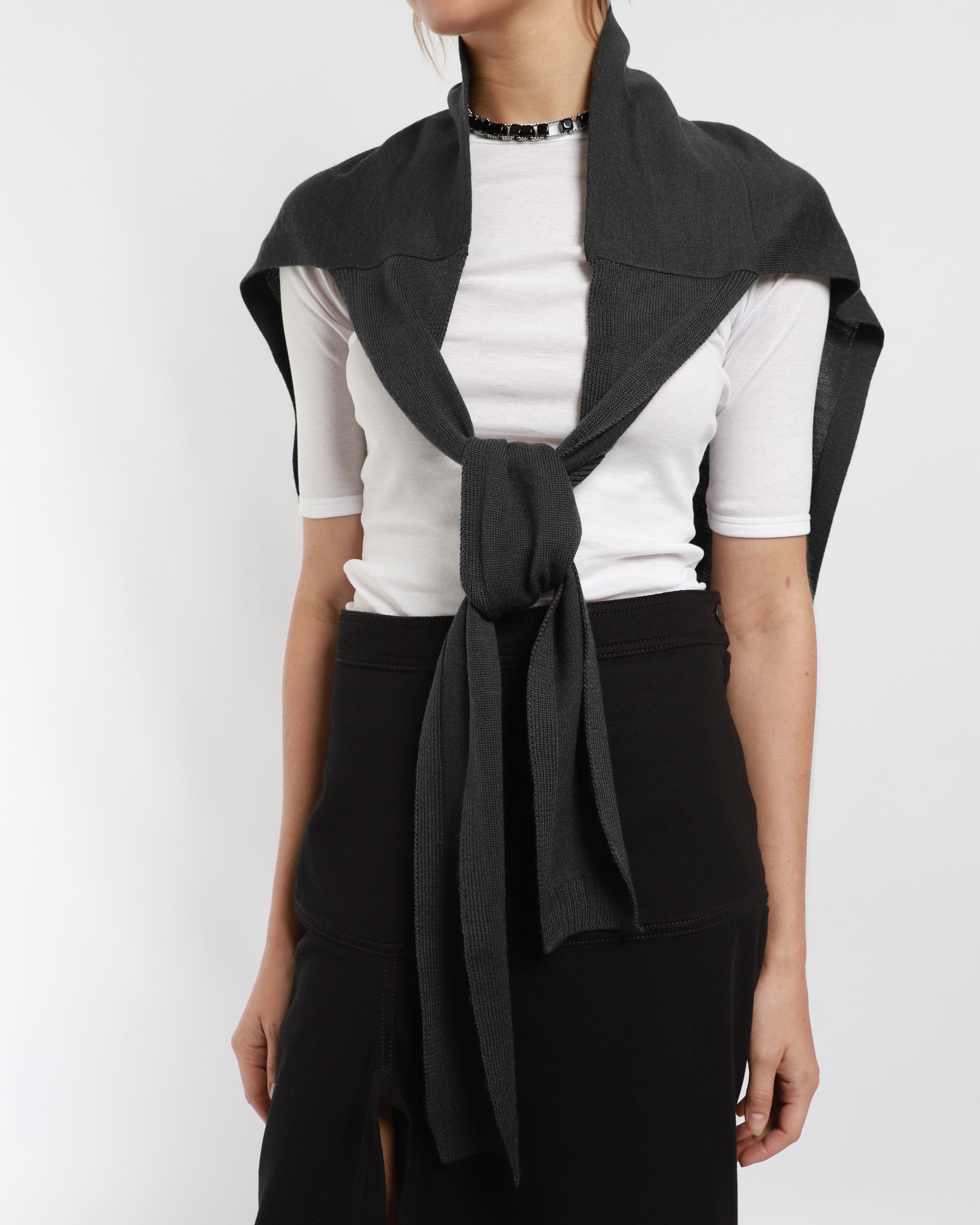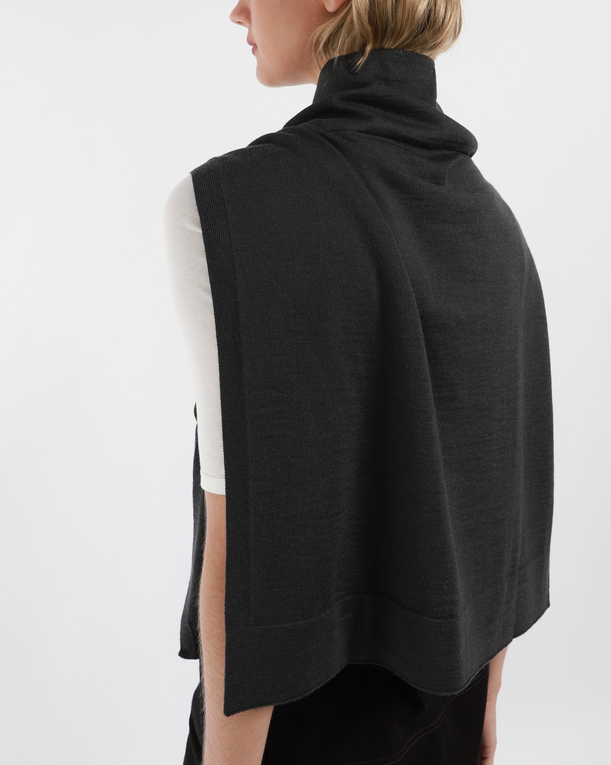 This Trompe L'Oeil Scarf is crafted from a merino wool blend, offering both warmth and a lightweight feel. The scarf is designed with a playful, folded-over effect, giving it a trompe l'oeil appearance as if it’s casually tied. The soft, ribbed knit enhances its texture, making it perfect for layering. Made in Portugal.