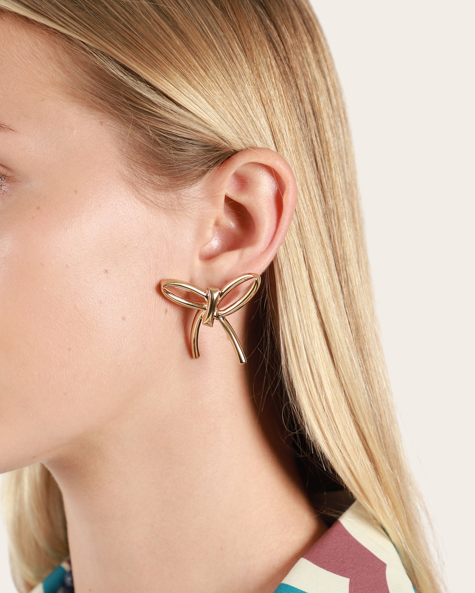 These gold-tone metal earrings feature a delicate bow design, sculpted to evoke the fluidity of cascading fabric. Finished with a natural freshwater pearl back for an elegant touch. Made in Italy.