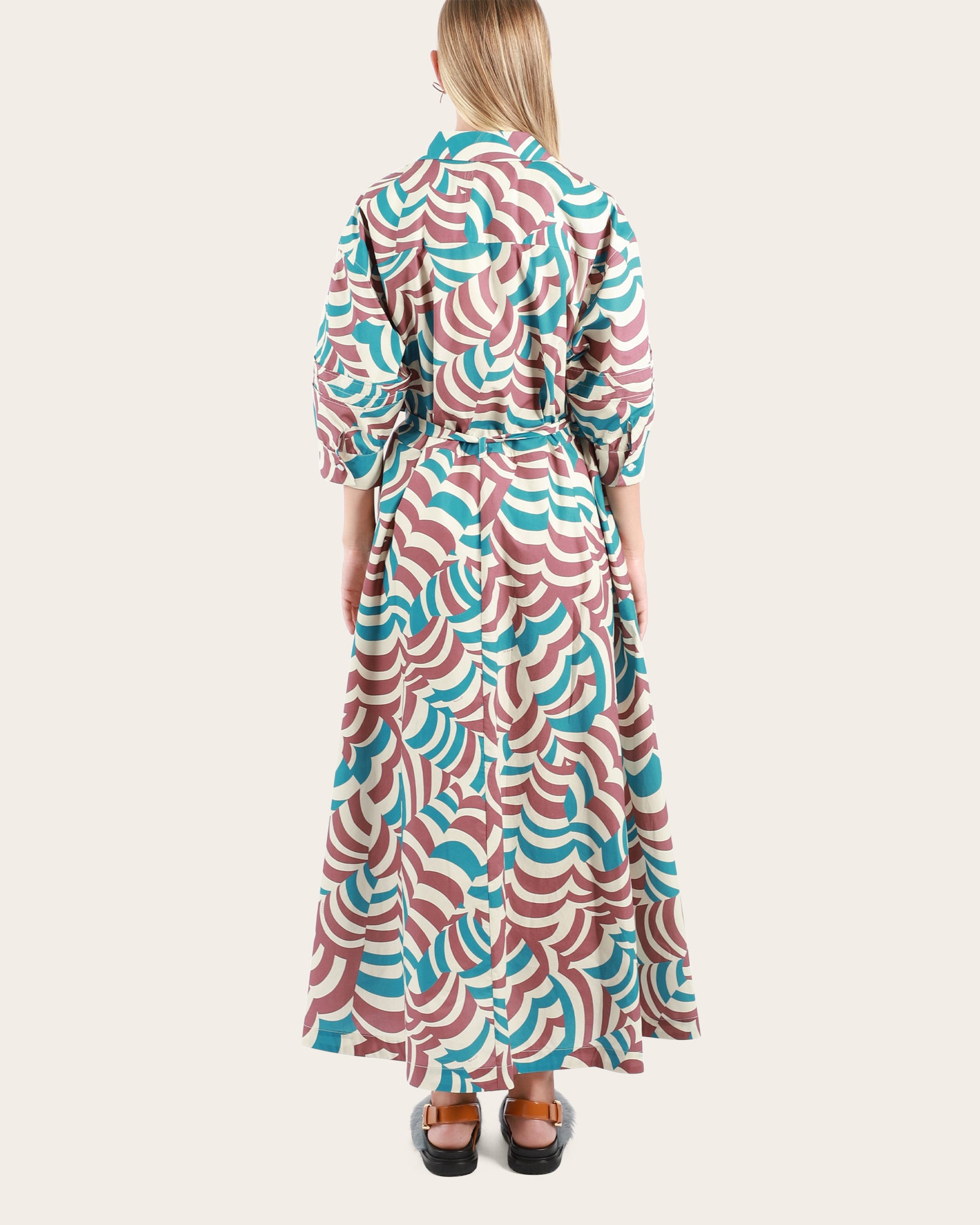 Crafted from crisp cotton poplin, this shirt dress is designed with an oversized silhouette and a dramatic low back hem. Printed with the season’s bold Melodia floral, sourced from the Marni archives, it features a contrast neck tie, 3/4 sleeves, and a front button closure.