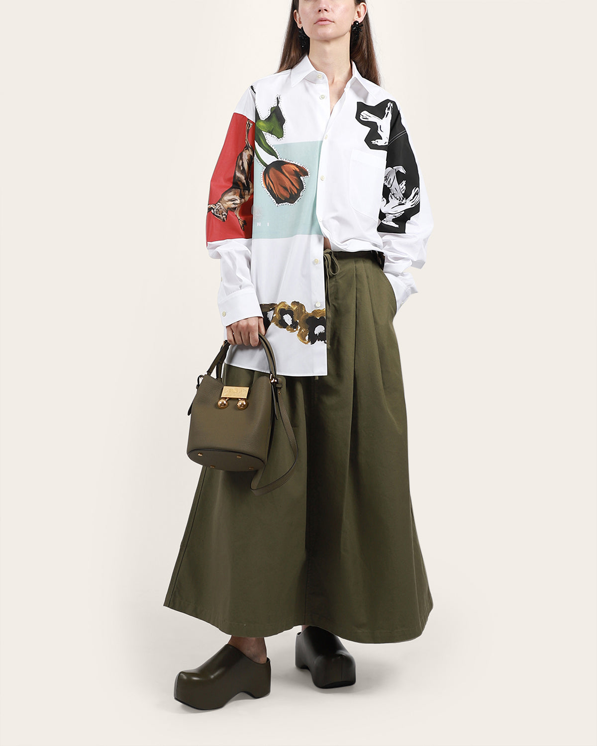 Inject artistic flair into your wardrobe with this Print Shirt from Marni, a standout piece that blends classic tailoring with avant-garde sensibility. Cut from crisp white 100% cotton poplin, this long-sleeve button-up shirt is adorned with an eclectic collage of painterly prints, including abstract florals, flying birds, and bold color-blocked panels, that evoke a hand-crafted, almost surrealist aesthetic.