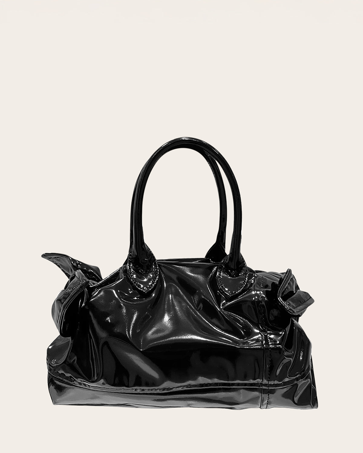 A soft mini bag, featuring tied bows on each side, two small handles at top, a zipped pocket inside and a shiny finish. Perfect lightweight mini bag, to fit all your essentials. Made in Japan.