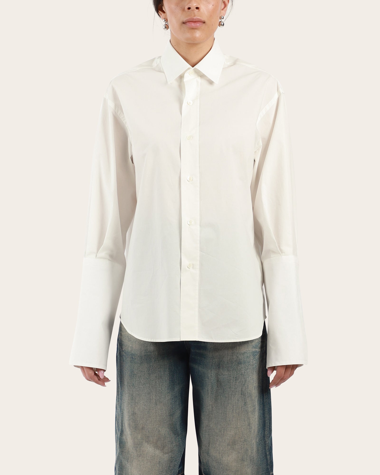 Crafted from crinkled cotton, this white button down shirt features a straight collar, front button closure, and a relaxed silhouette. Designed with extra-long sleeves and oversized barrel cuffs secured by two snap buttons. Finished with a classic shirttail hem for a modern twist on a wardrobe staple. Made in Italy.