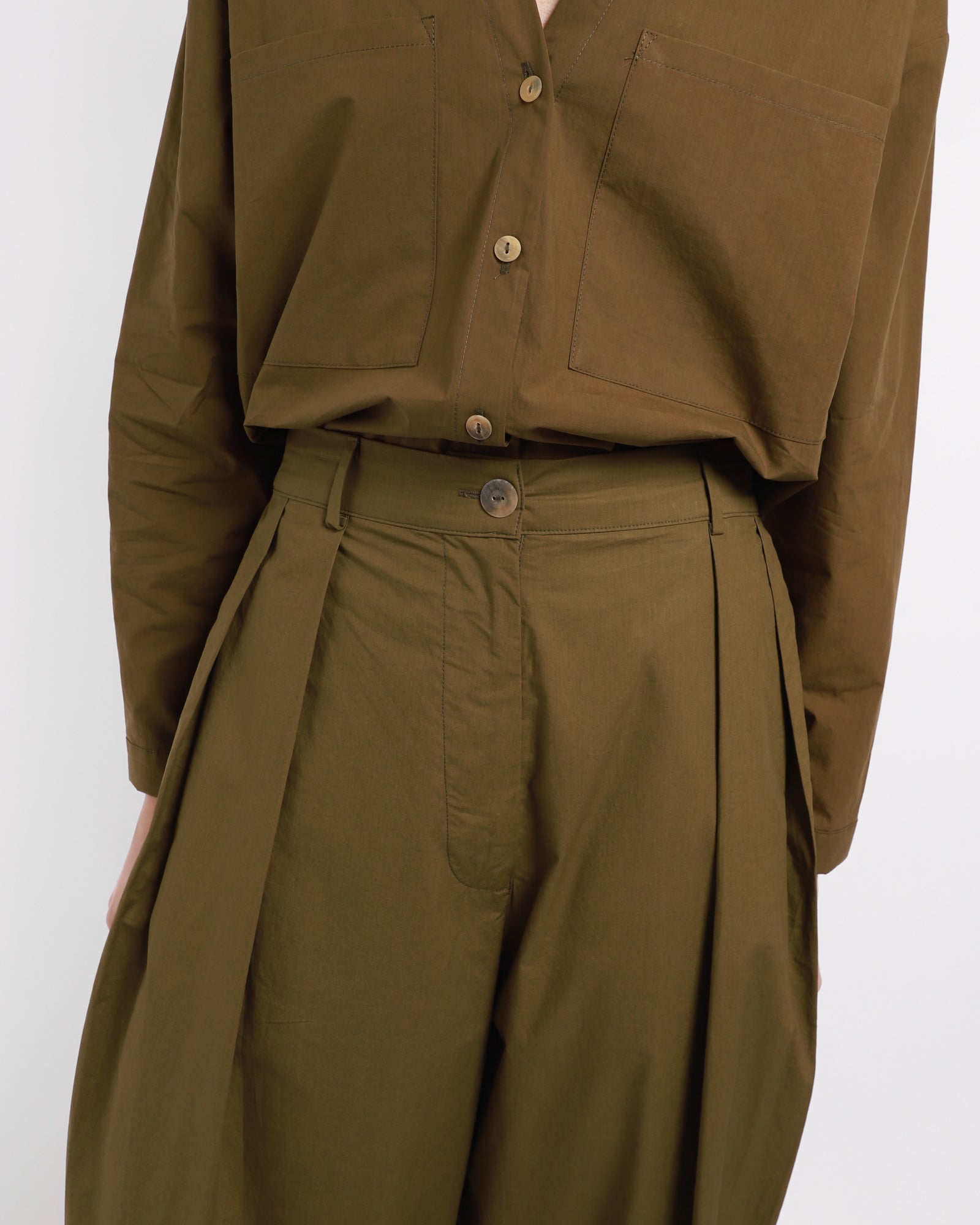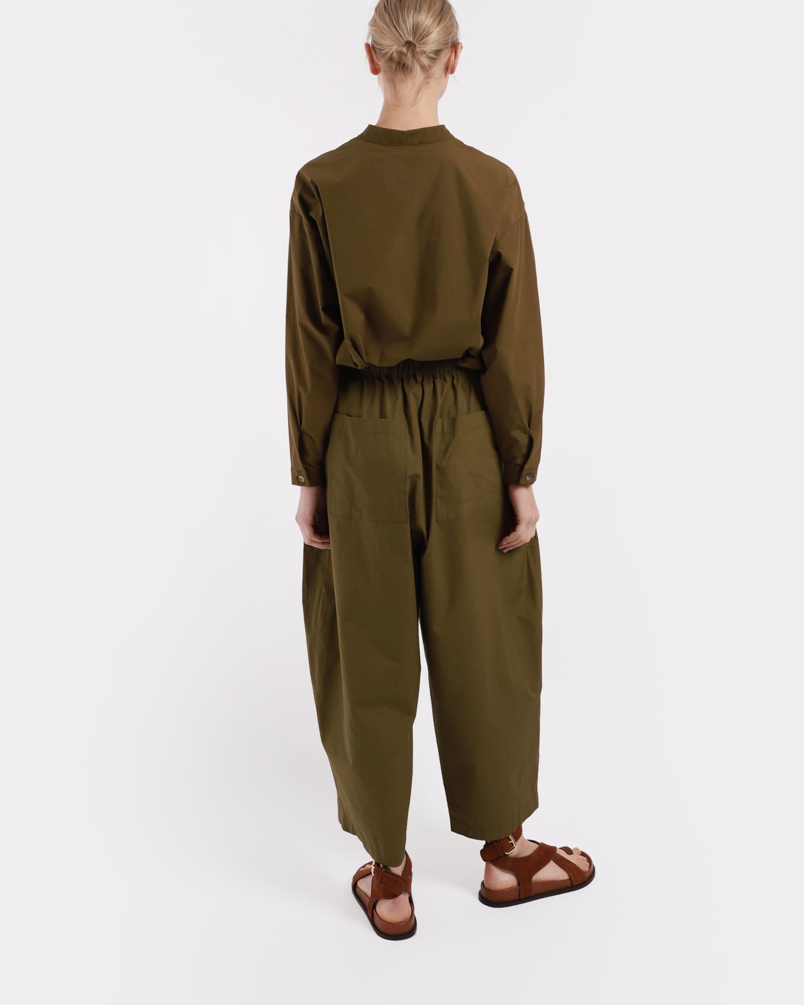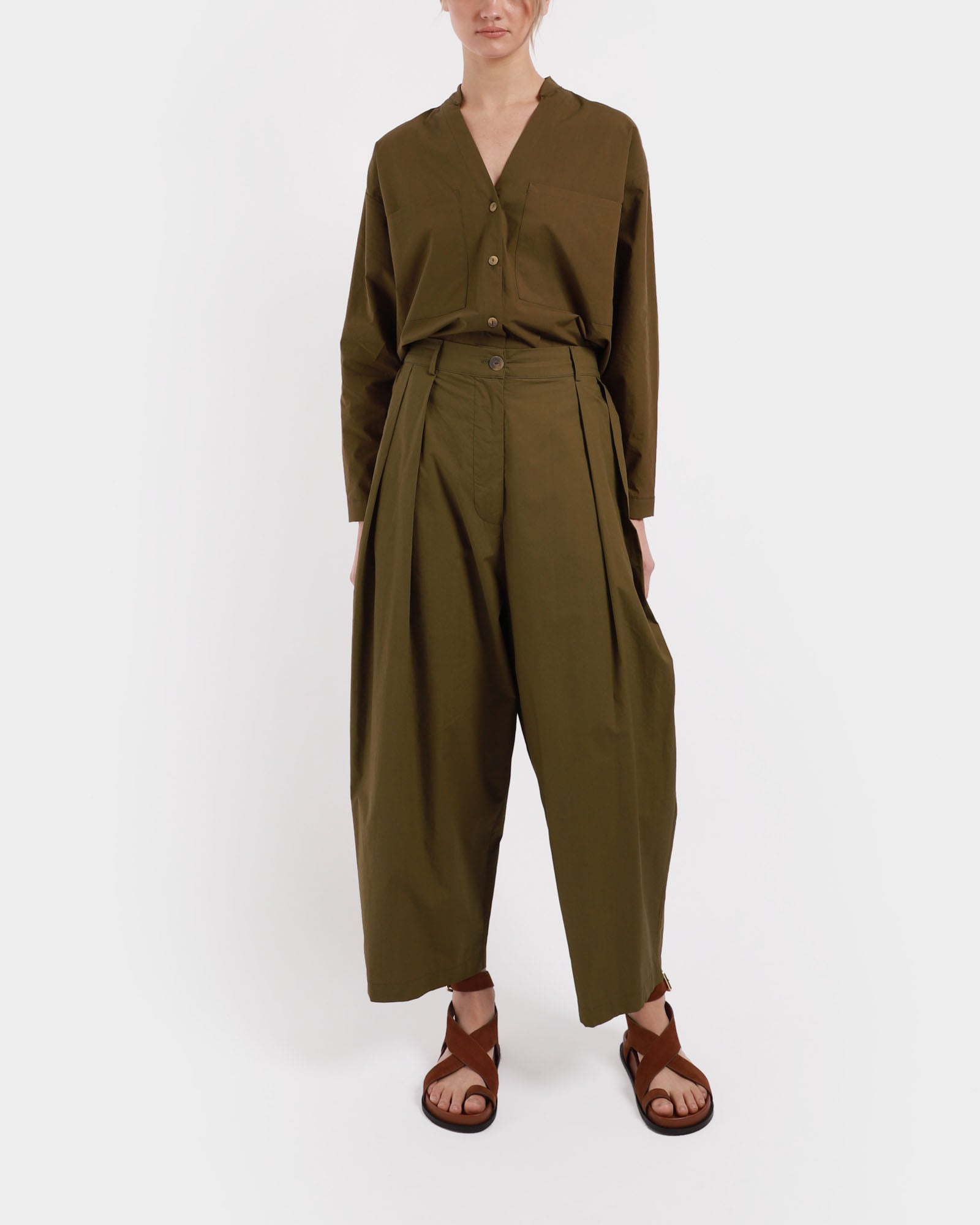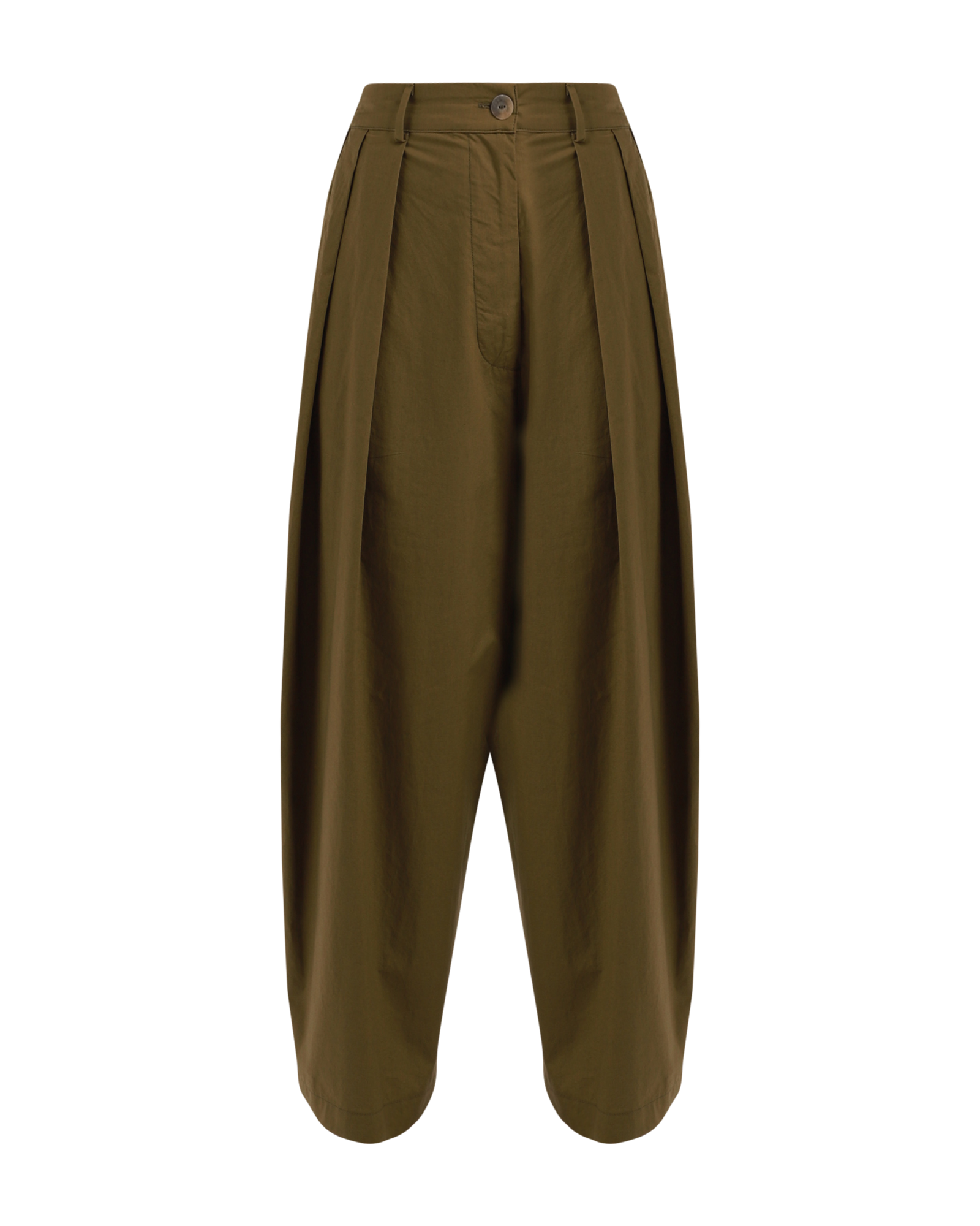 The Voluminous Pleat Pants are made from soft, crisp Japanese BCI cotton and designed for a relaxed fit. They feature a tailored front with a zip fly and button closure, deep pleat detailing, and subtly curved outer seams. The back is elasticated with belt loops fitted at the front and back. Made in USA.