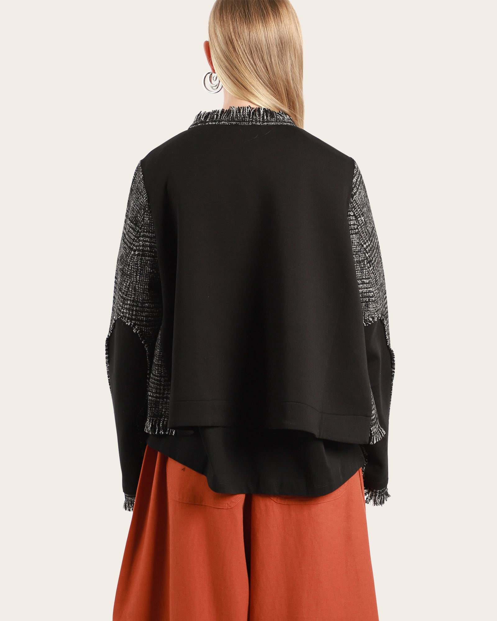 A cropped jacket featuring ruffle edges at hem, invisible buttons at front to close, side flap pockets, contrast fabric at back.
