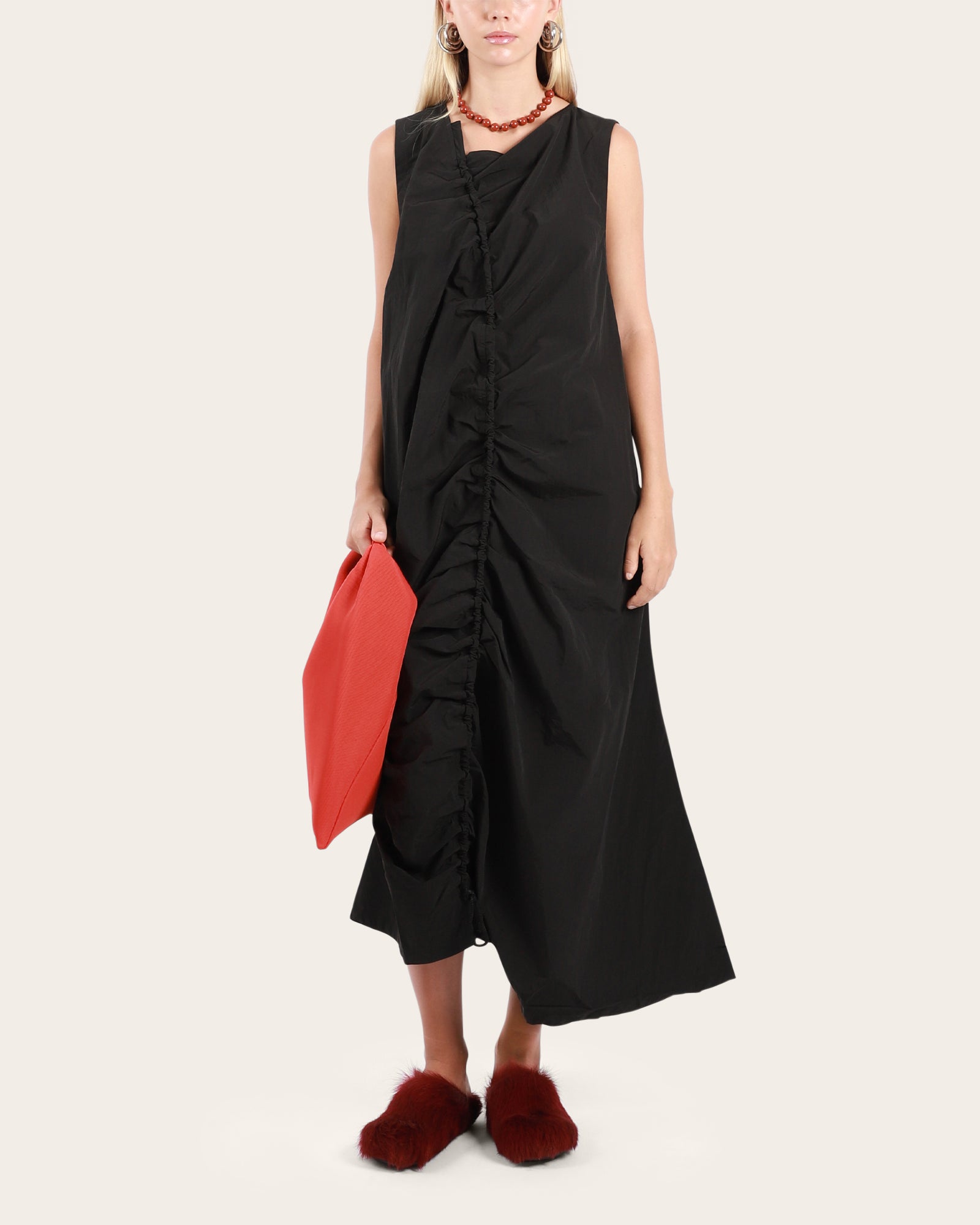 A sleeveless black dress with a sculptural, relaxed silhouette. Designed with a soft V-neckline and a distinctive adjustable ruched seam through the centre front and back , it creates natural volume and fluid movement. Cut in a lightweight fabric with an asymmetrical hem, it balances modern structure with effortless wearability.
