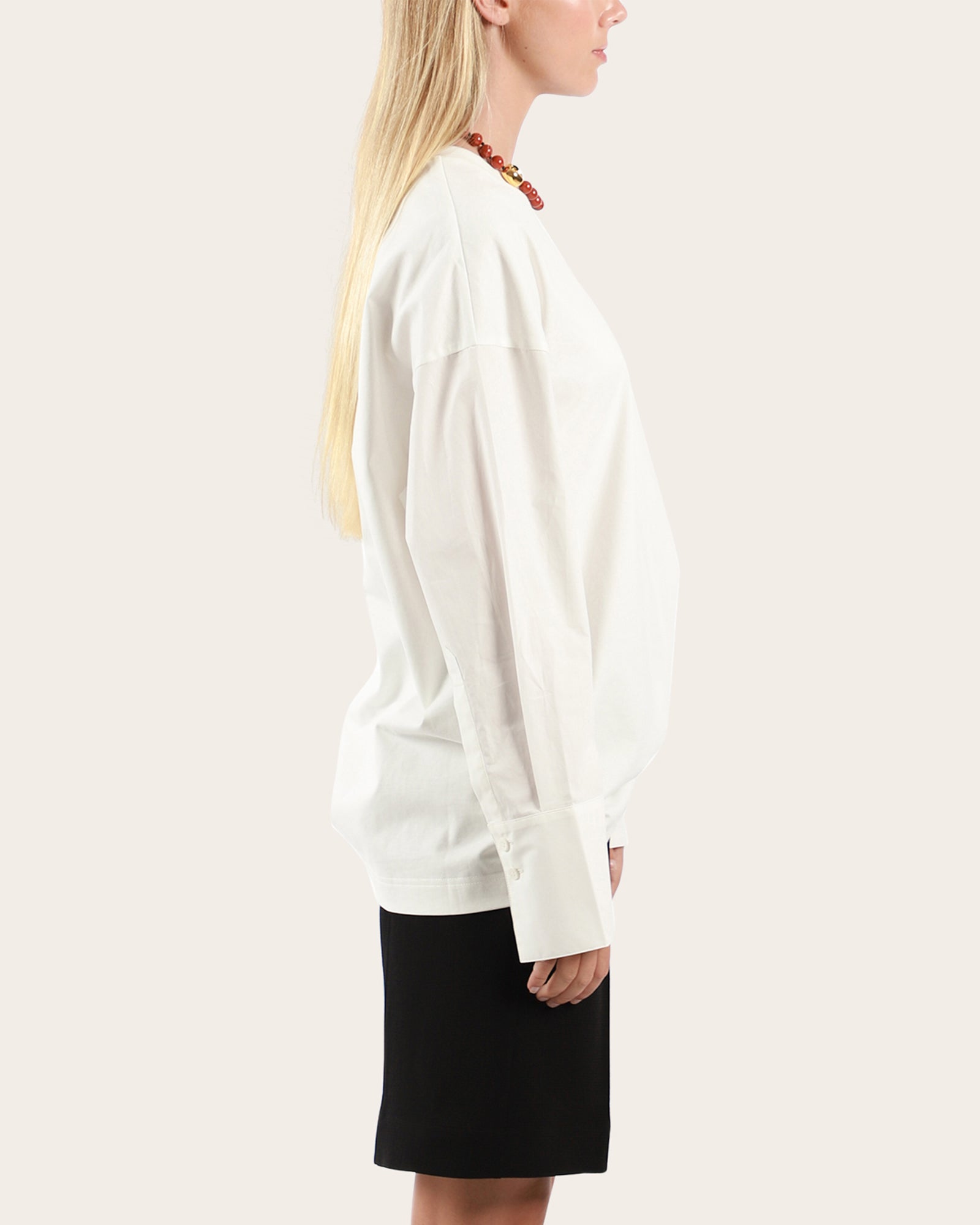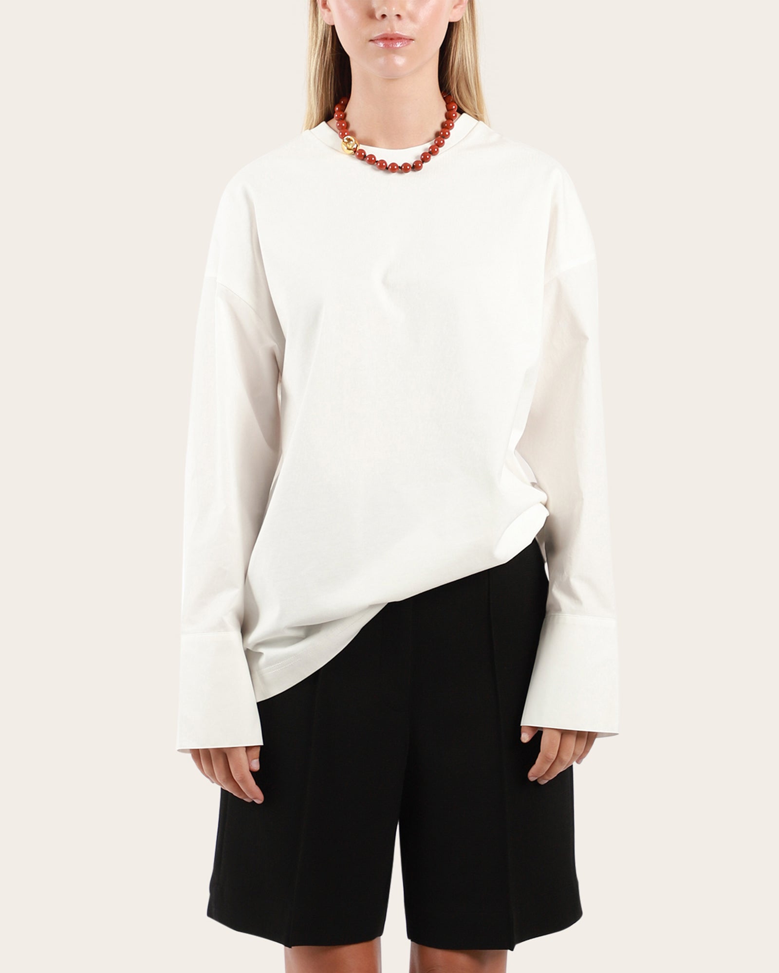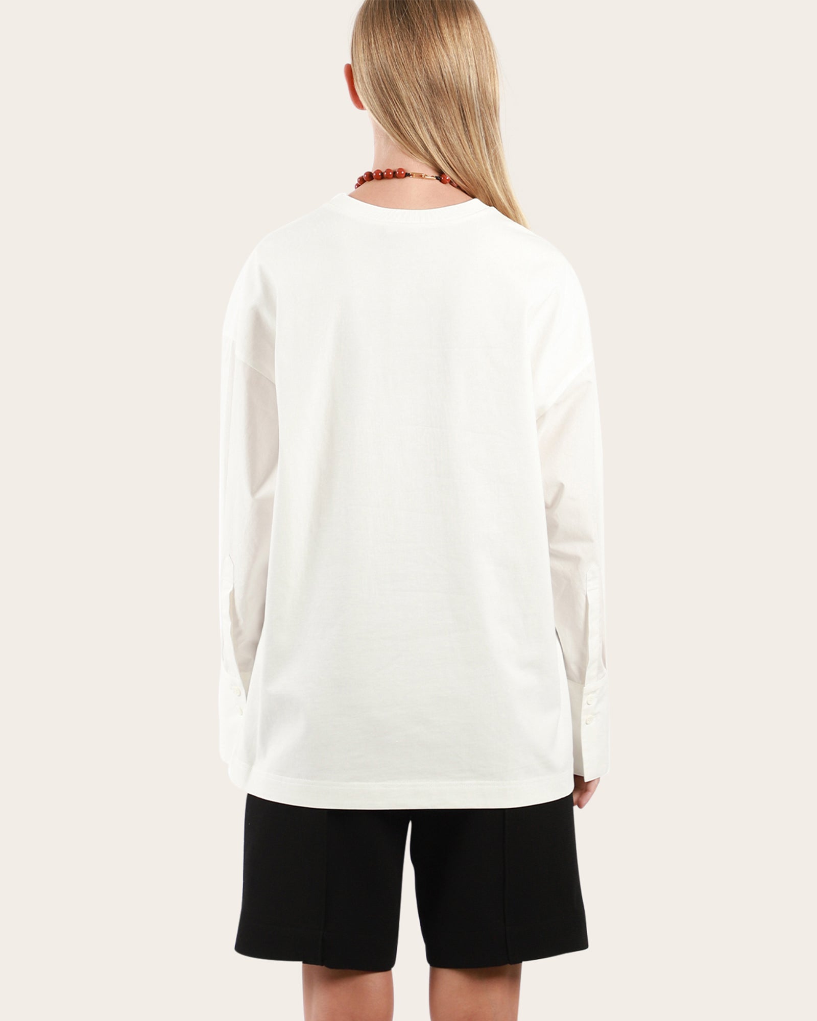 The Baker Shirt blends casual and tailored elements with a contrast design—featuring a jersey knit T-shirt style body paired with elongated cotton poplin sleeves, finished with classic buttoned cuffs for an elevated touch.