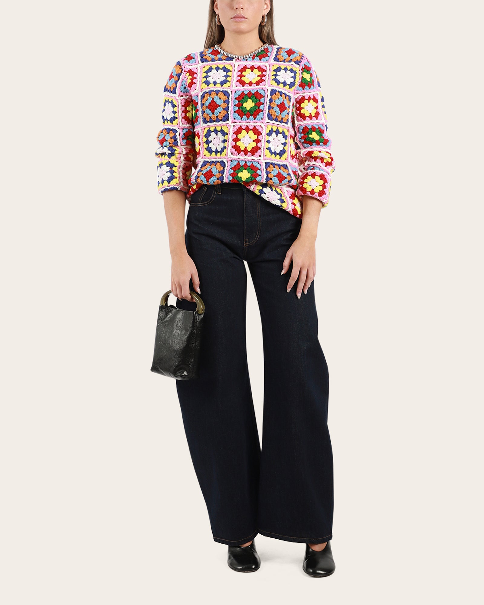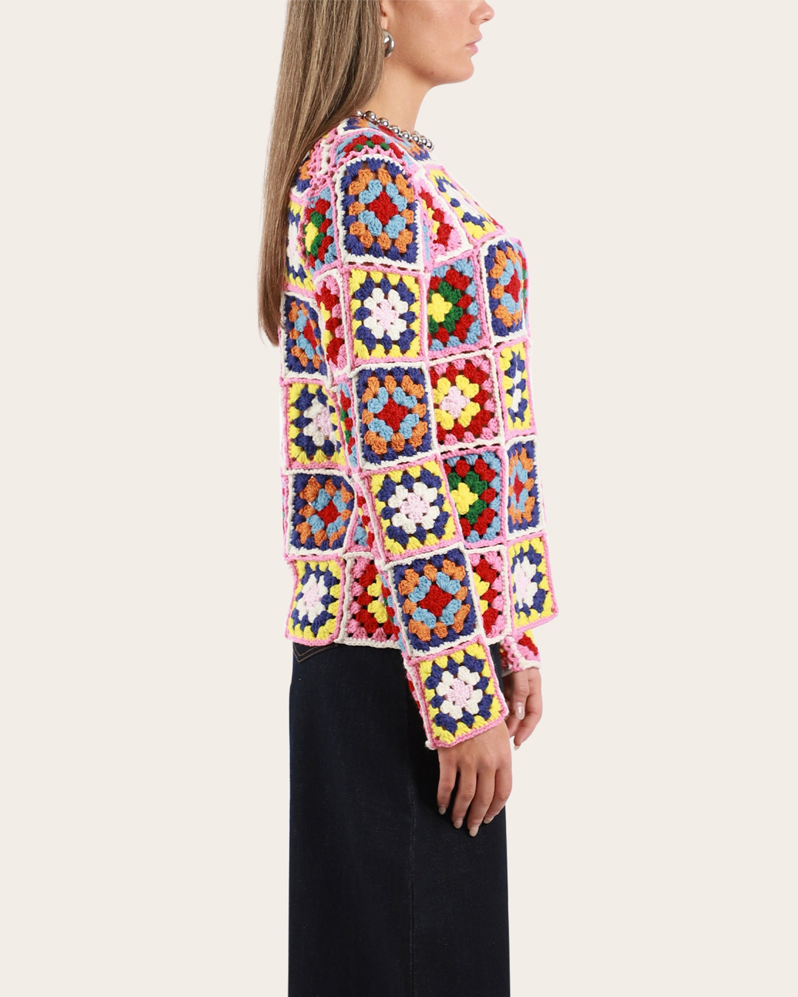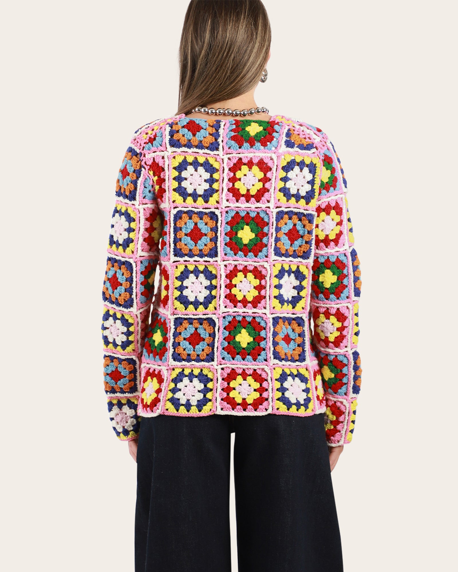 • A thick knit crochet tiles sweater, featuring a round neckline, long sleeves with a fitted silhouette.