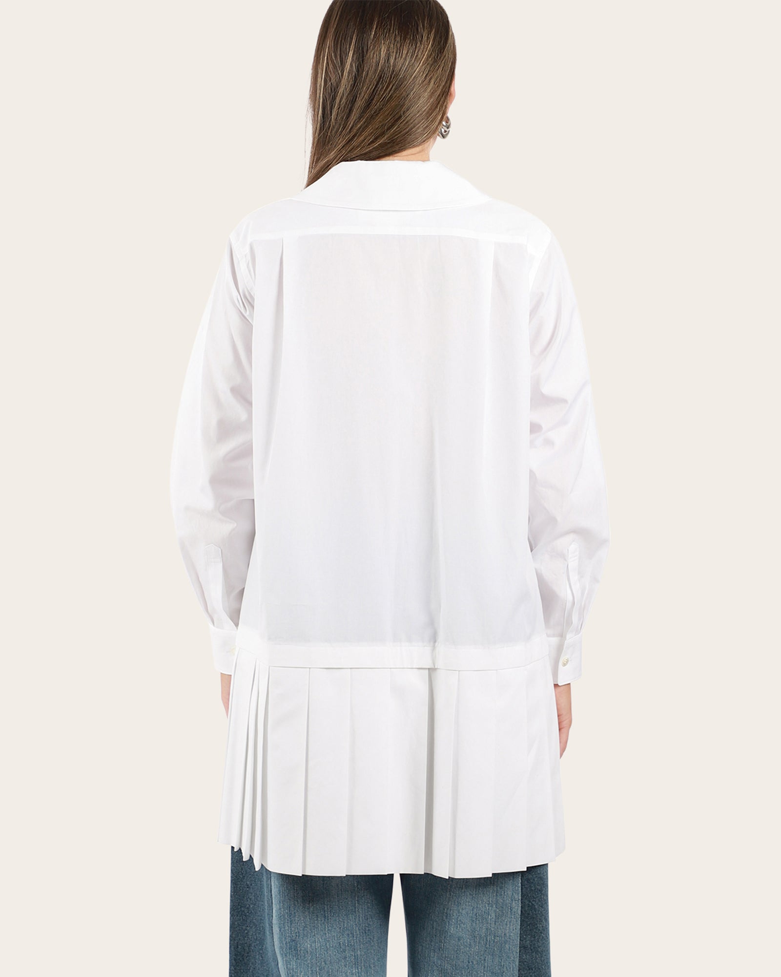Your classic shirt, with a slight twist. This shirt features, a round collar, buttons at front to close, long sleeves with buttons at cuff, chest pocket, and a pleating detail at hem giving volume and shape to the garment. Made in Japan.