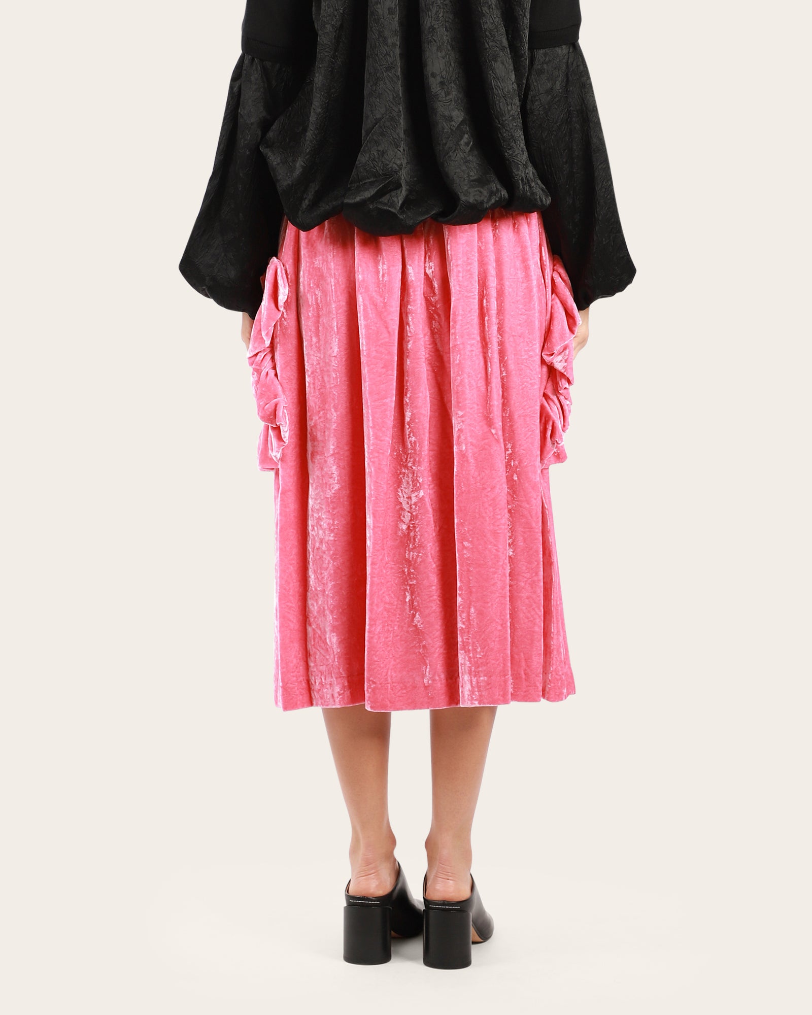 A velvet skirt, in a midi length style, featuring large side pockets with ruffle detail, elasticated waistline with a drawstring to adjust. Made in Japan.