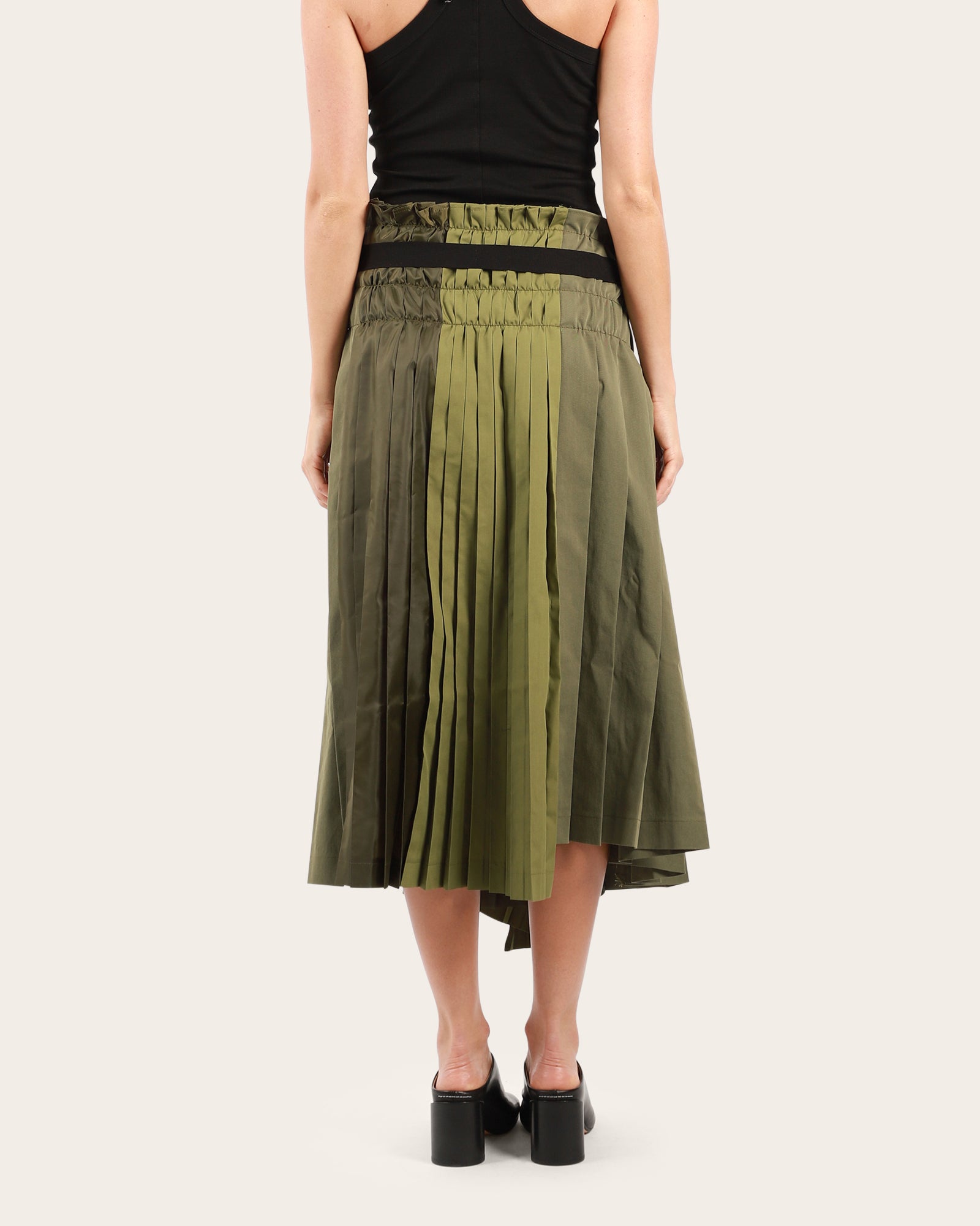 A midi length skirt, featuring pleats all over with an asymmetric silhouette, different tones of green on different fabrics. A detachable belt tied around hip line. Made in Japan.
