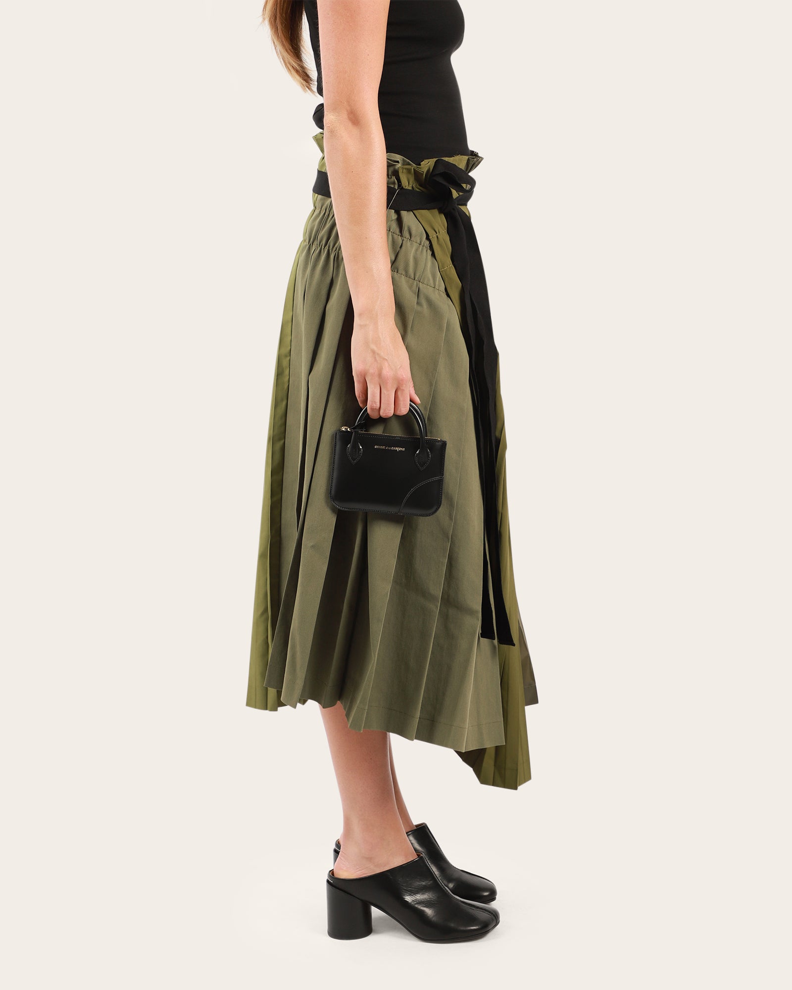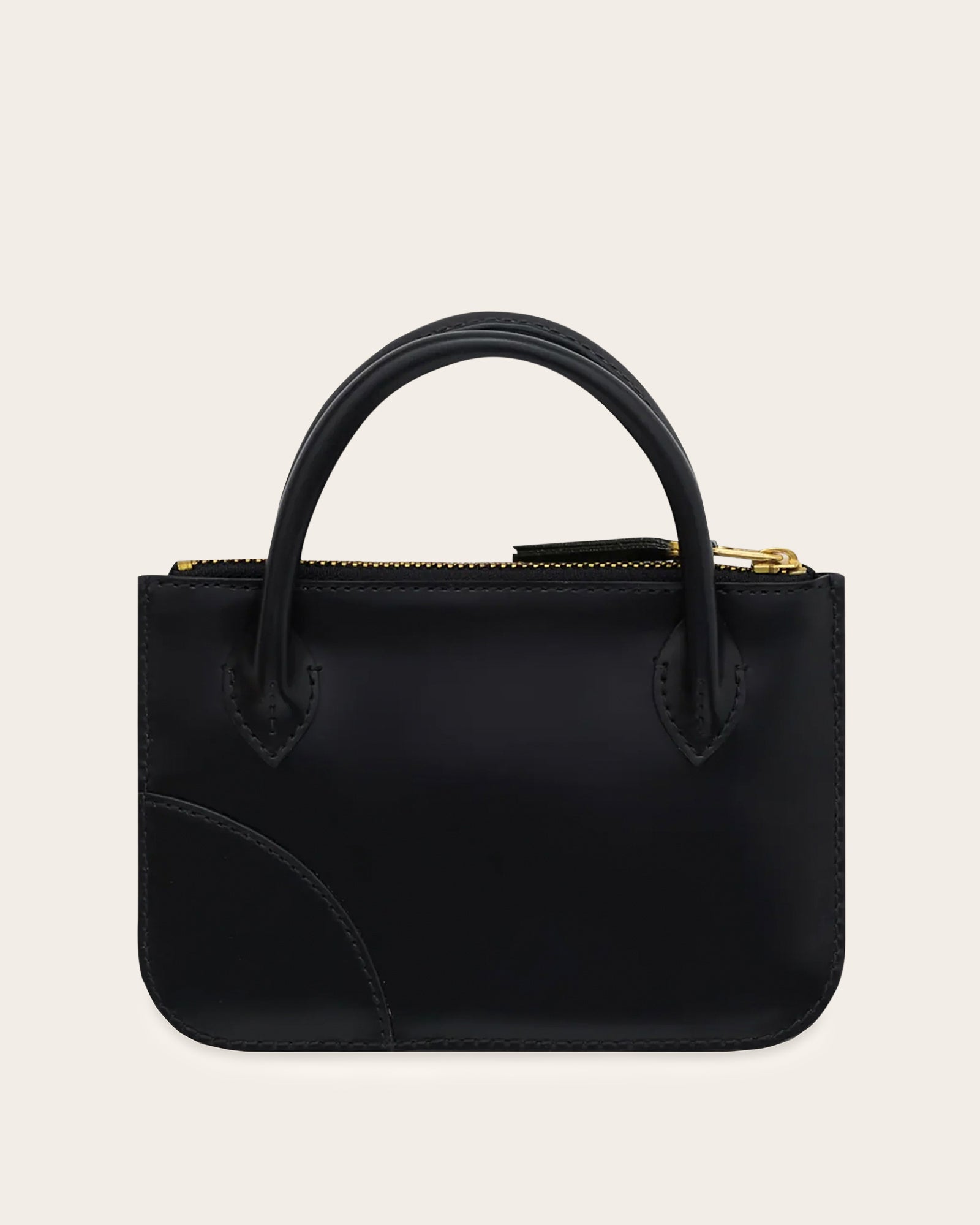 A compact, small-size pouch crafted from smooth black leather. Designed with a top zip closure and finished with gold hardware for an elevated look. The exterior features a subtle gold COMME des GARÇONS logo, adding a refined signature touch. Comes with convenient handles for easy carrying. Made in Spain.