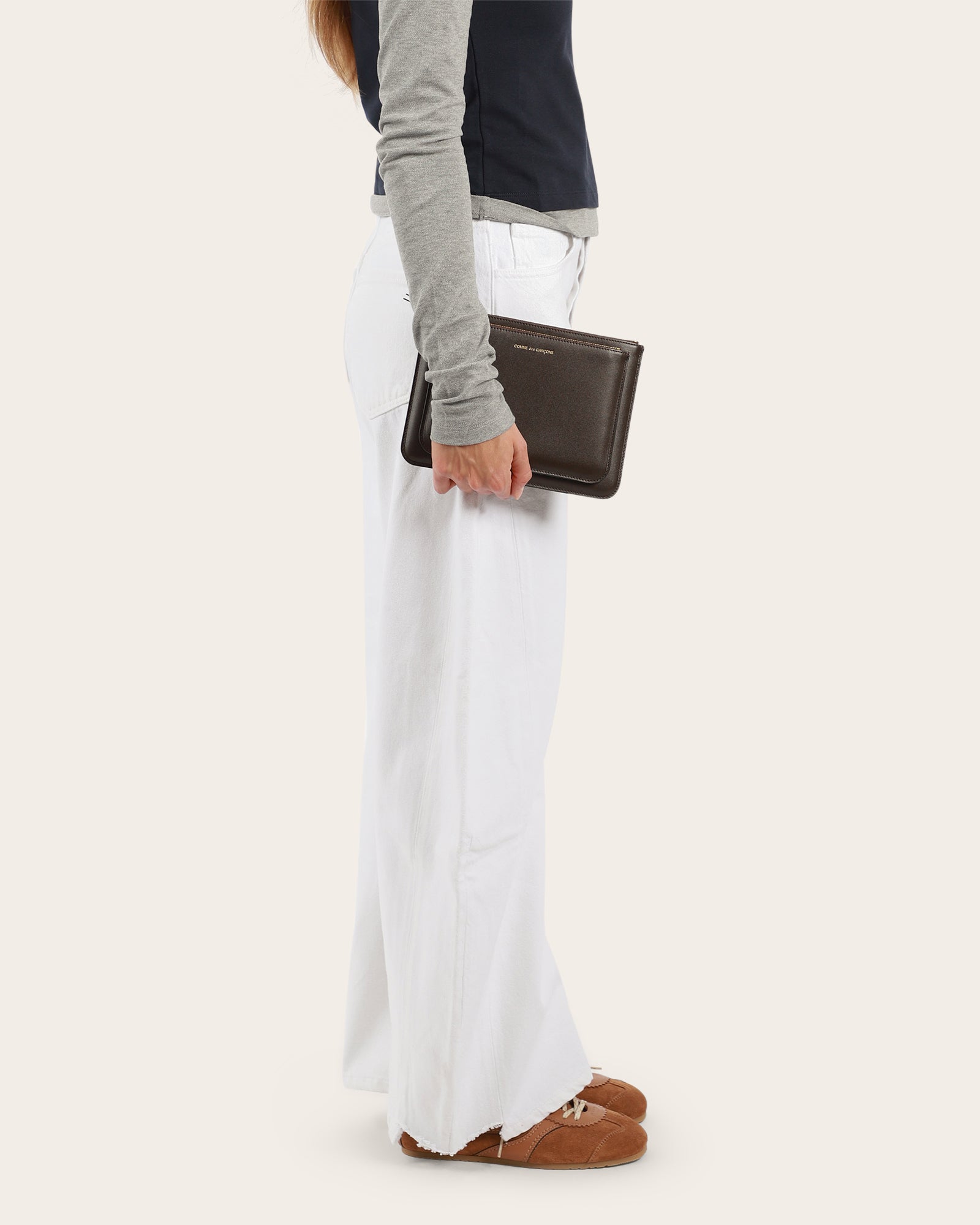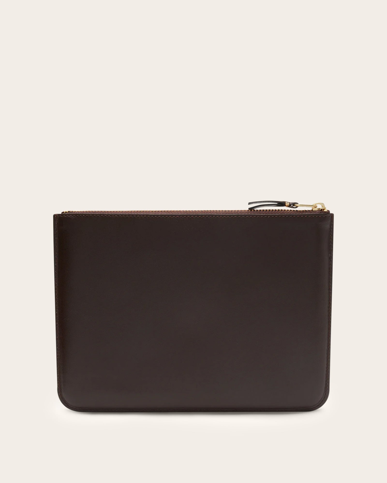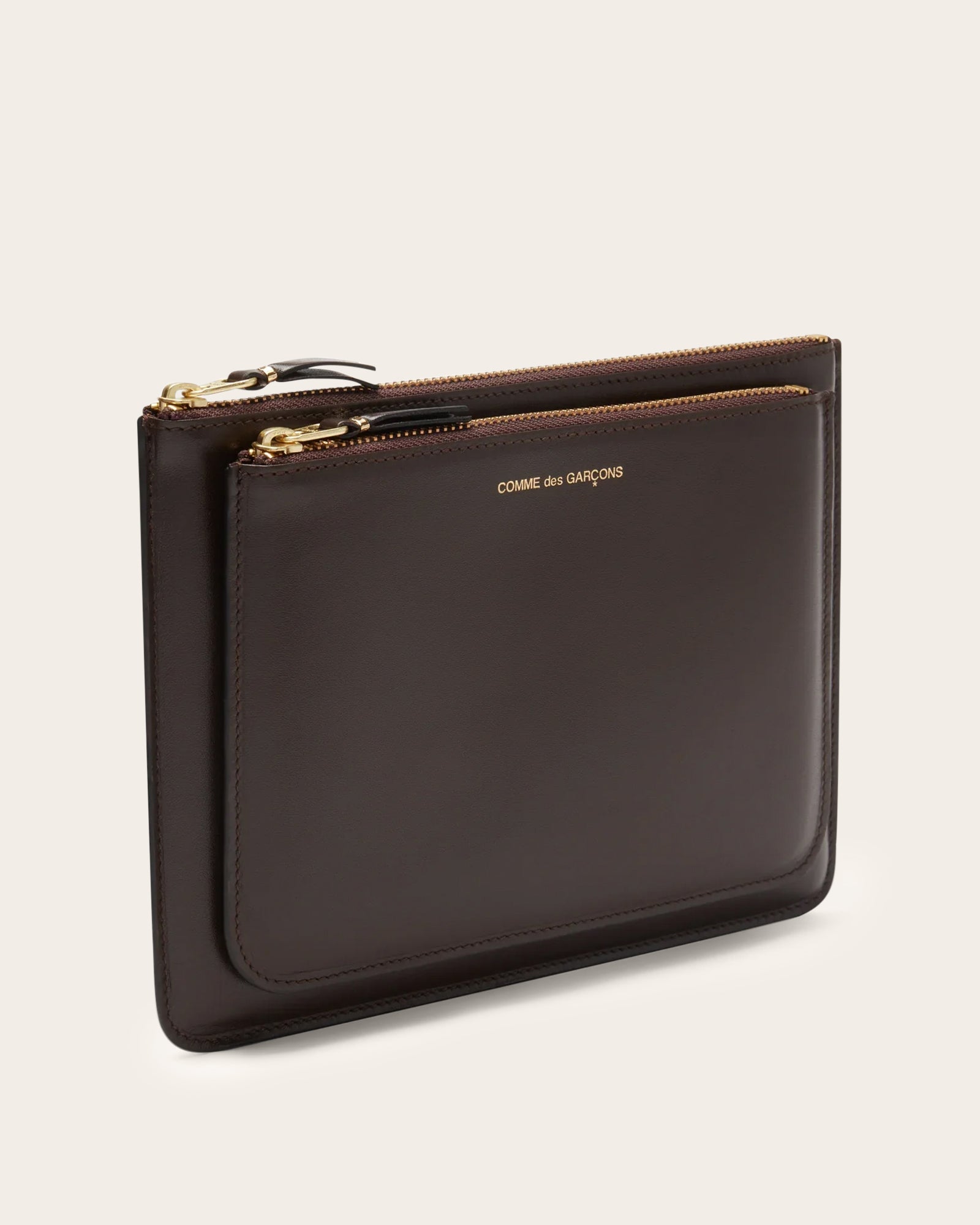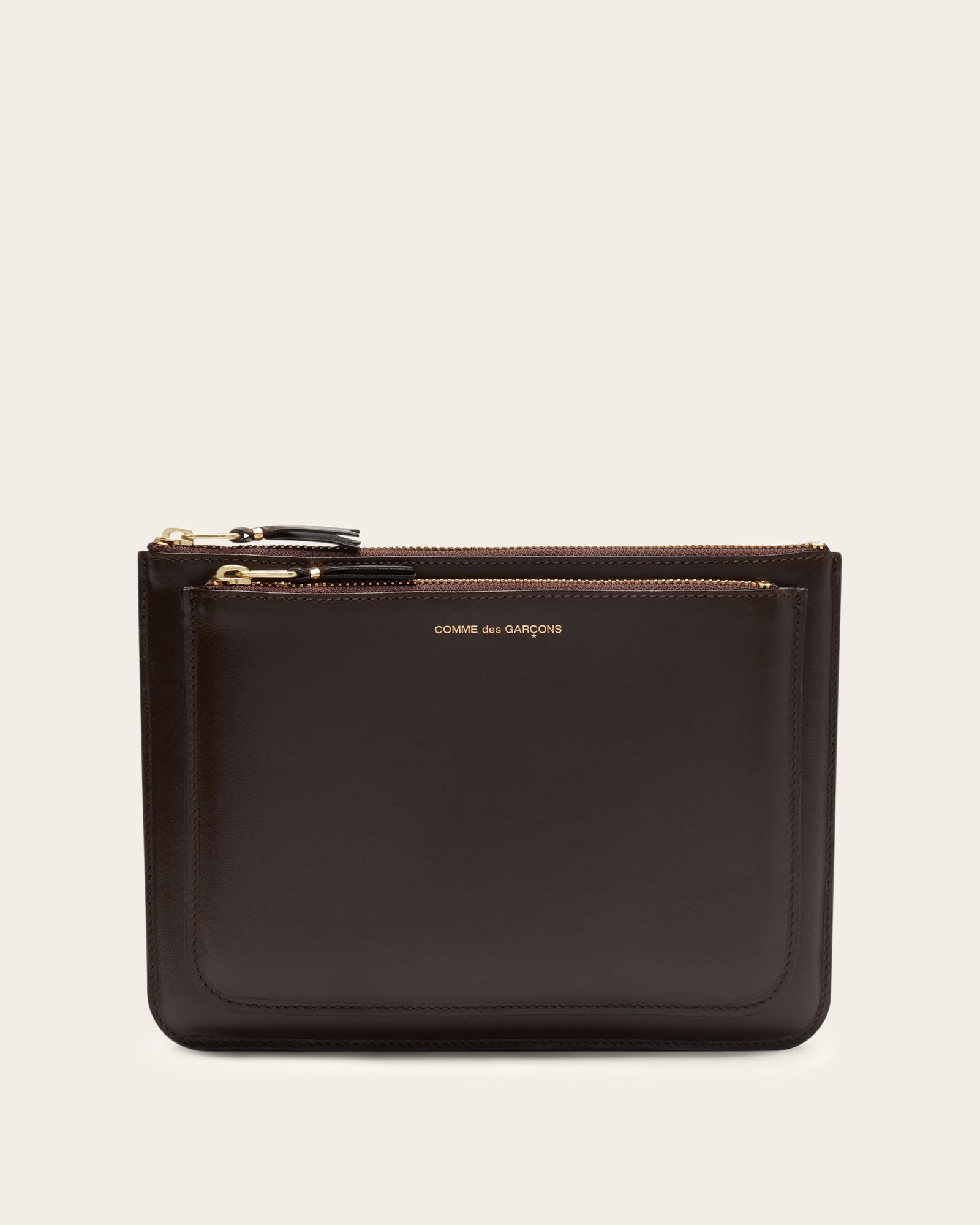 A large, structured pouch crafted from rich brown leather. Features a top zip closure and an additional external zip pocket for extra storage. Finished with gold hardware and a subtle gold COMME des GARÇONS logo on the exterior, adding a refined touch to this functional design. Made in Spain.