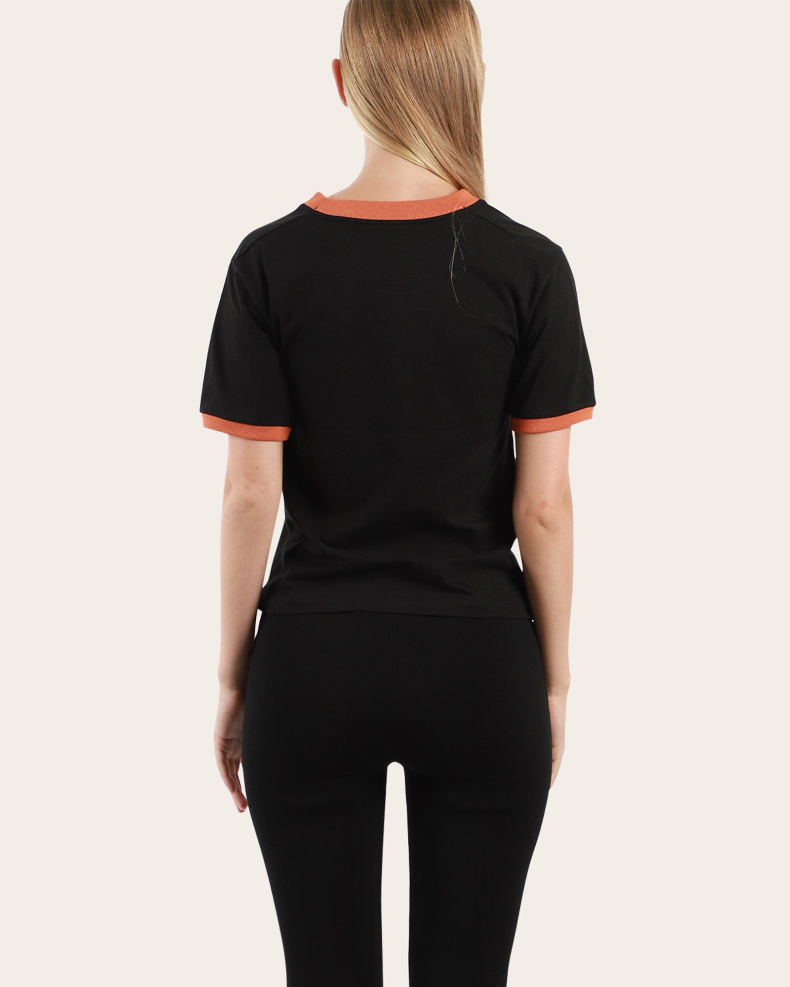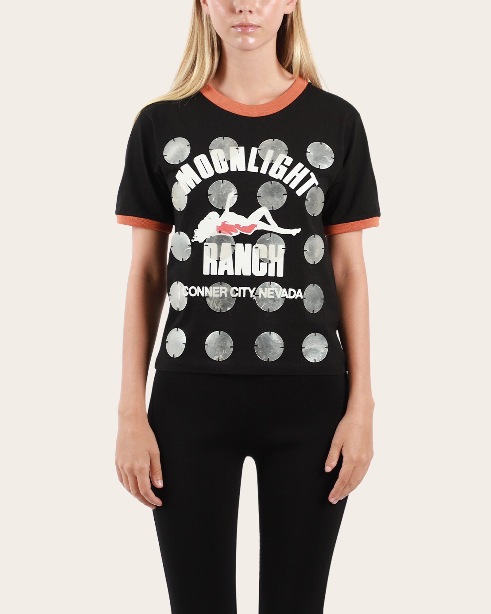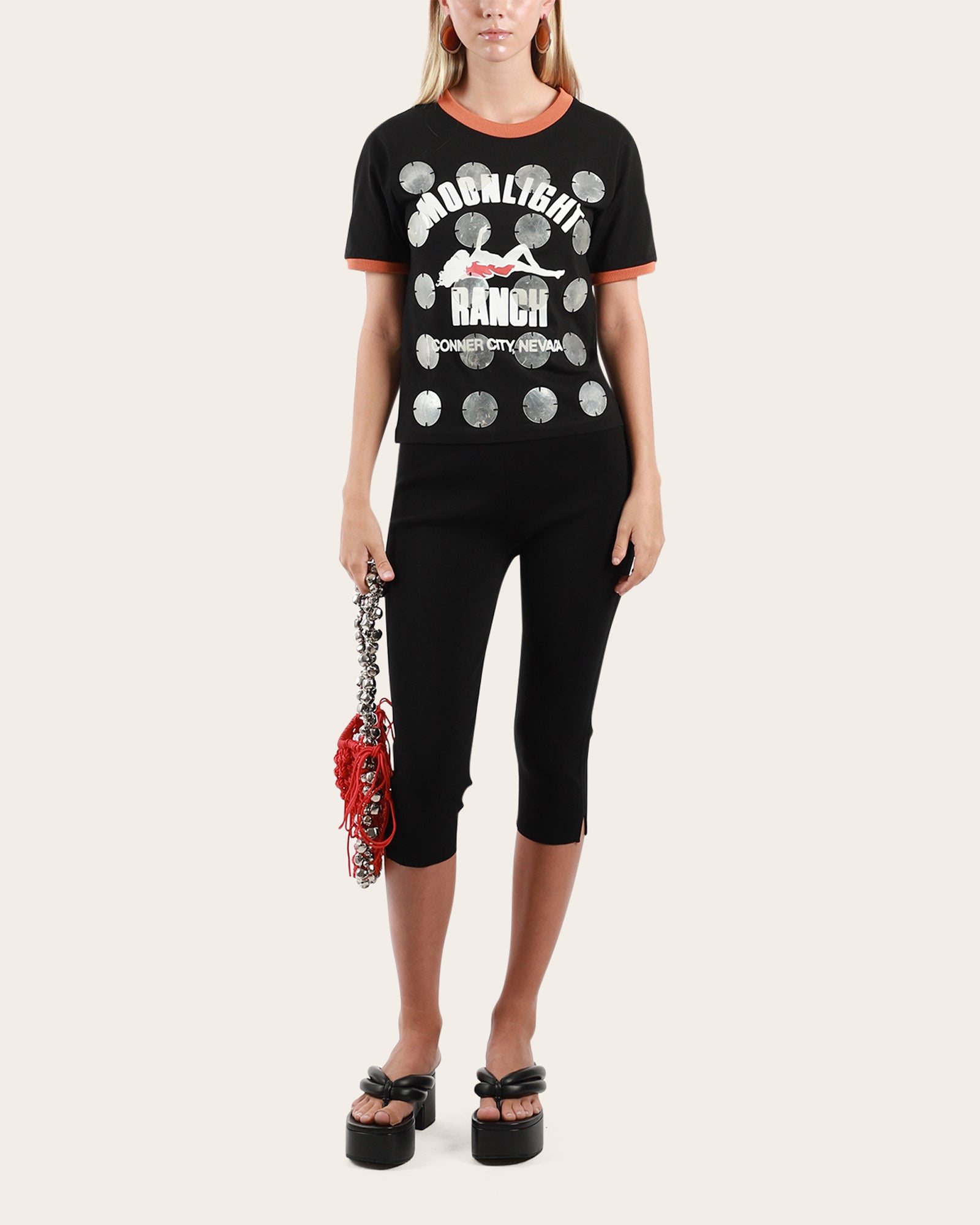 Crafted from soft black jersey, this statement tee features hand-embroidered shell discs layered over a screen print design. Each piece is unique, blending artisanal detail with modern edge. Made in Portugal.
