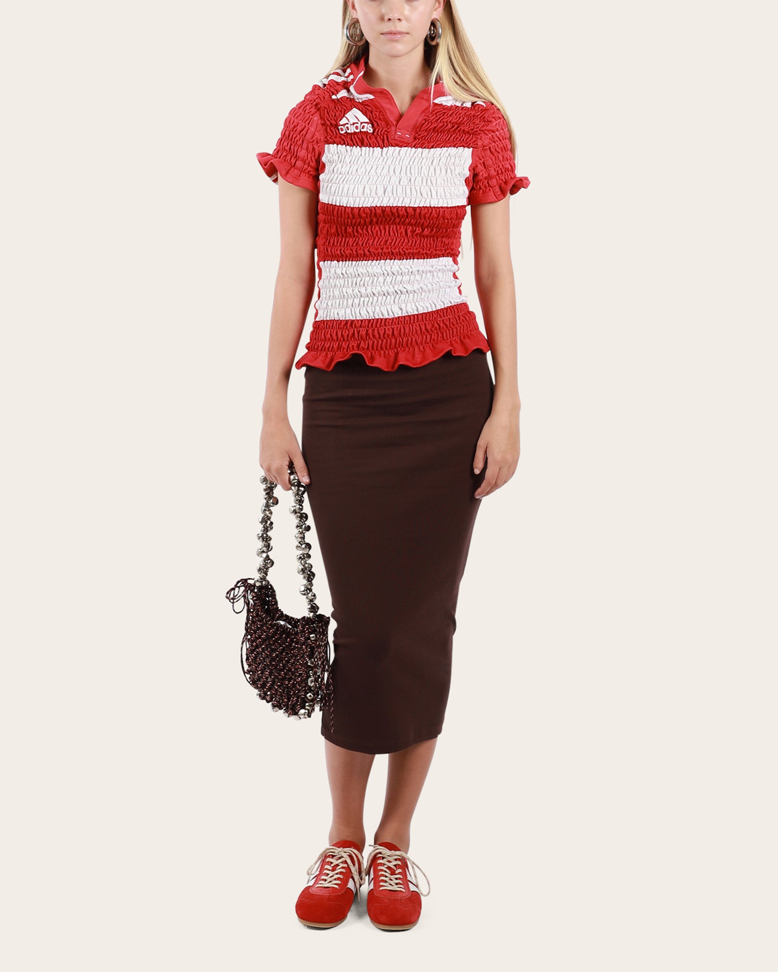 The Reconstituted Shirred Football Top is made from vintage short-sleeve football jerseys sourced across the UK and carefully selected by the CI Studio team. Each jersey is deconstructed and stitched with elastic thread to create the signature shirred baby tee style. A long-time favourite, this unique piece blends expert craftsmanship with authentic materials for a truly one-of-a-kind look.
