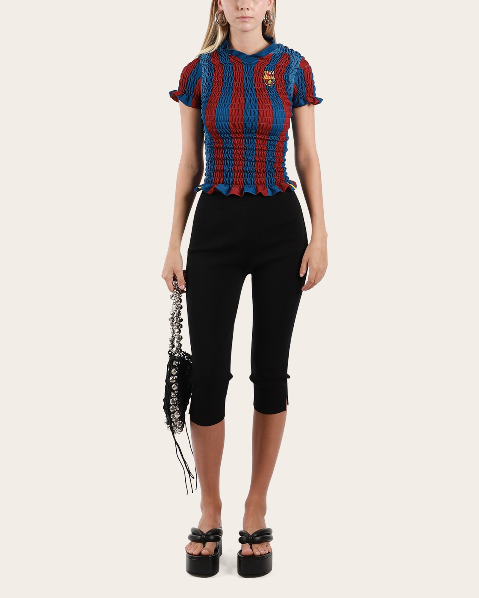 The Reconstituted Shirred Football Top is made from vintage short-sleeve football jerseys sourced across the UK and carefully selected by the CI Studio team. Each jersey is deconstructed and stitched with elastic thread to create the signature shirred baby tee style. A long-time favourite, this unique piece blends expert craftsmanship with authentic materials for a truly one-of-a-kind look.