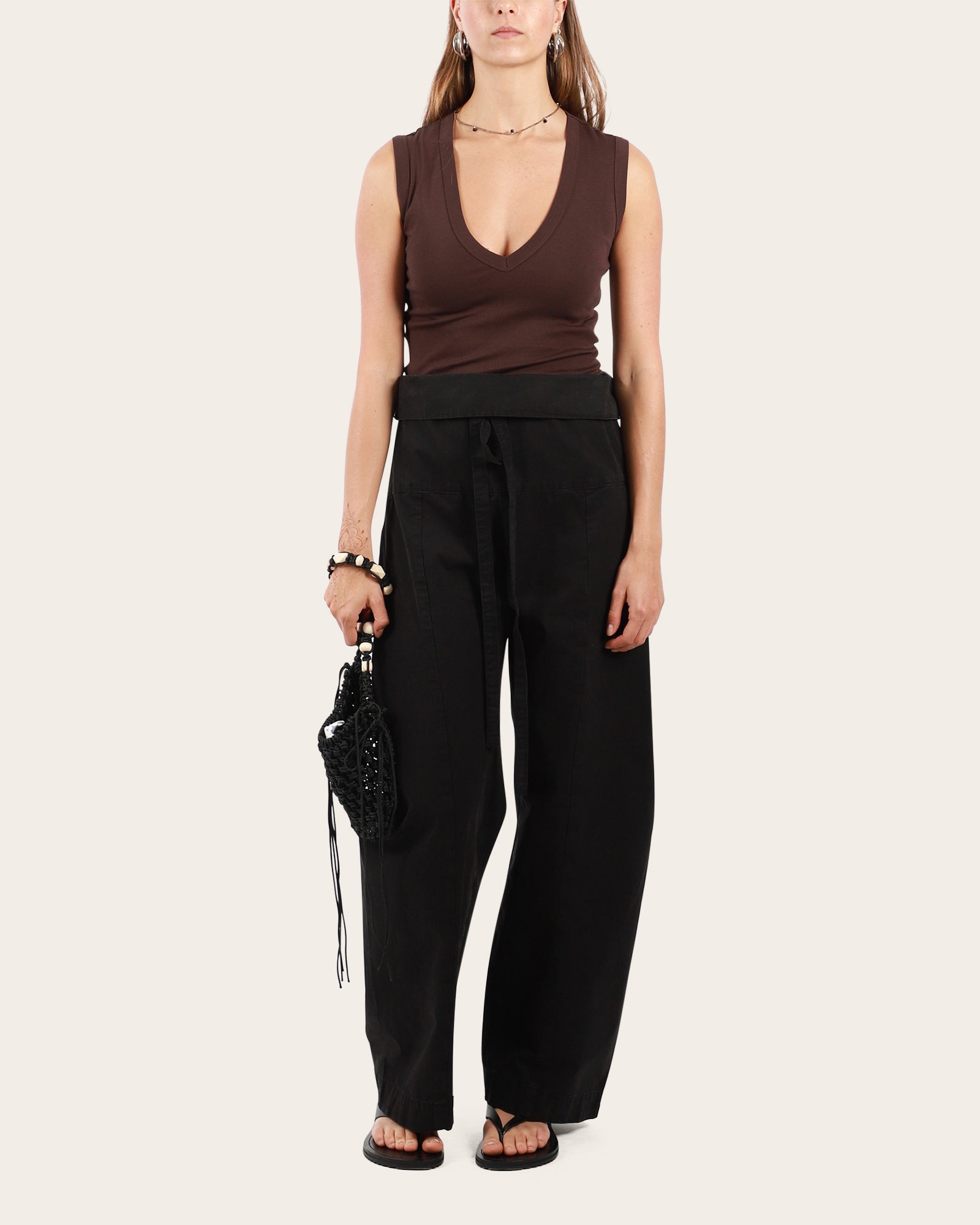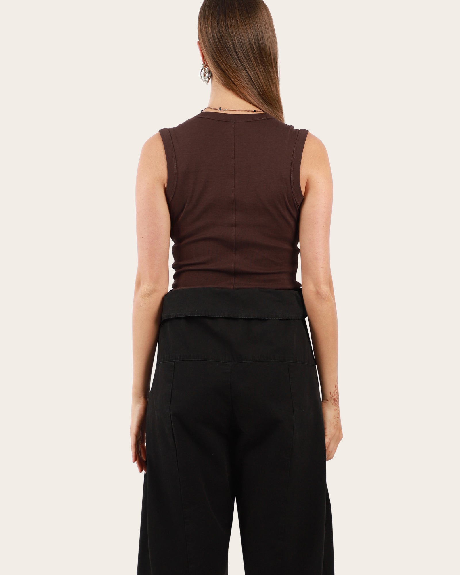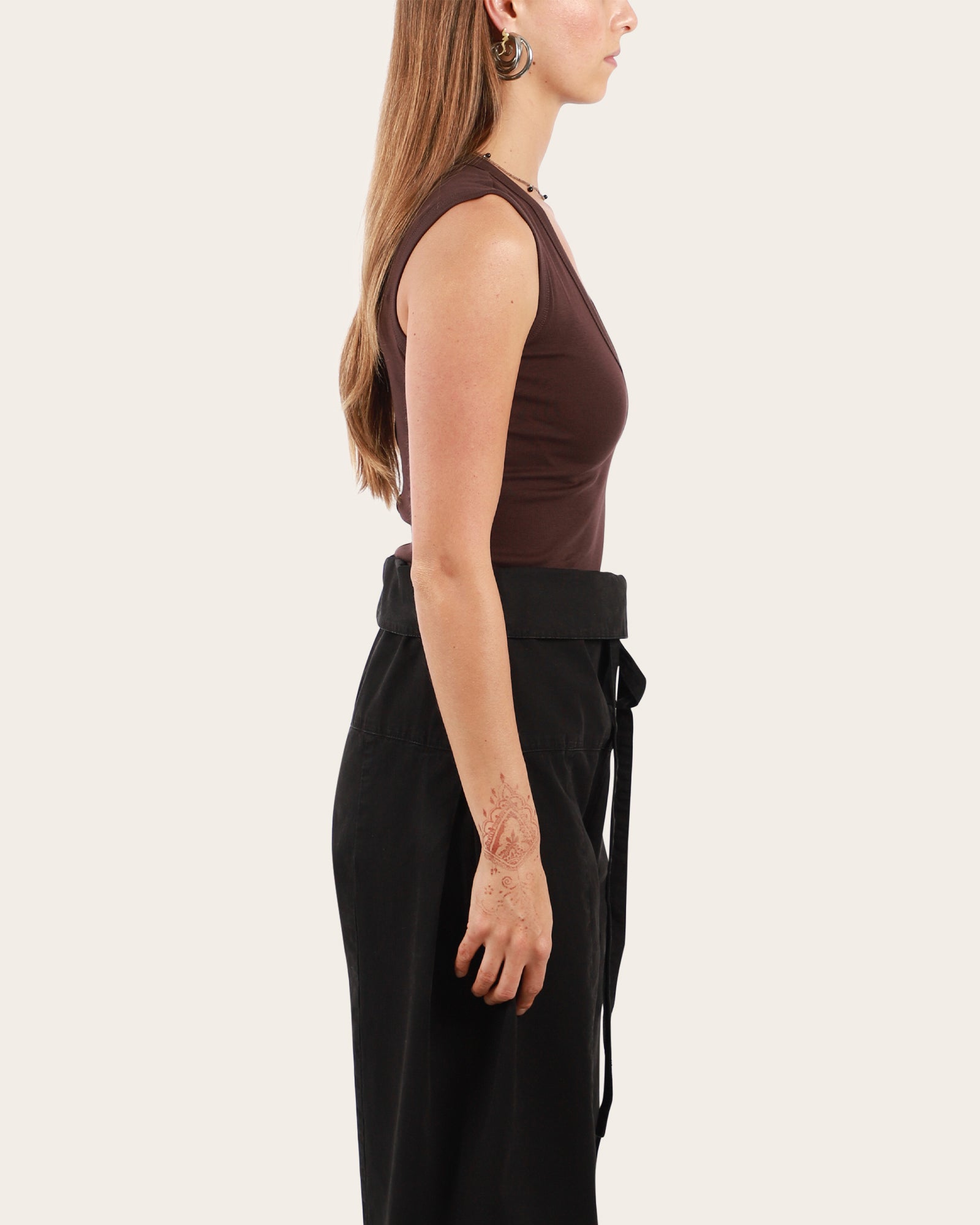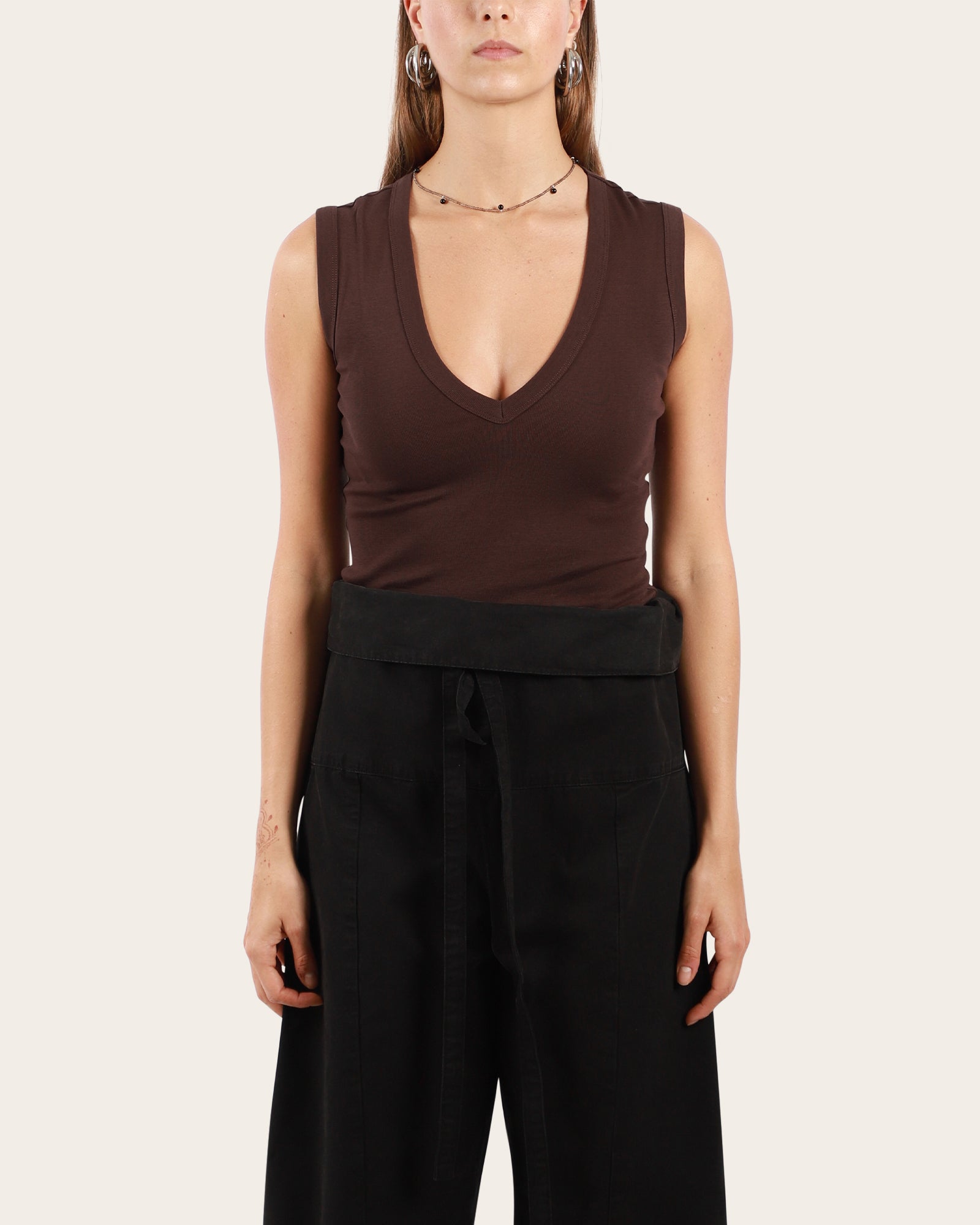 This deep V-neck tank features a refined, modern cut with scooped armholes and a flattering fit. Made from medium-weight organic cotton, it’s designed to layer seamlessly — perfect with a skirt or tailored trousers.